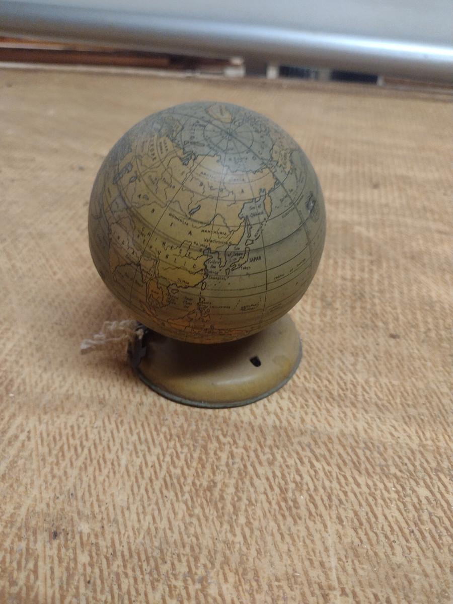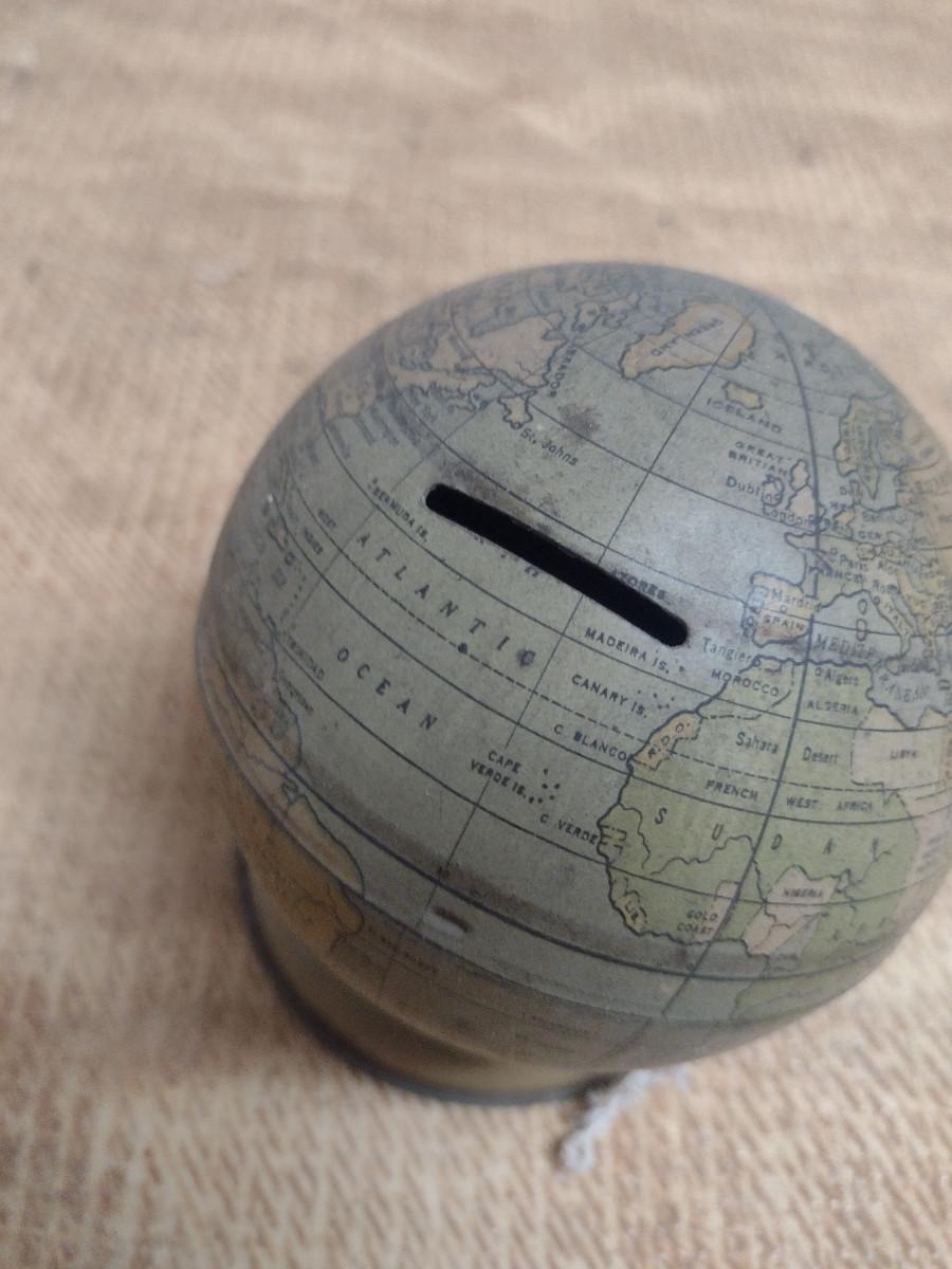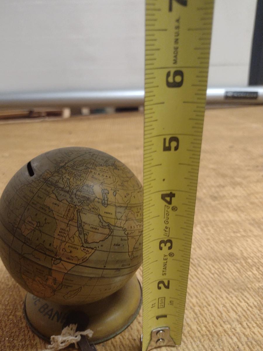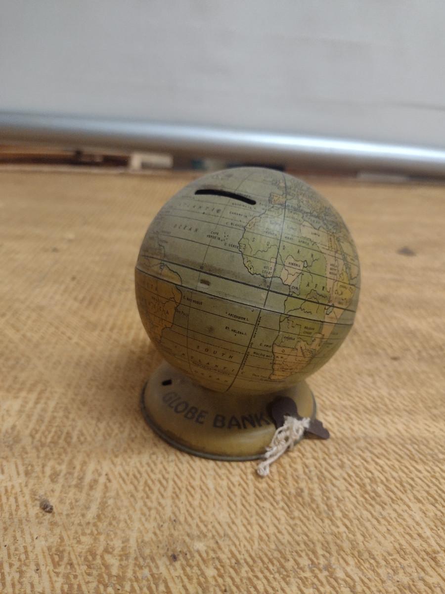 Vintage Metal Globe Coin Bank with Key- Approx 4 1/2" Tall. Stored in non-climatized basement so expect item may need to be cleaned from dust, insects, etc. Shipped in as is condition