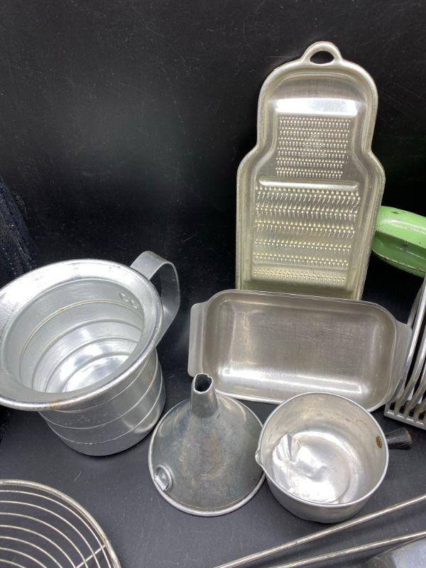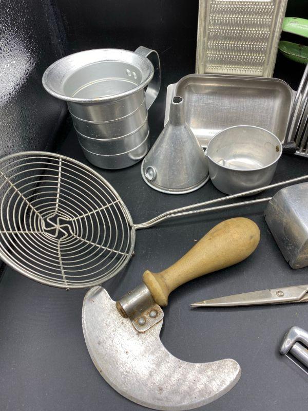 Huge lot of vintage metal kitchen gadgets. Everything photo'd included. Everything is in useable conditions, but display nicely also.