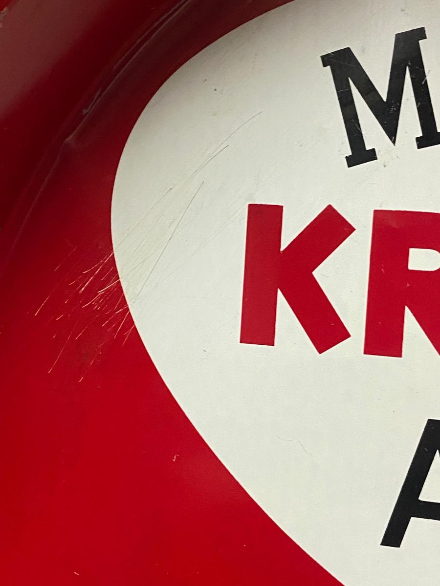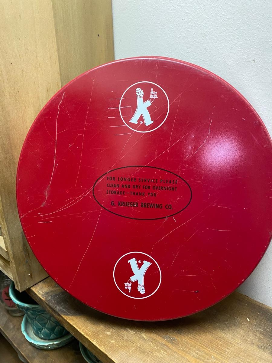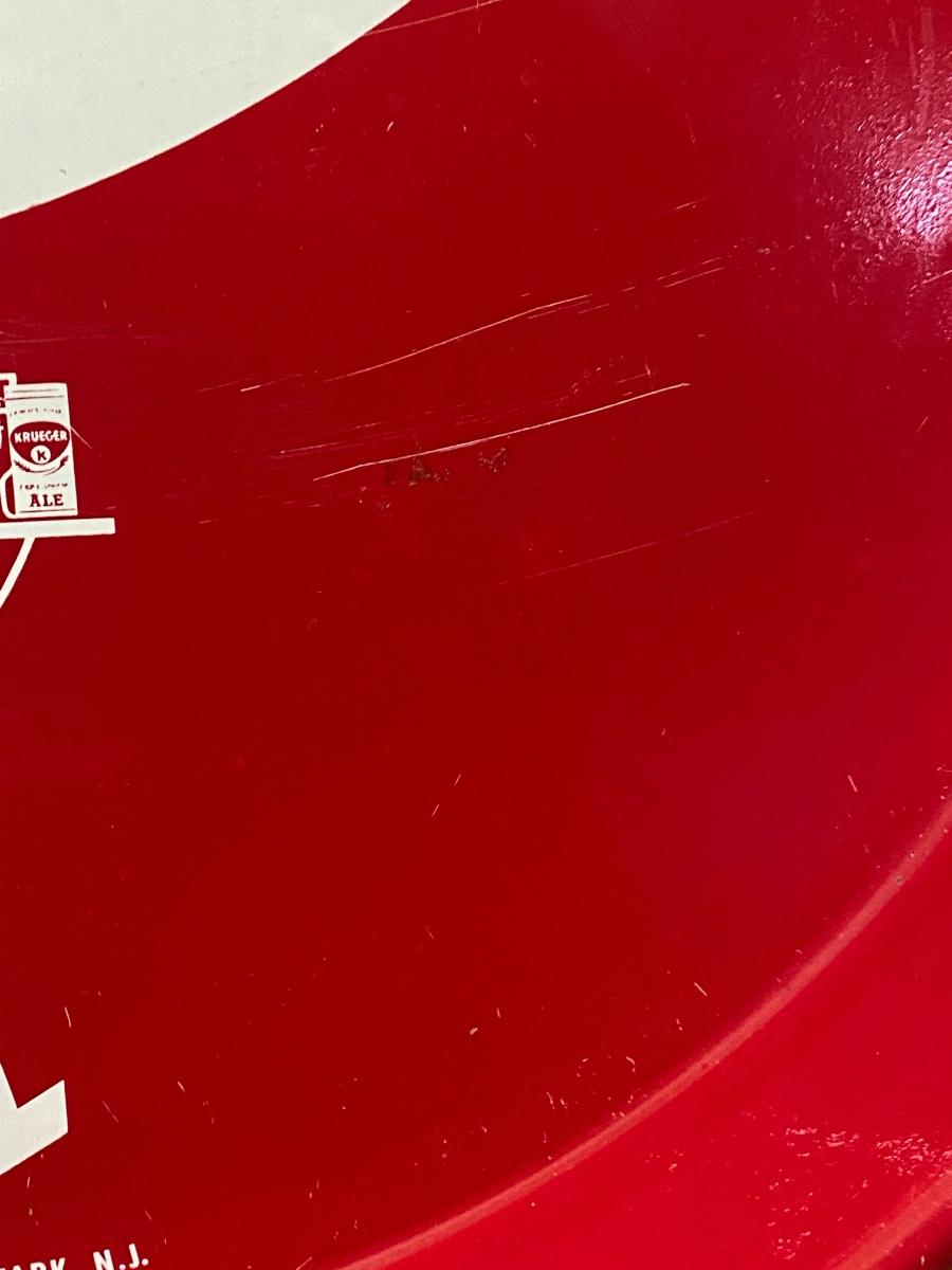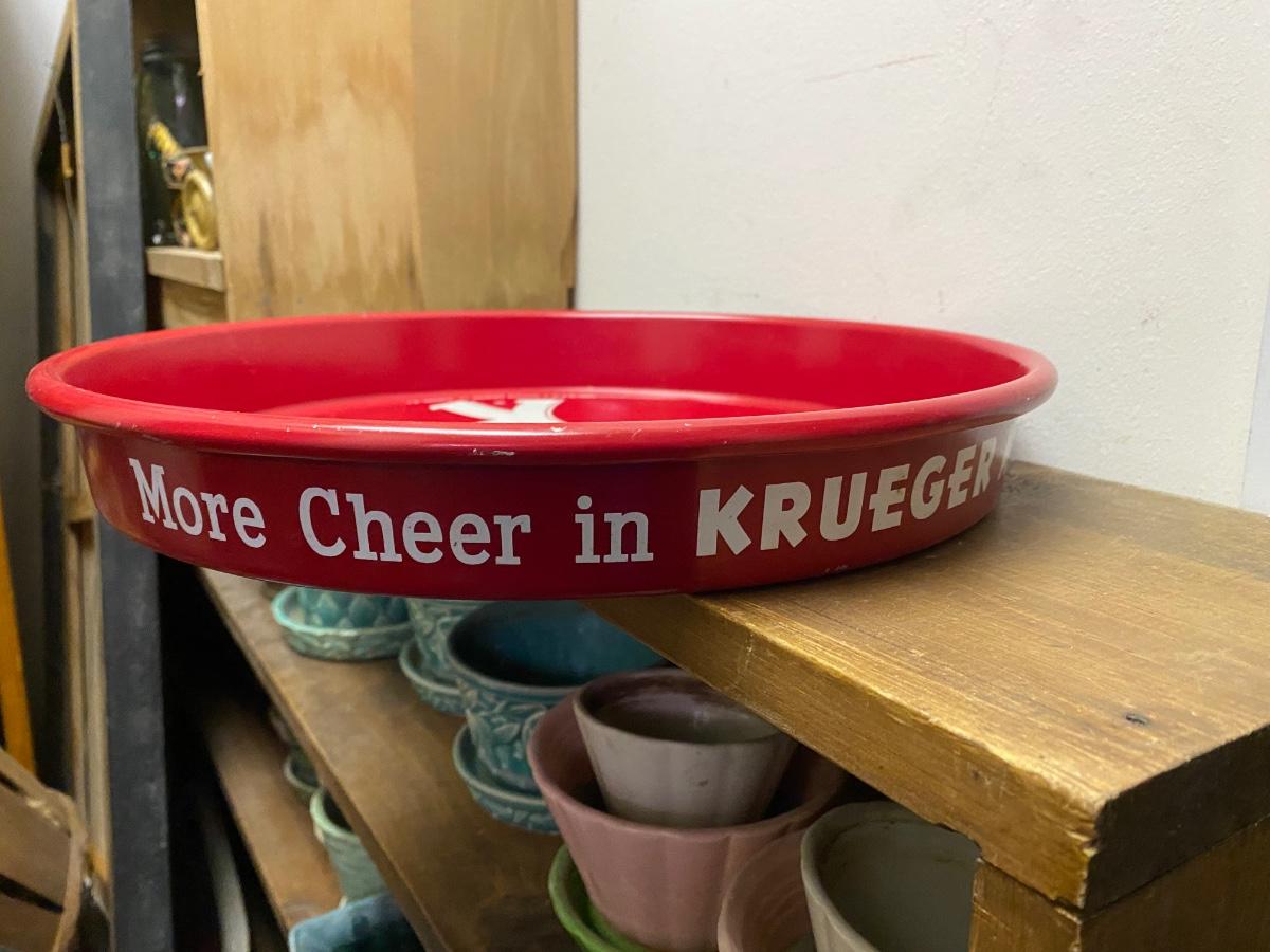 Vintage metal Krueger Ale-Beer serving tray. Has scratches on front and back. 13" diameter.