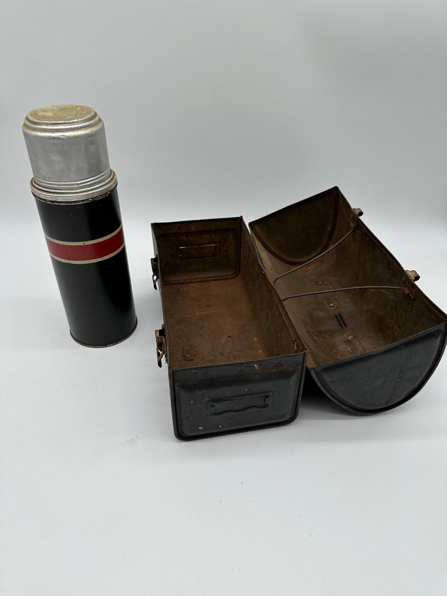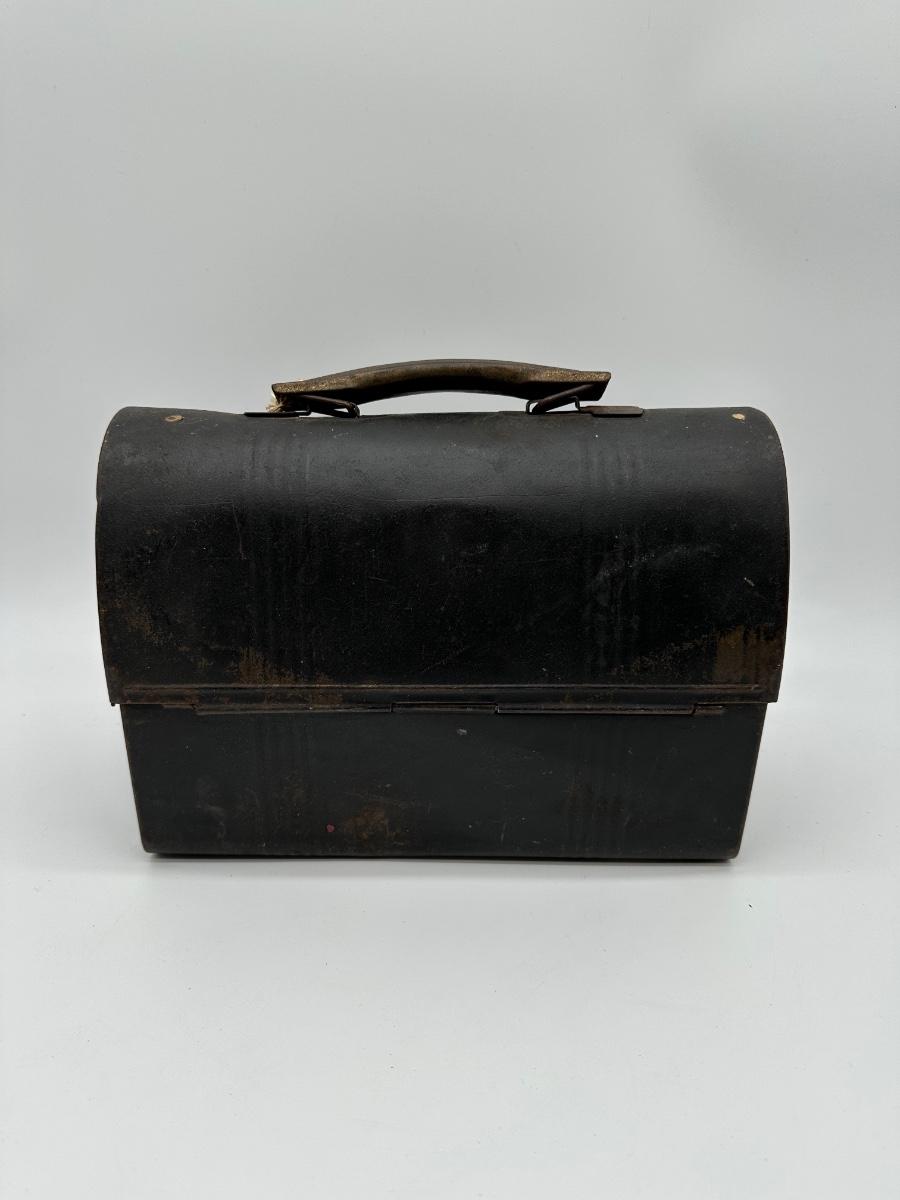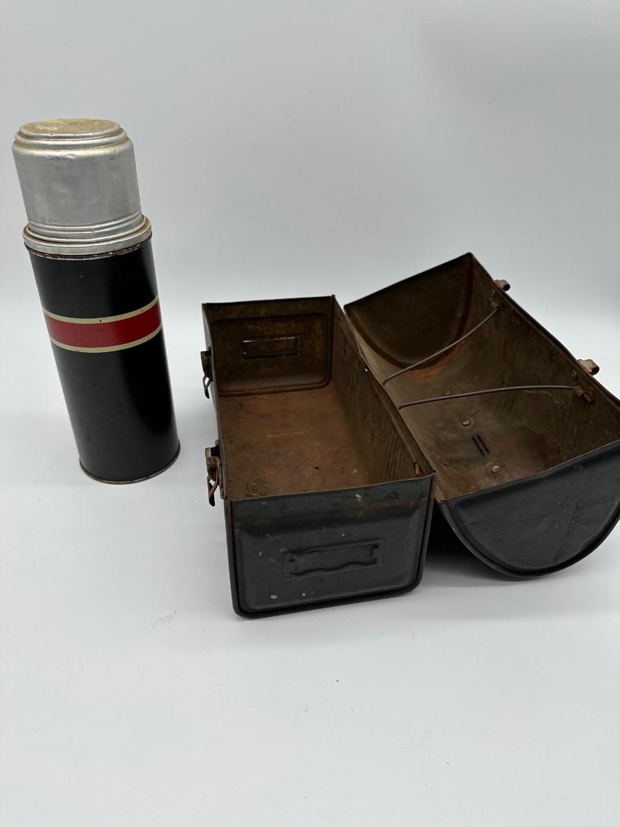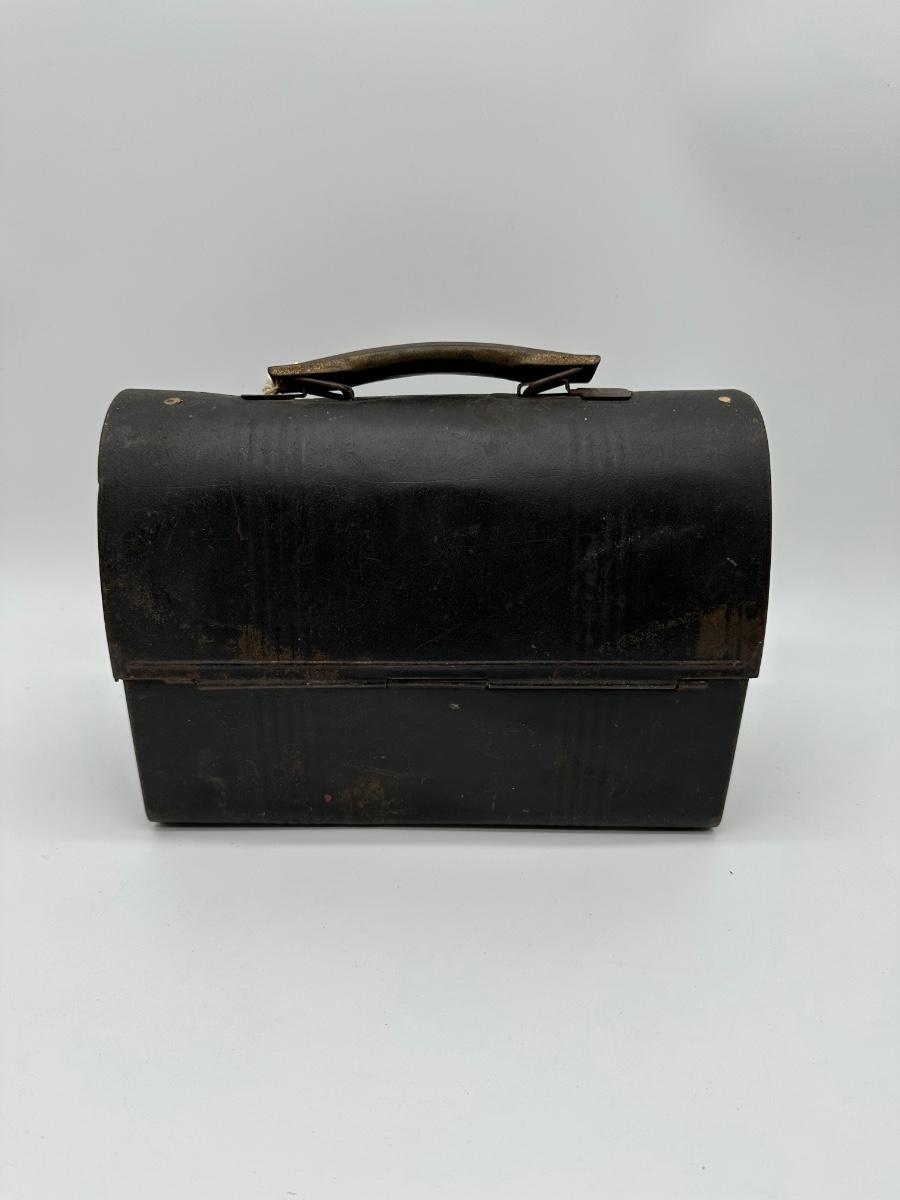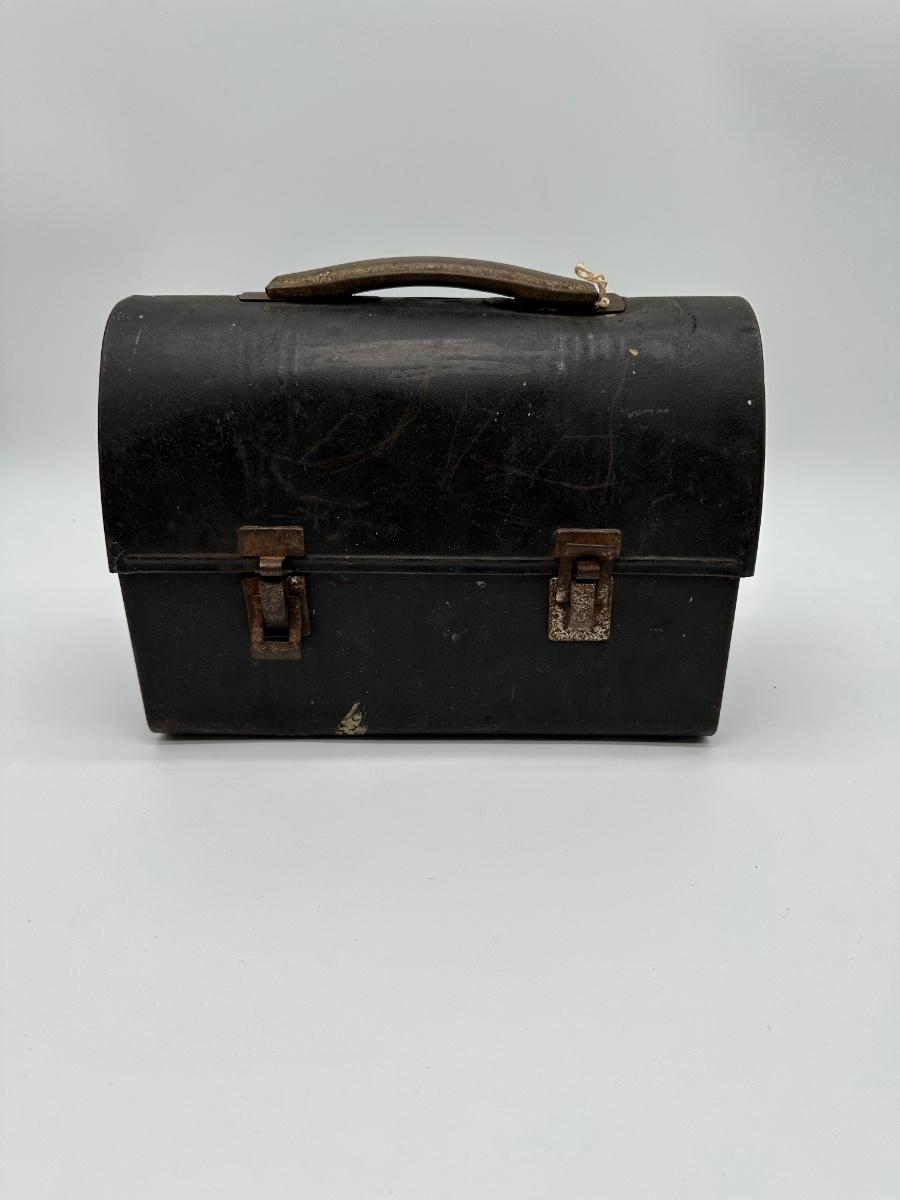 Vintage black metal lunch pail with hinged lid and dual front latches. Includes original matching metal thermos with cork stopper and cup. Classic industrial/workman style—great for collectors, décor, or display.
