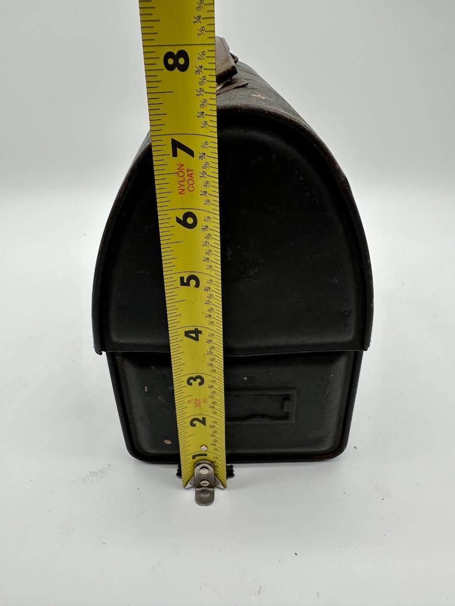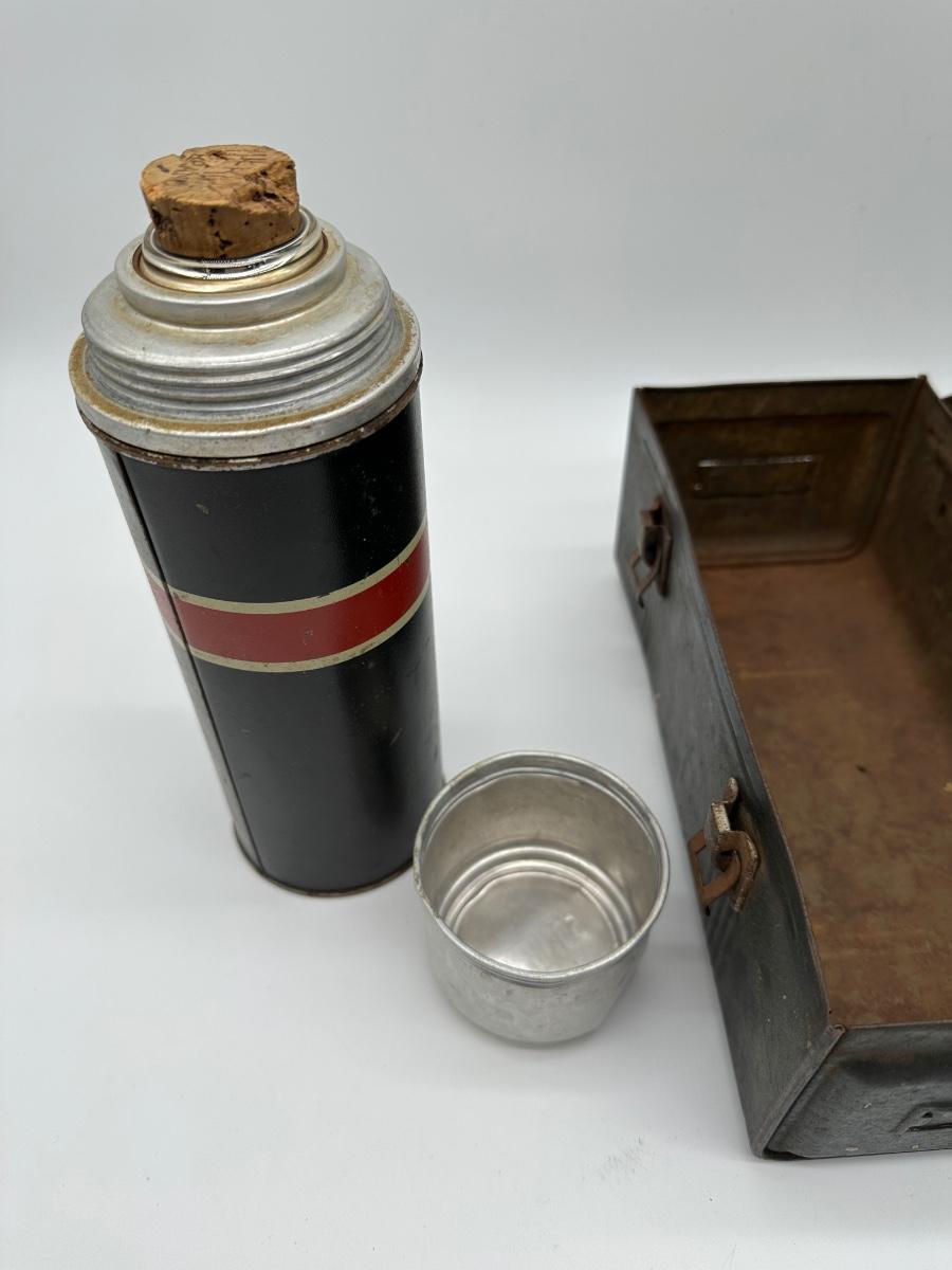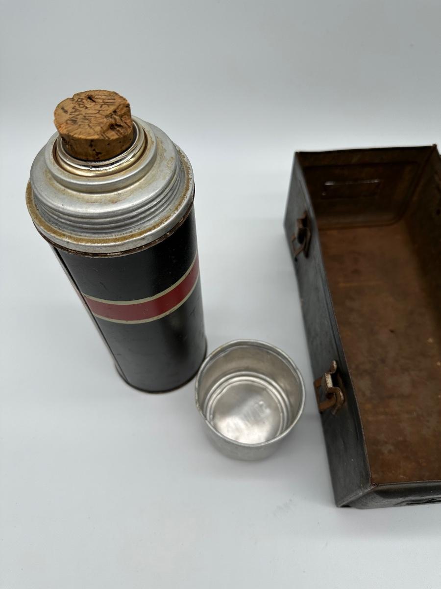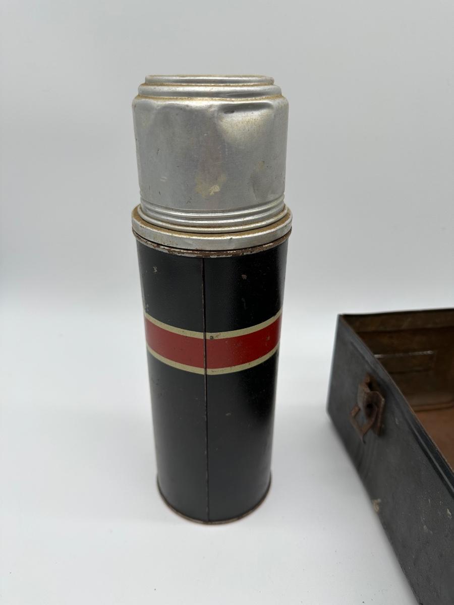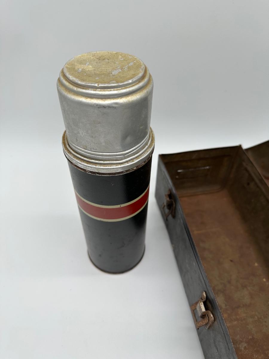 Vintage black metal lunch pail with hinged lid and dual front latches. Includes original matching metal thermos with cork stopper and cup. Classic industrial/workman style—great for collectors, décor, or display.