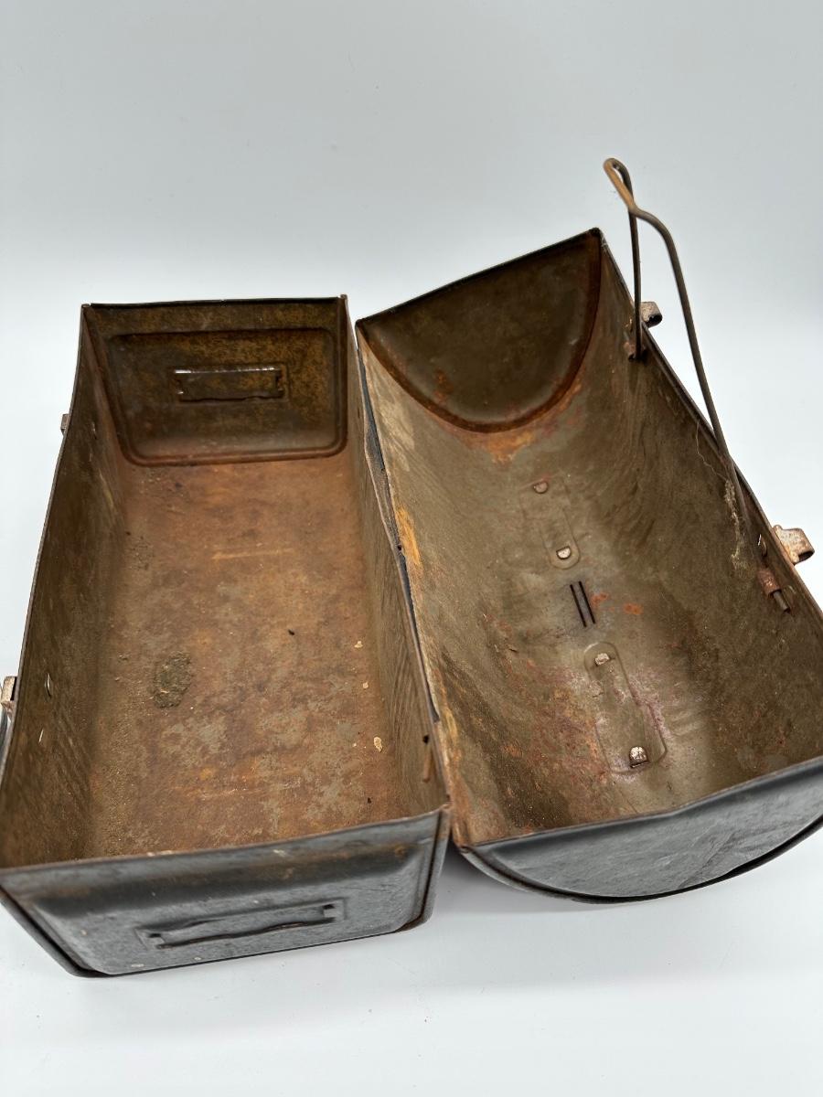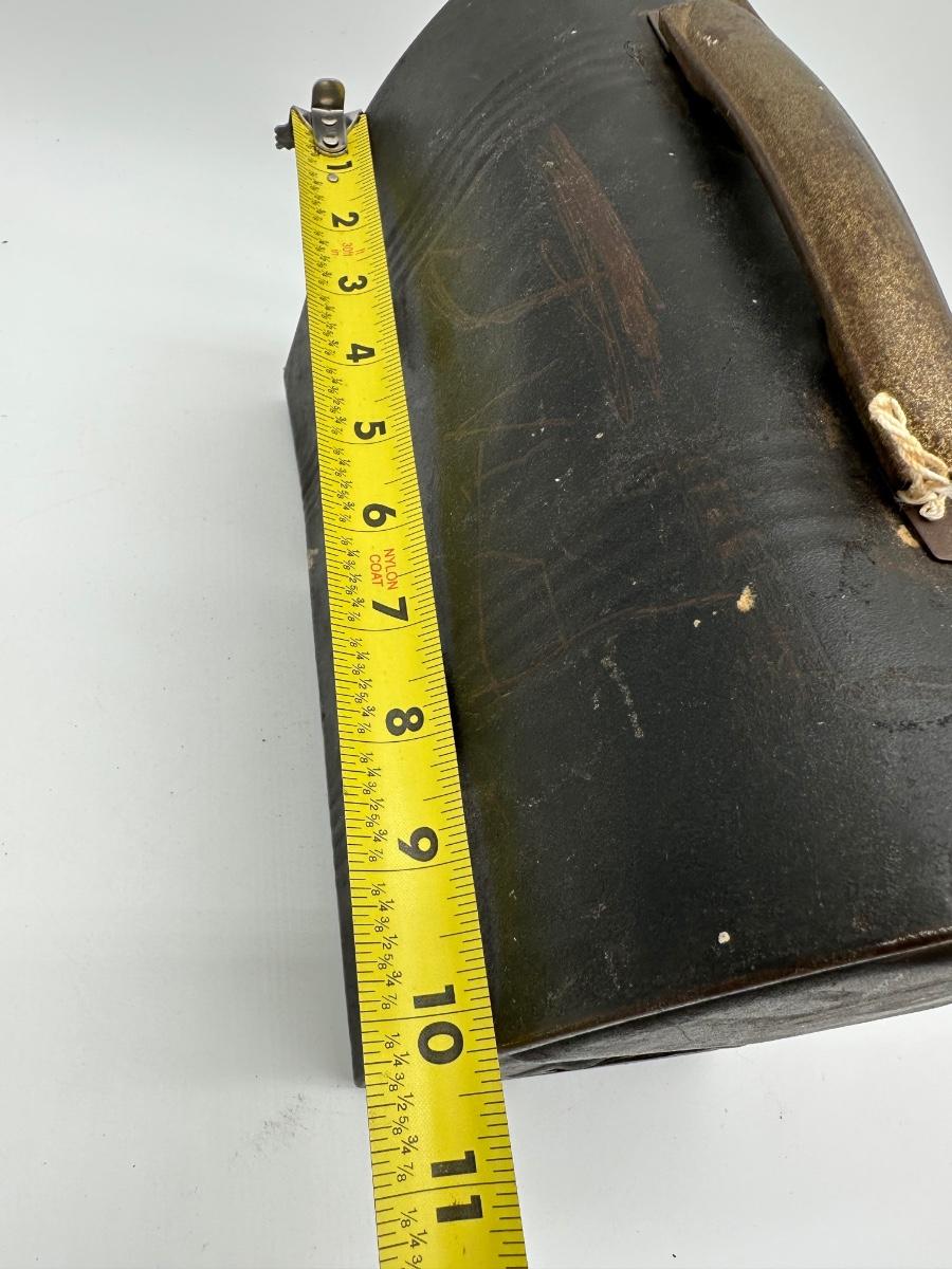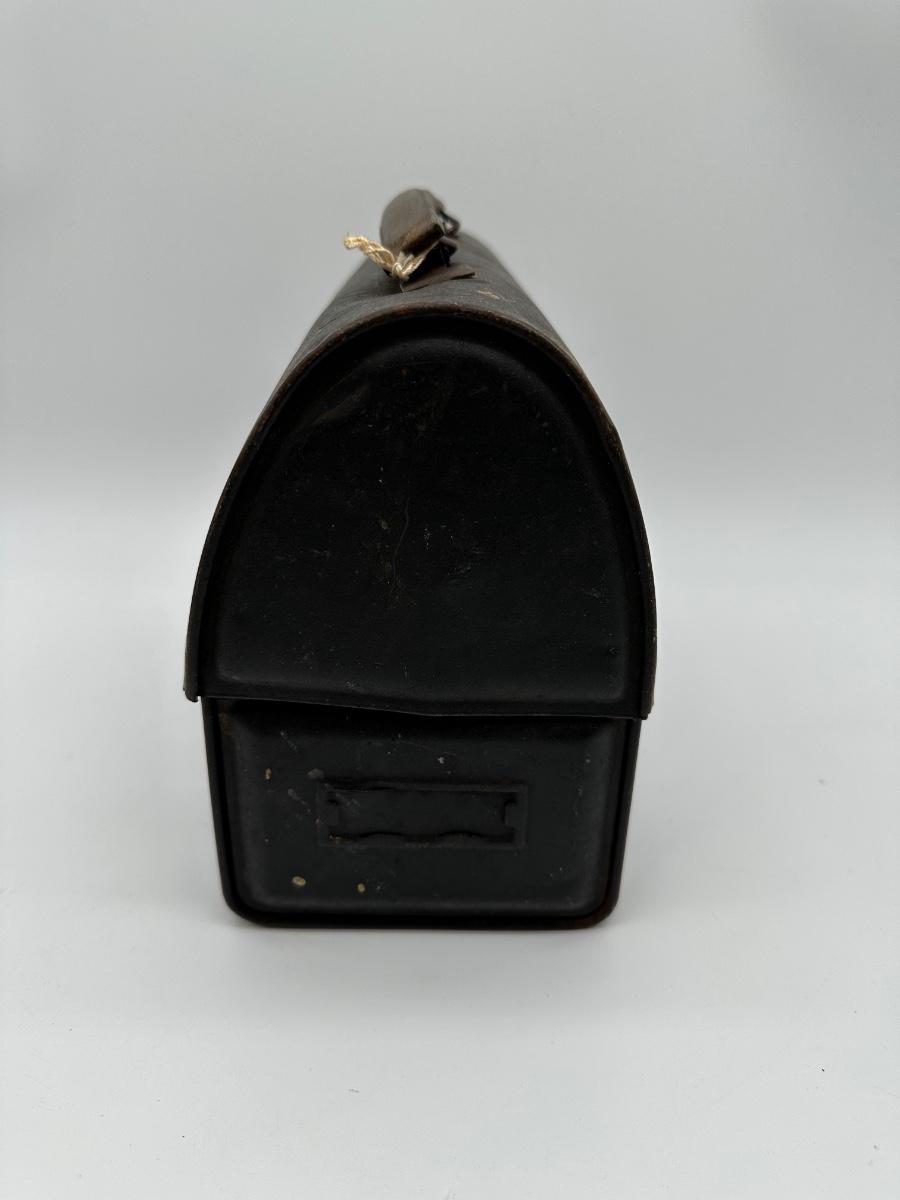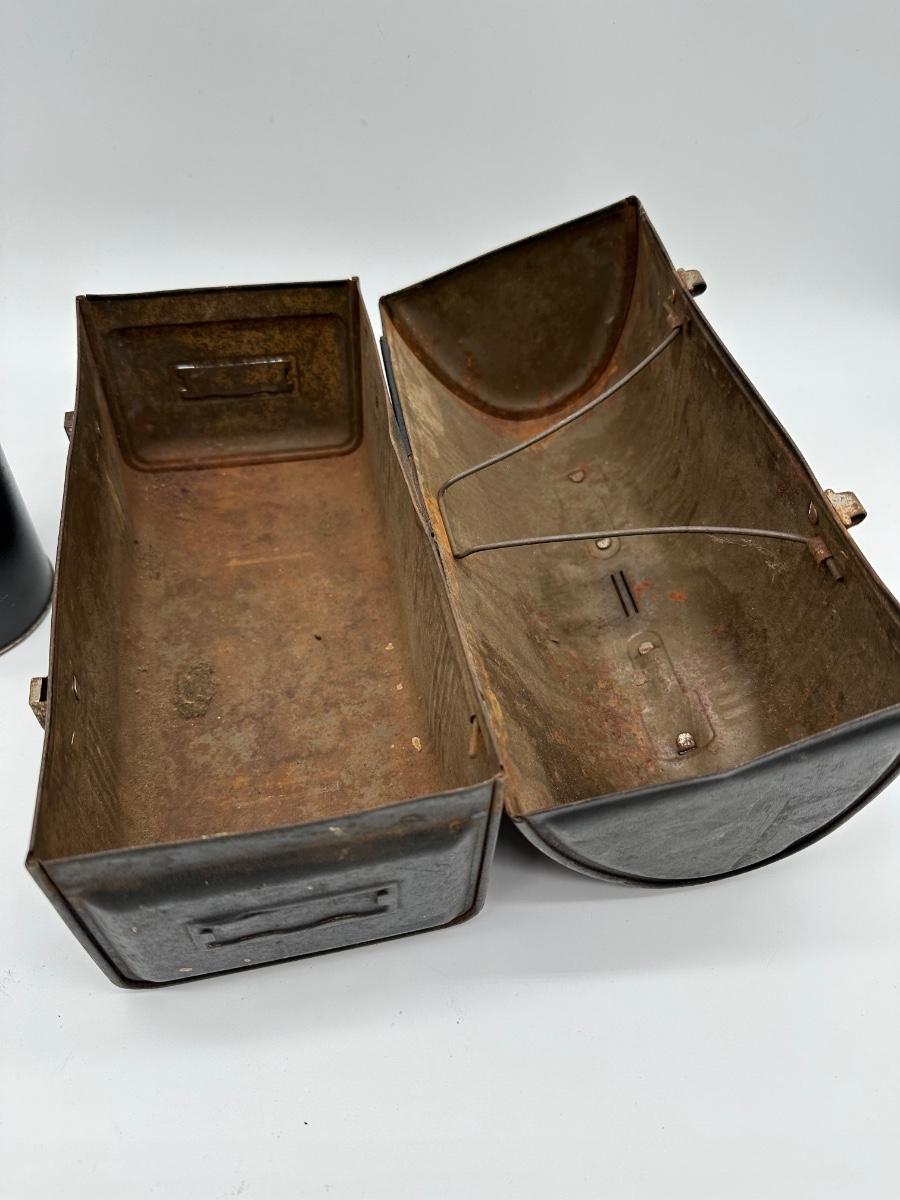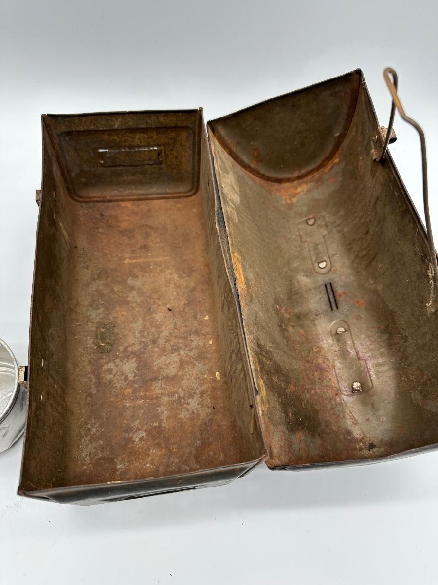 Vintage black metal lunch pail with hinged lid and dual front latches. Includes original matching metal thermos with cork stopper and cup. Classic industrial/workman style—great for collectors, décor, or display.