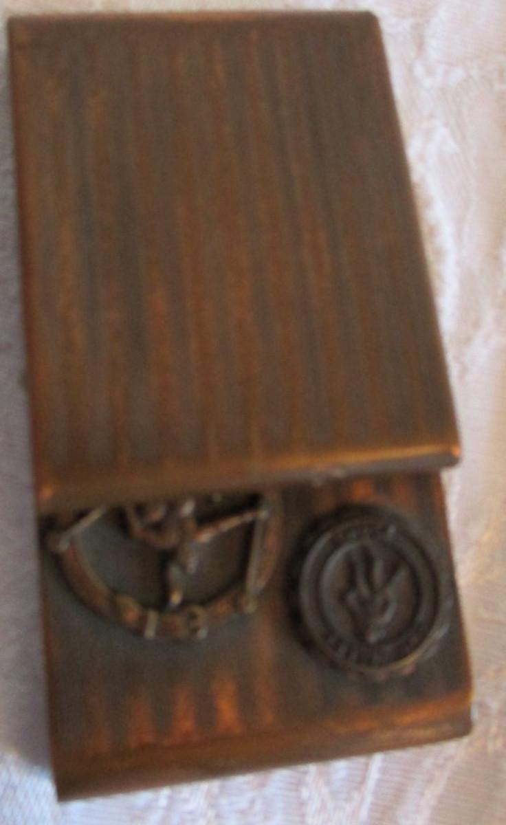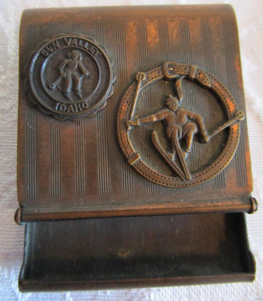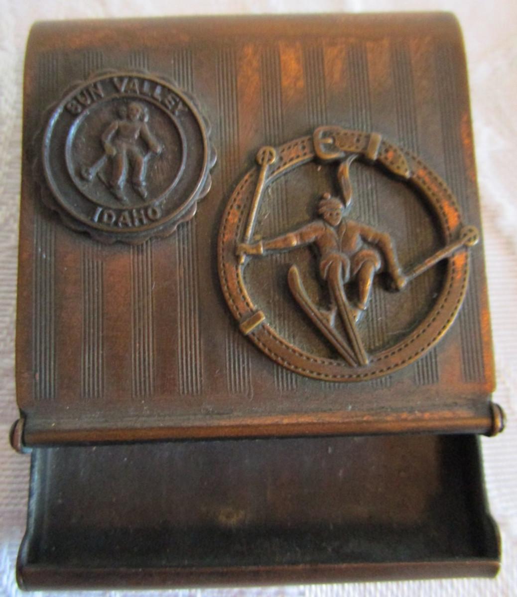 Vintage Metal match holder/dispenser, cast with "Sun Valley Idaho" & and skiier decorations on top