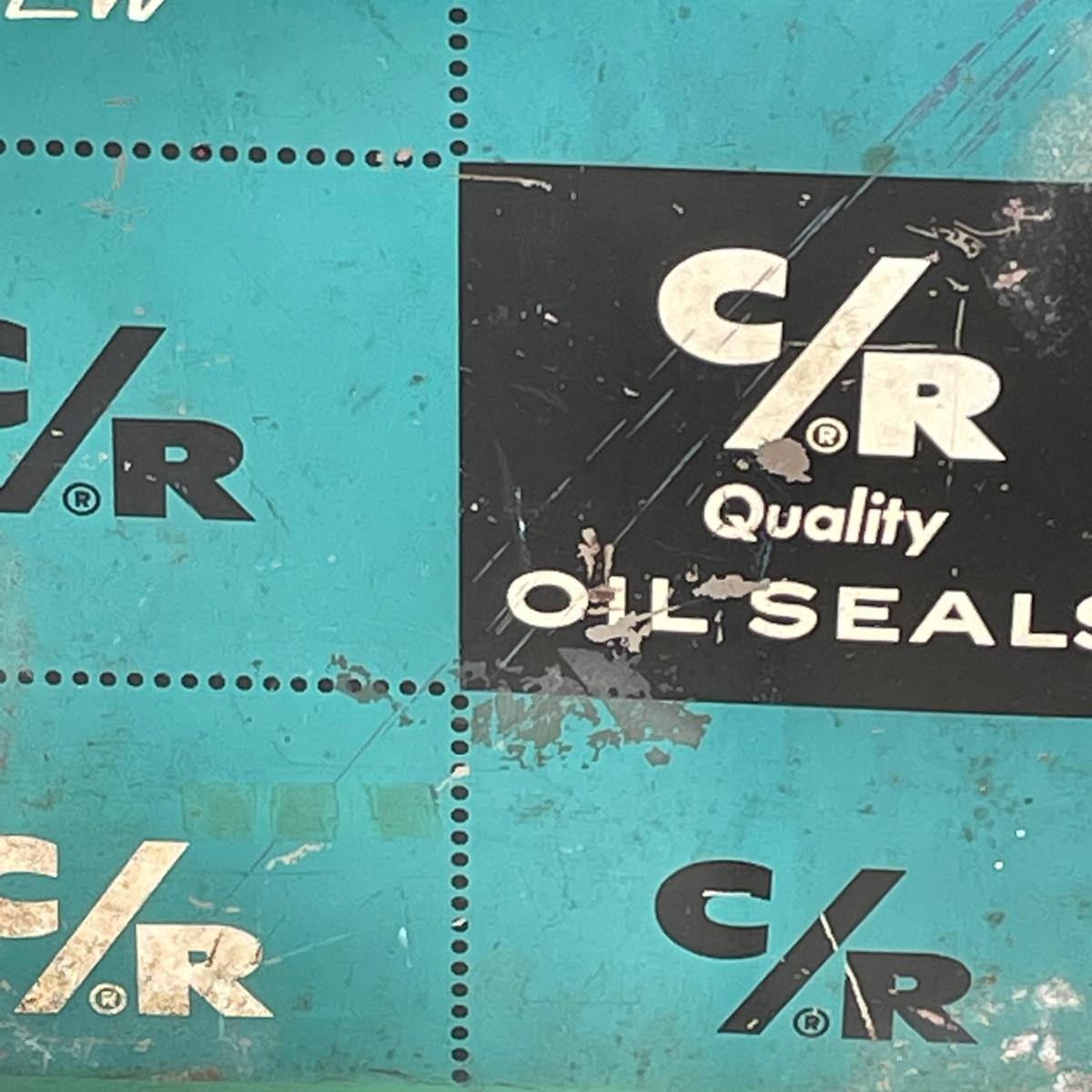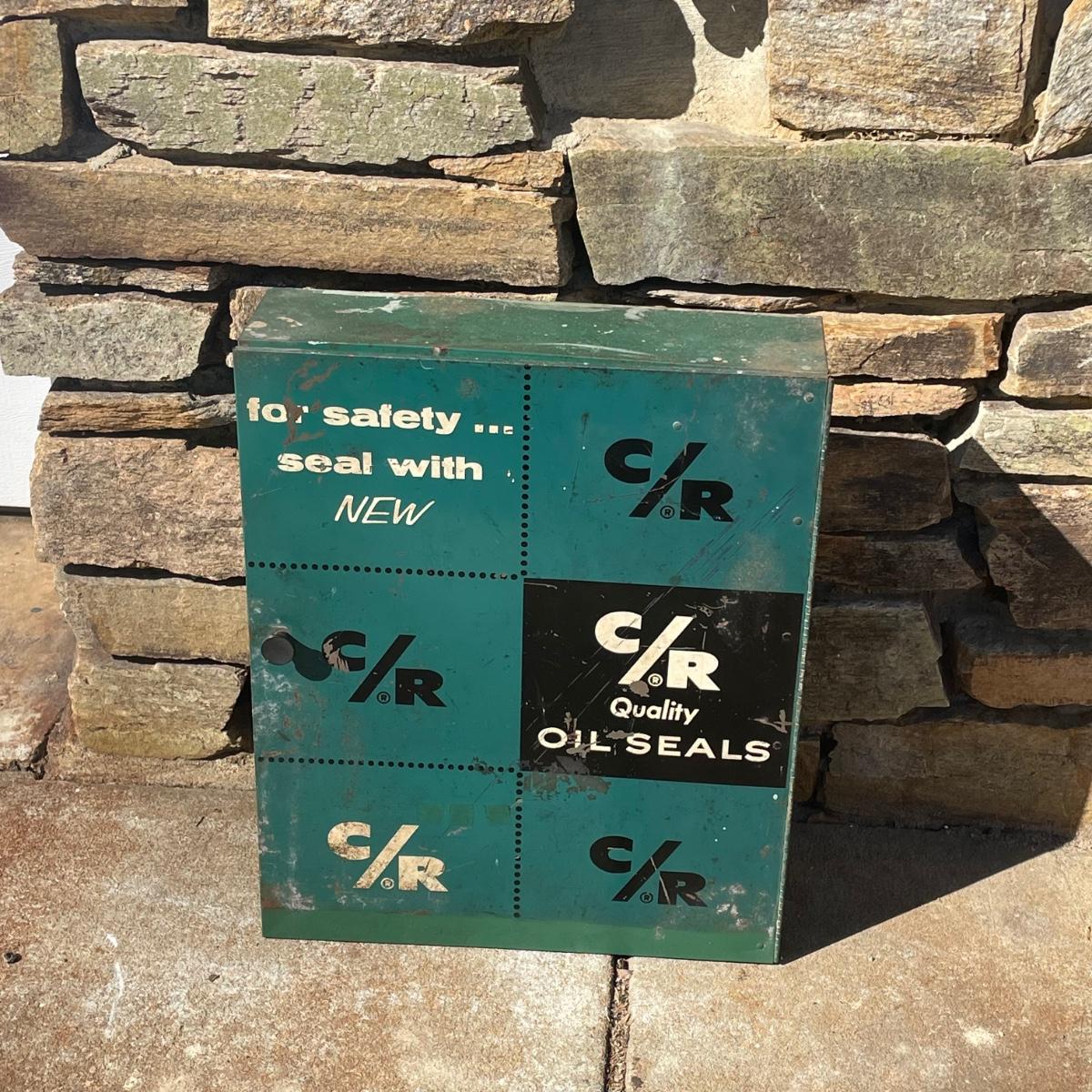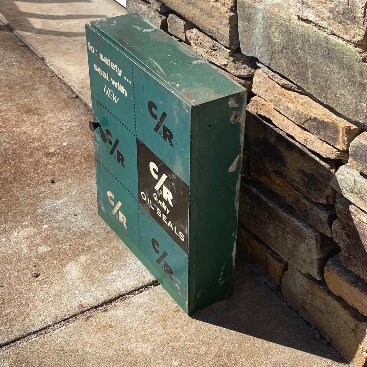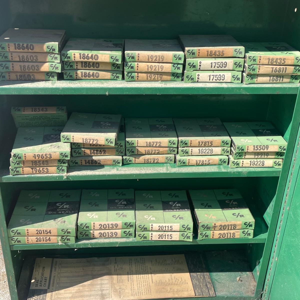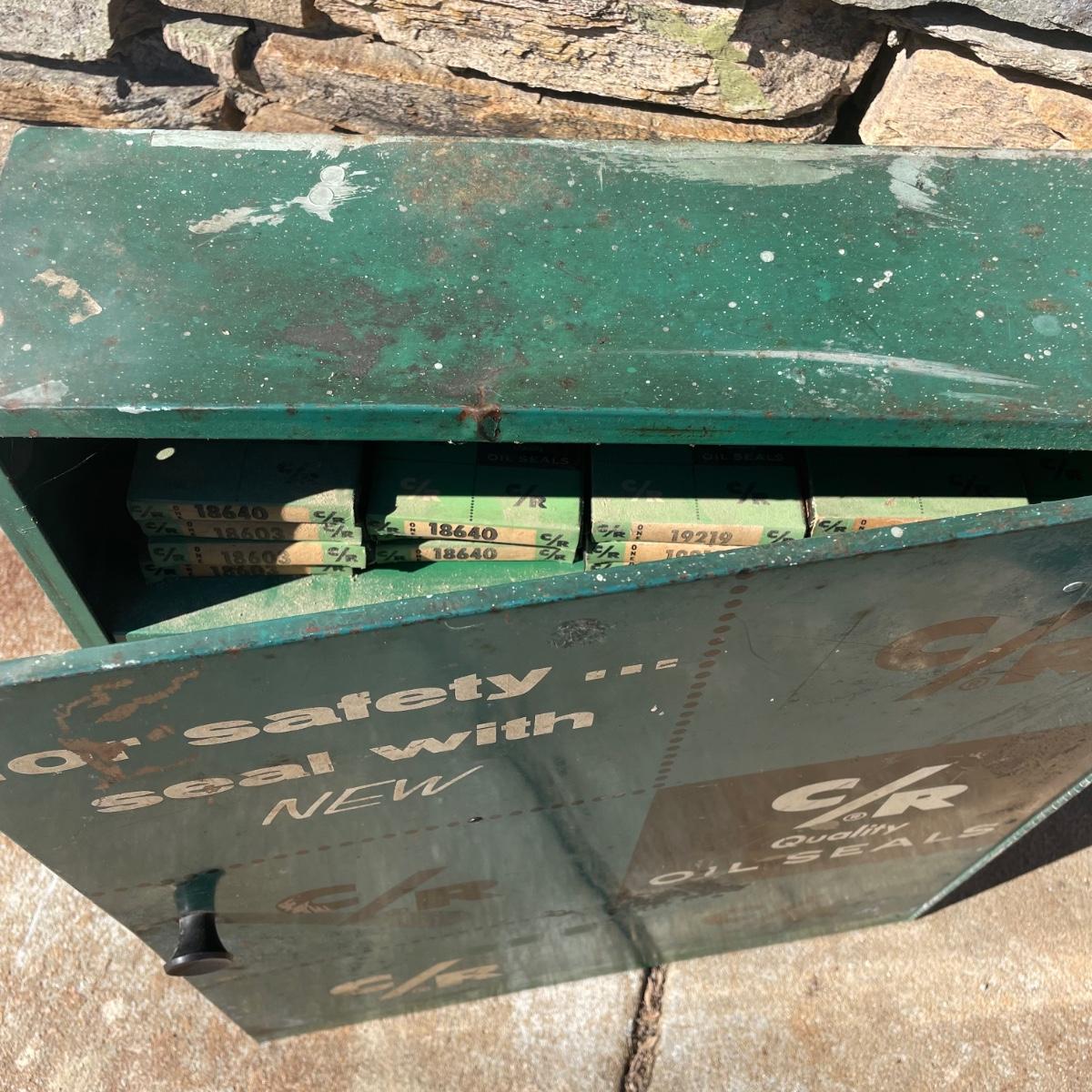 This vintage metal cabinet still houses a bunch of boxes containing oil seals in original packaging. Cabinet has minor small signs showing it’s age with a few rusty spots.