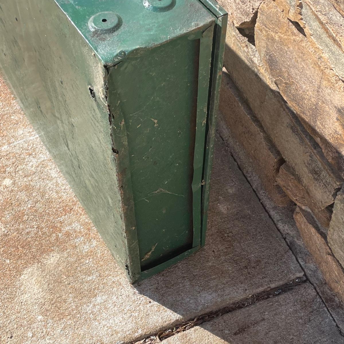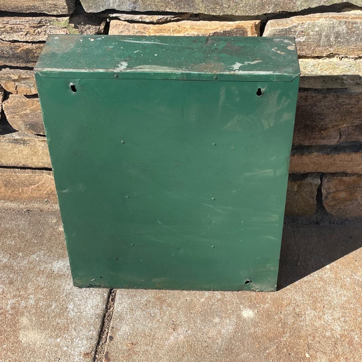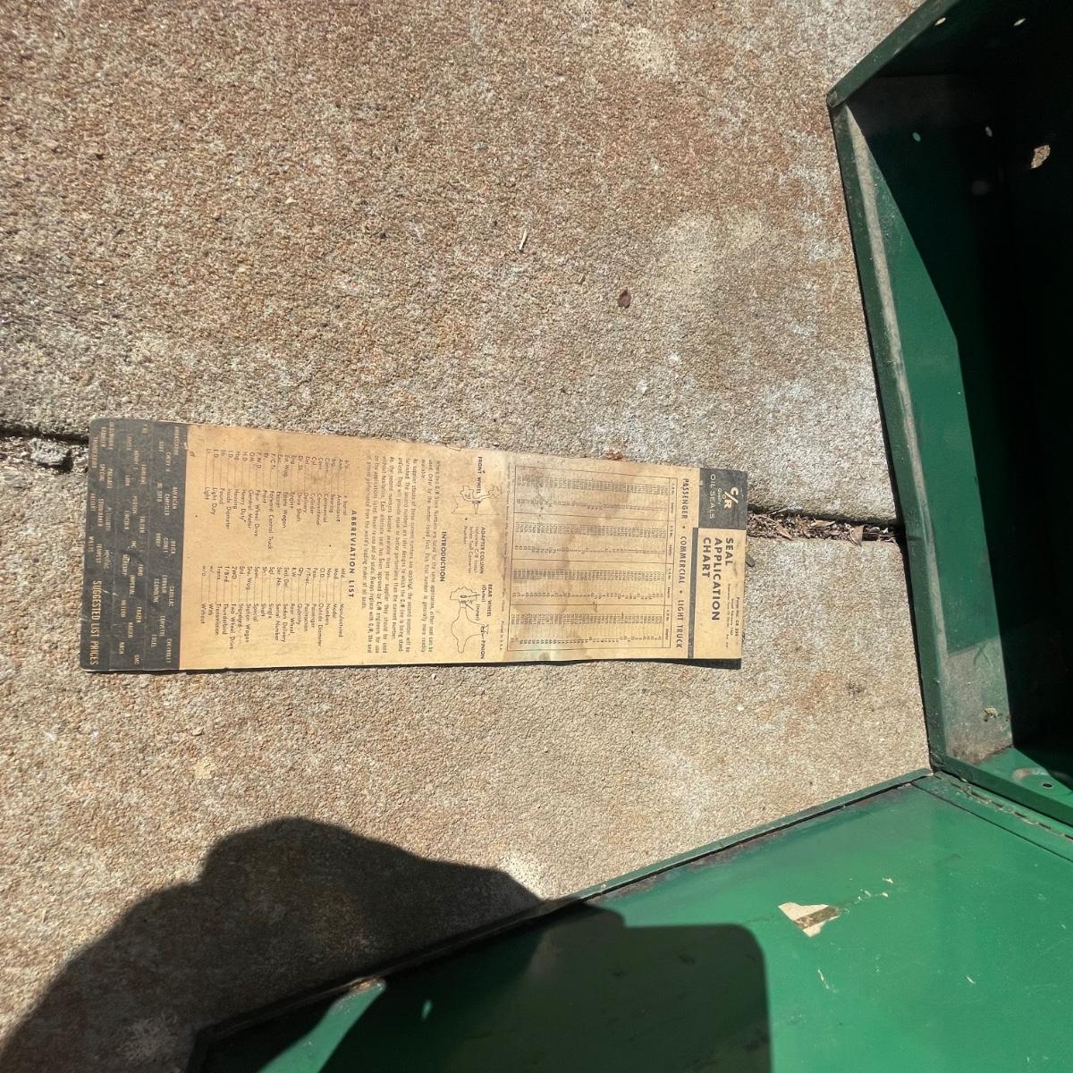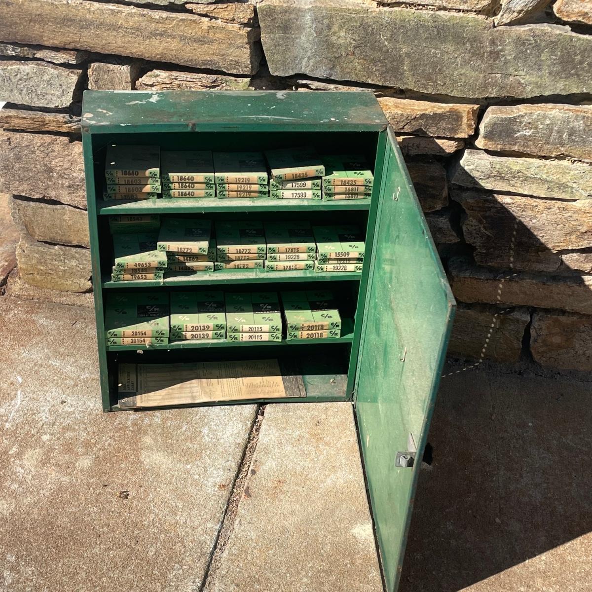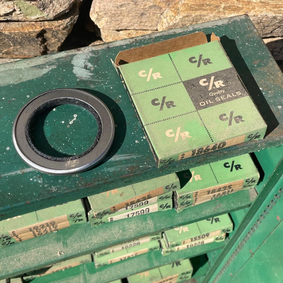 This vintage metal cabinet still houses a bunch of boxes containing oil seals in original packaging. Cabinet has minor small signs showing it’s age with a few rusty spots.
