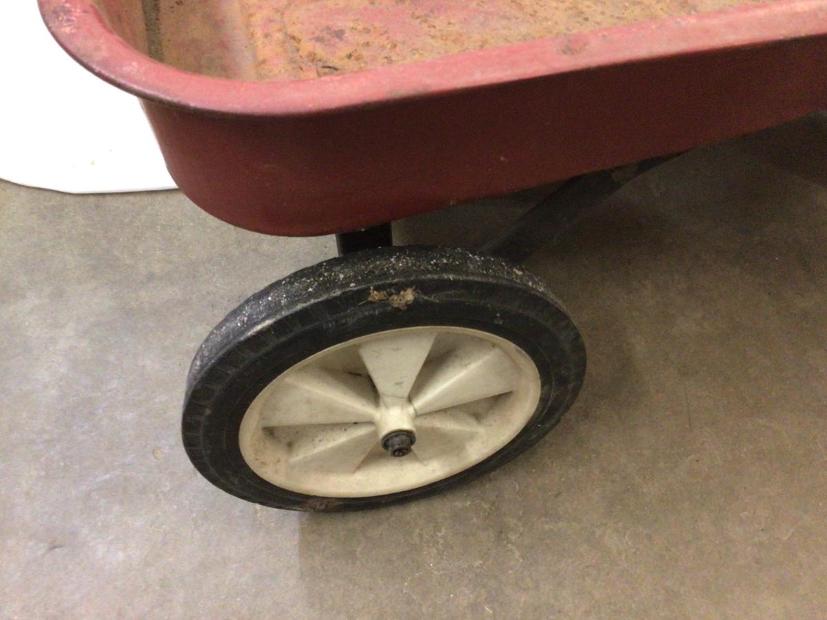 This is a great vintage metal red wagon. It does have plastic wheels, and some rust but overall in good condition. Would be great with flowers in it inna flower bed.