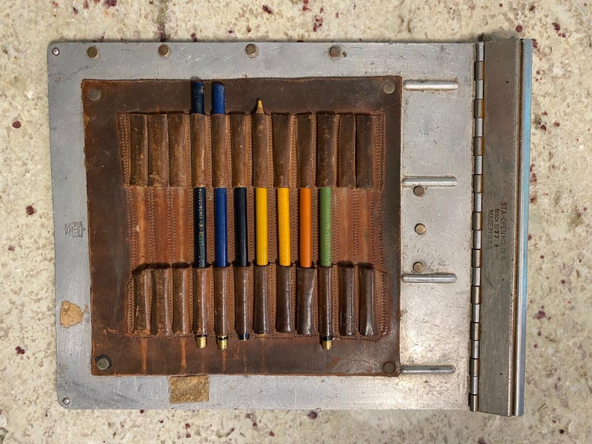 this cool old aluminum clipboard is called the Sta-Open Holder, Stock No. 77 by Standard B& P, Made in the USA . Belonged to Paul Francis Kerr , contains his old fat colored pencils in front leather pencil holder with slots. Inside is a leather slot for business cards and a larger slot for a pad.