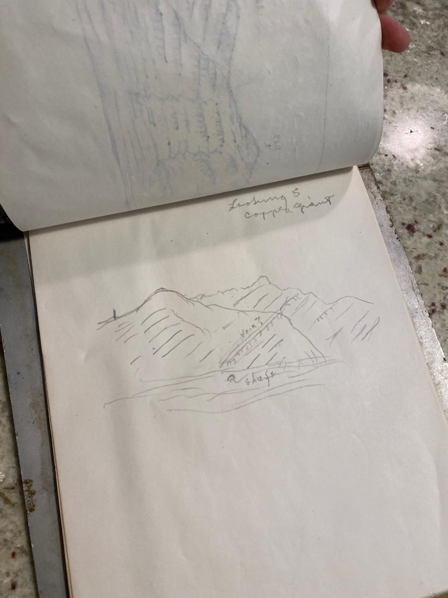 In the clipboard are a bunch of old pieces of drawing paper with sketches and notes by Prof. Kerr while scouting . Measures 10 x 13” . Remnants of old tape and soil.