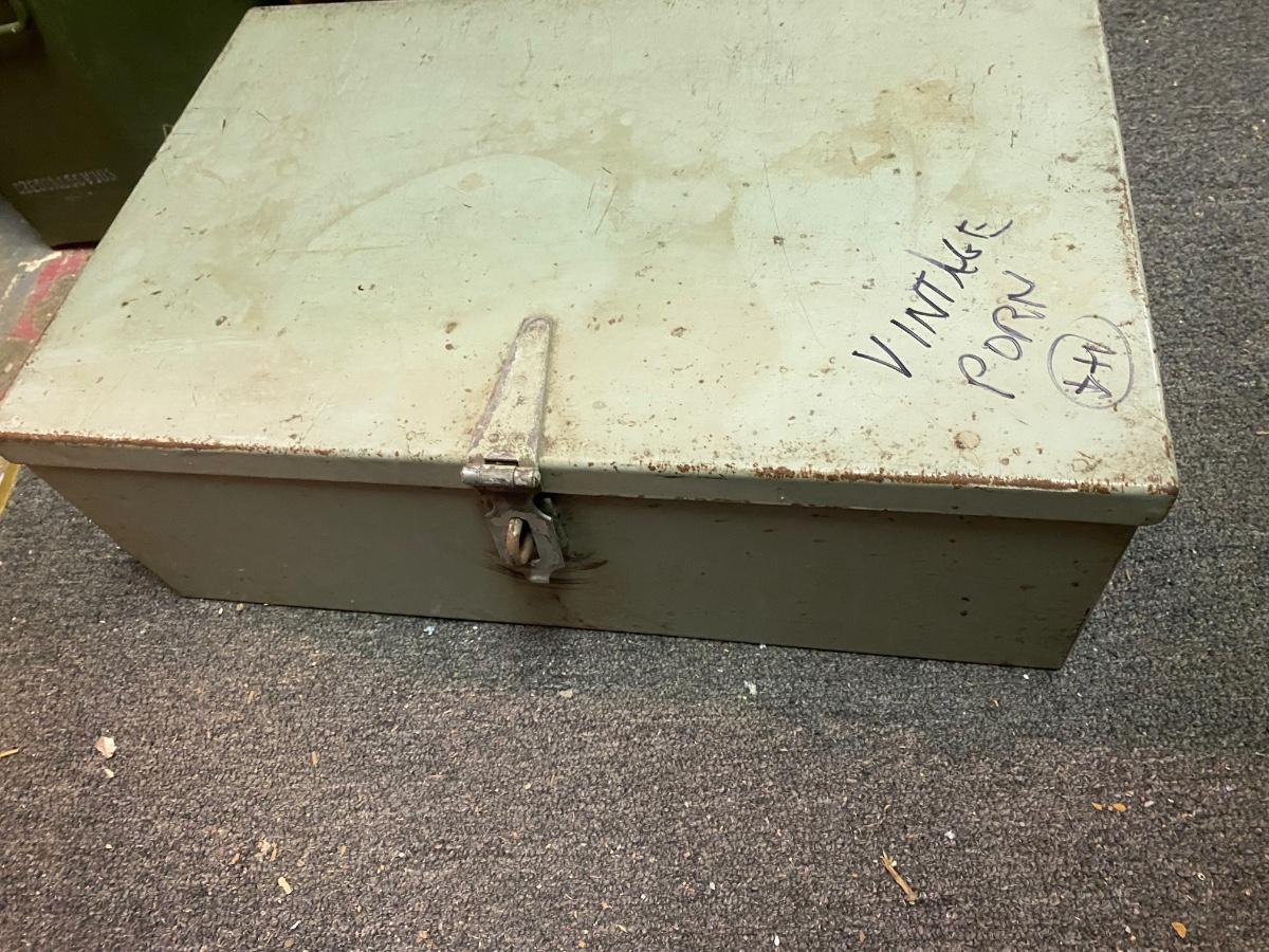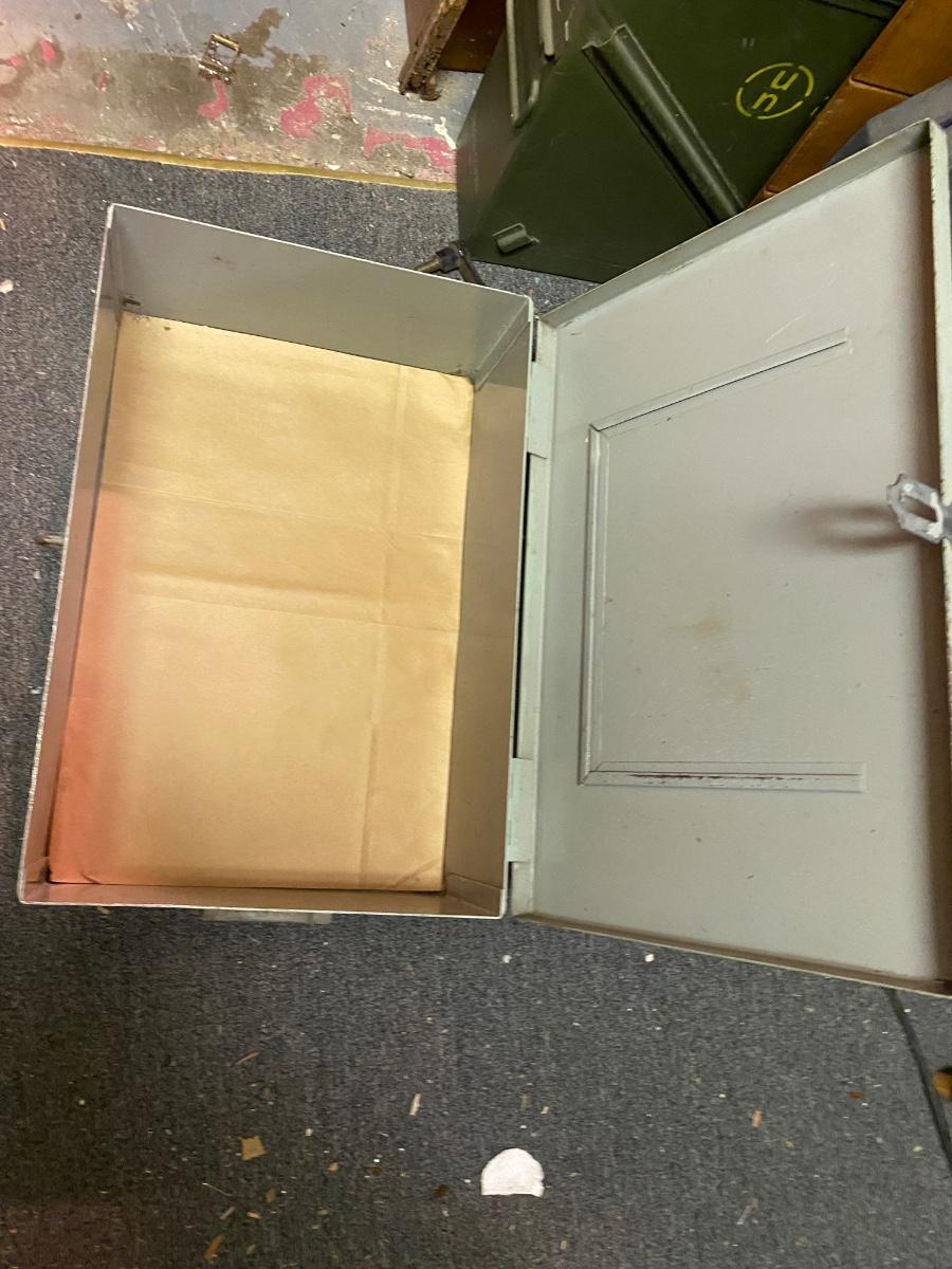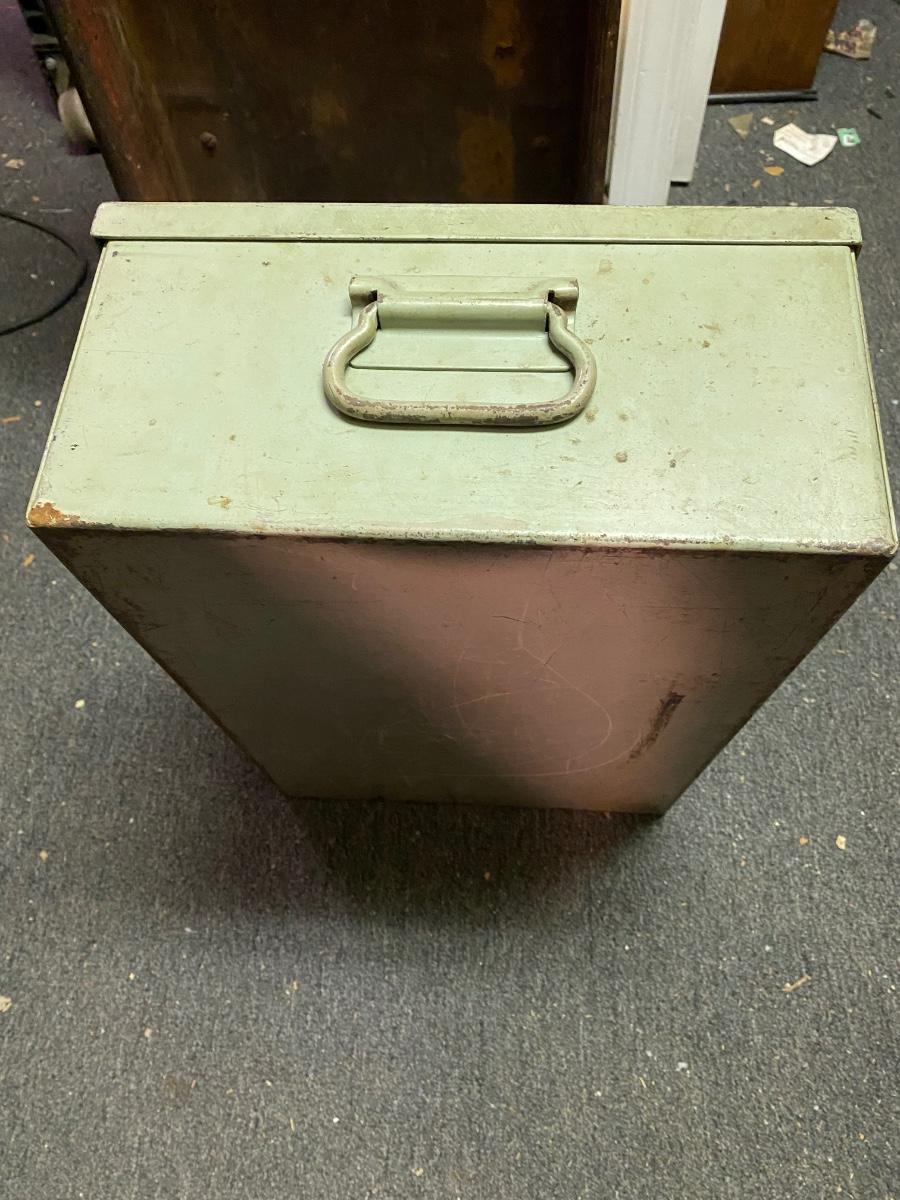 Vintage METAL STORAGE BOX .VEry Heavy. Has a latch that you can put a lock on. Measures appprox. 20Lx6x12W