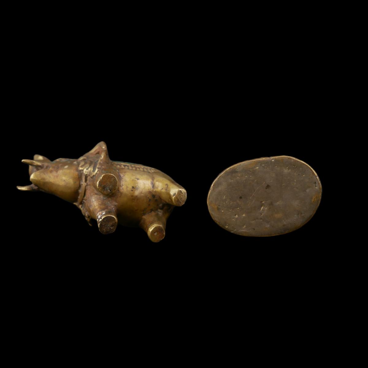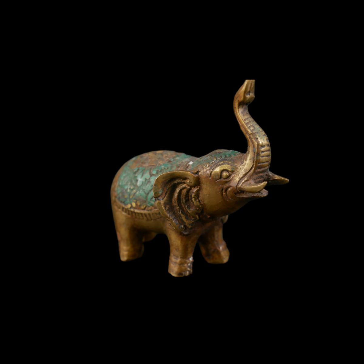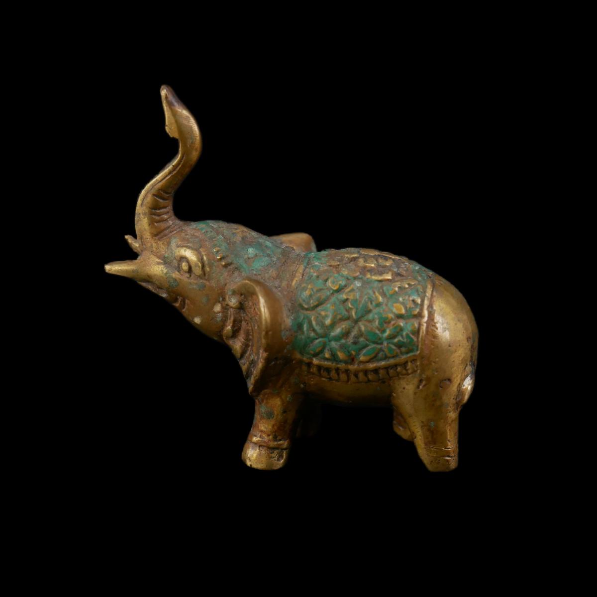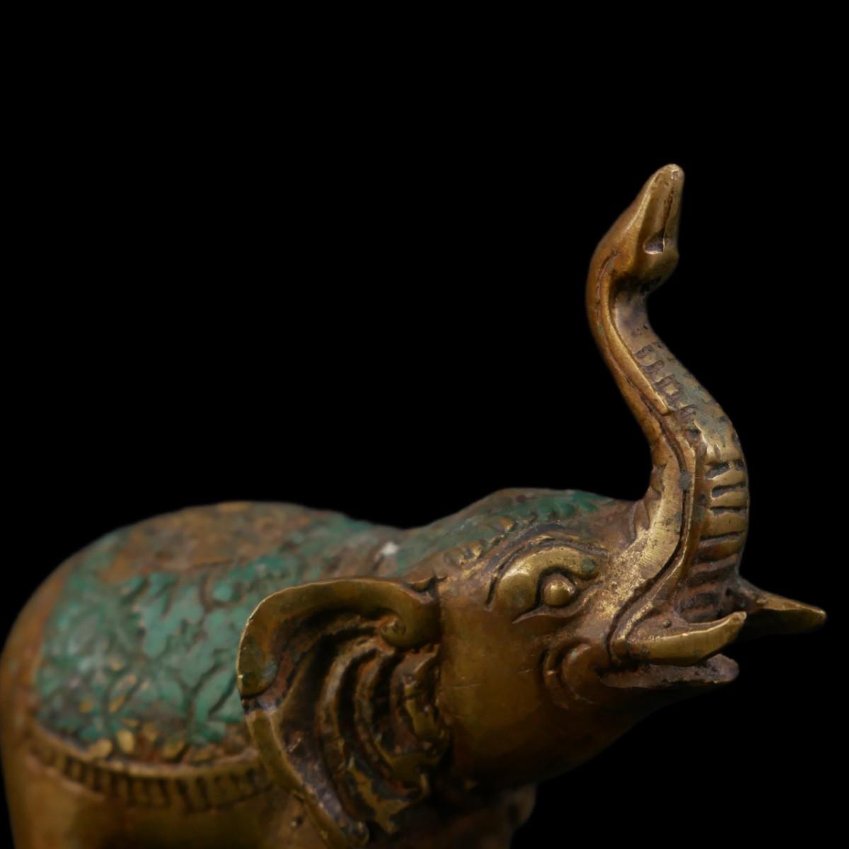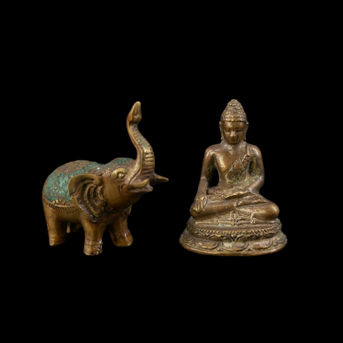 Vintage handmade Thai figurines in form of Buddha and an elephant. Solid non-magnetic metal material. Both have wear from age, elephant has some corrosion spots. Both overall good condition. Largest measures L 2.5" x H 2" x 1.5". Lot weighs 0.6 oz. (C38)