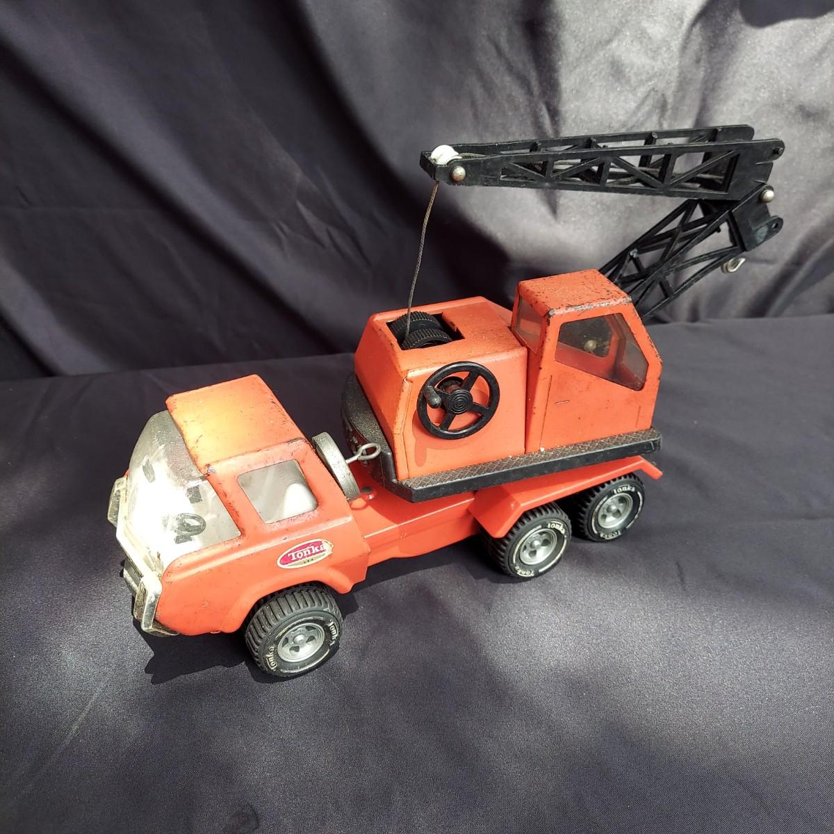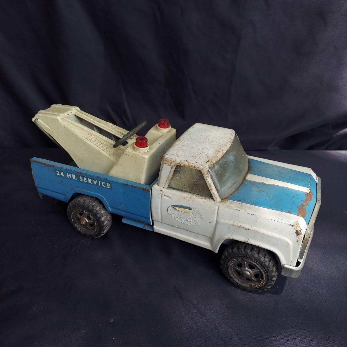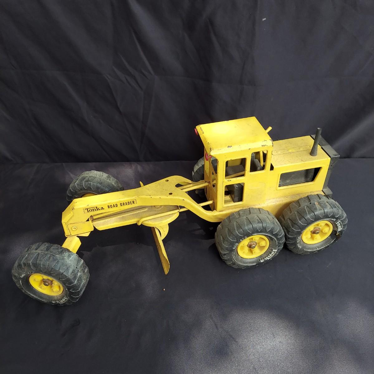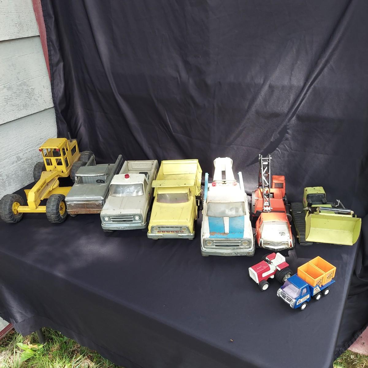 There are seven metal Tonka trucks plus two small trucks. Included are a grader, two pickup trucks, a dump truck truck, two wreckers and a bulldozer. The largest is the grader that is 7.5” x 18" x 8”H. There is overall wear, including rust, due to age on all pieces. Shipping available