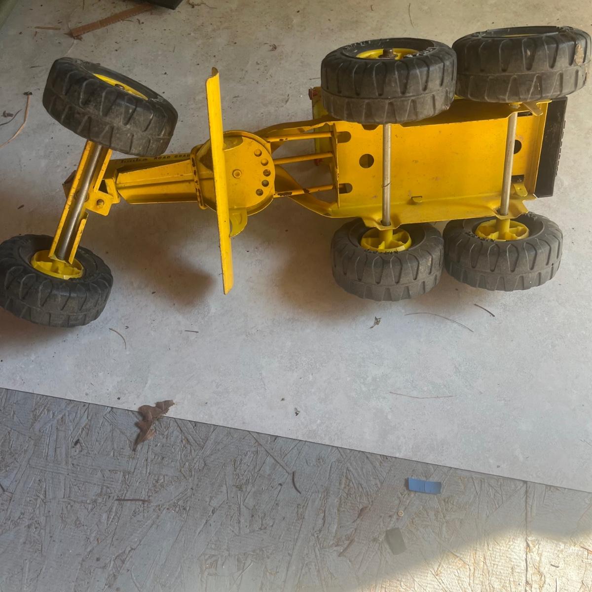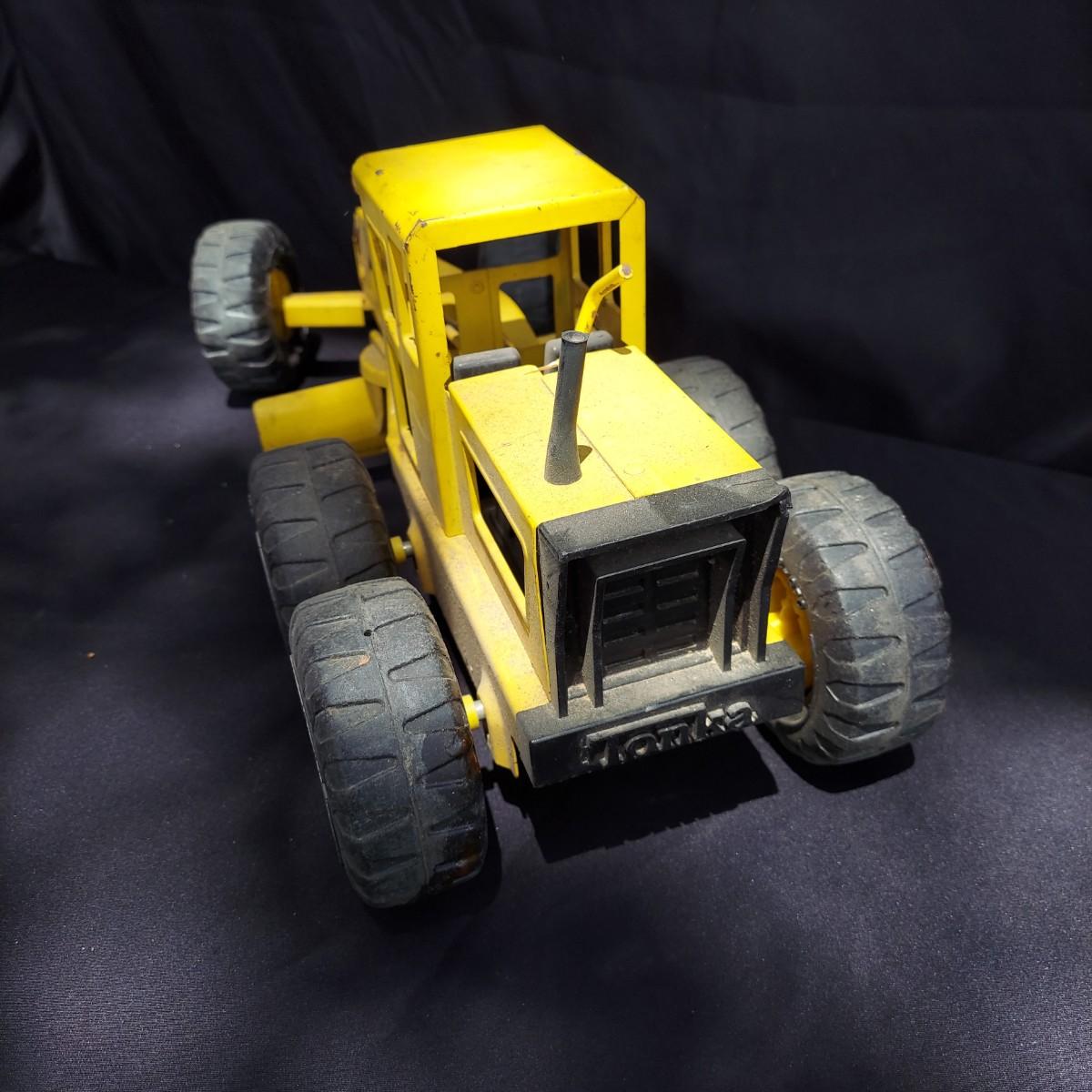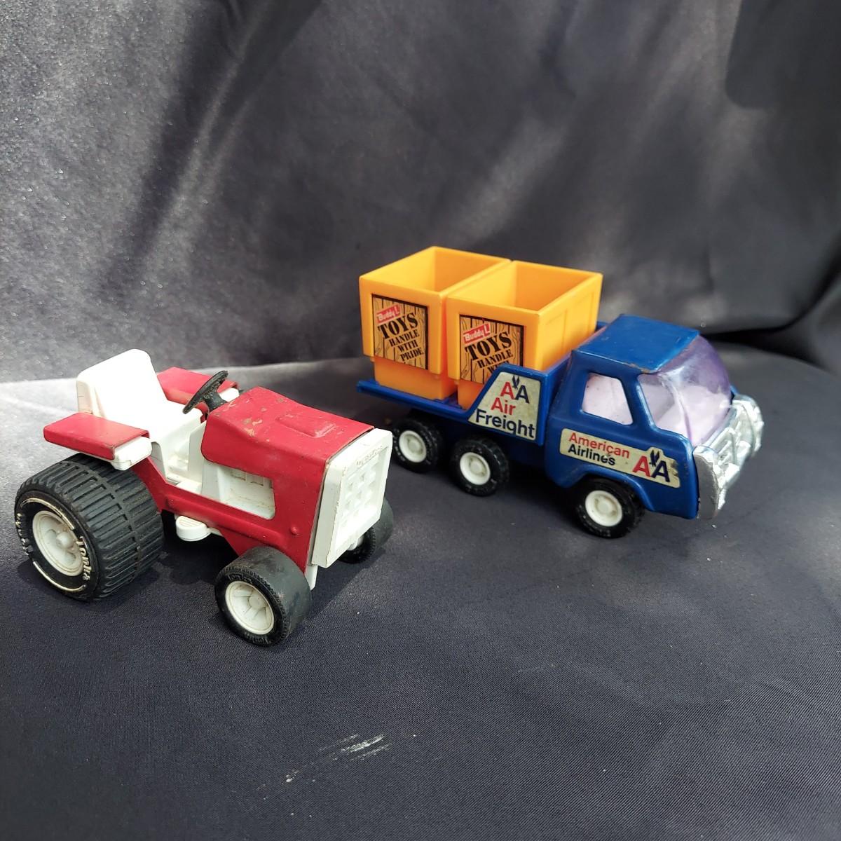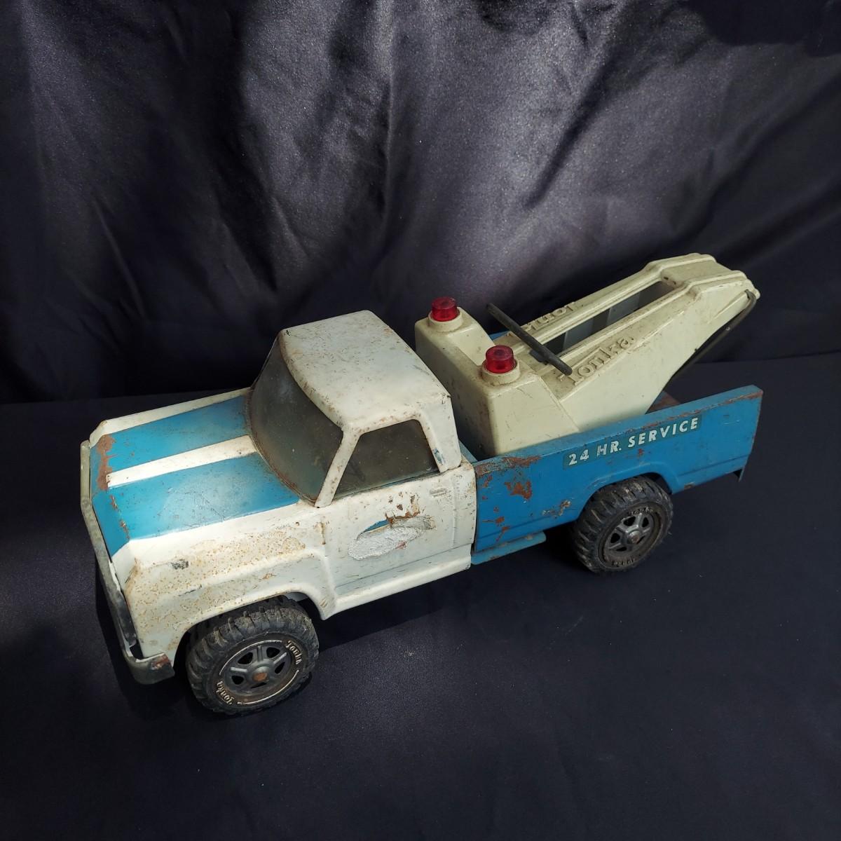 There are seven metal Tonka trucks plus two small trucks. Included are a grader, two pickup trucks, a dump truck truck, two wreckers and a bulldozer. The largest is the grader that is 7.5” x 18" x 8”H. There is overall wear, including rust, due to age on all pieces. Shipping available