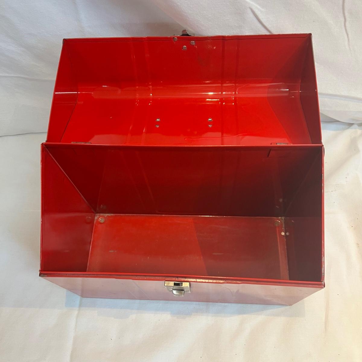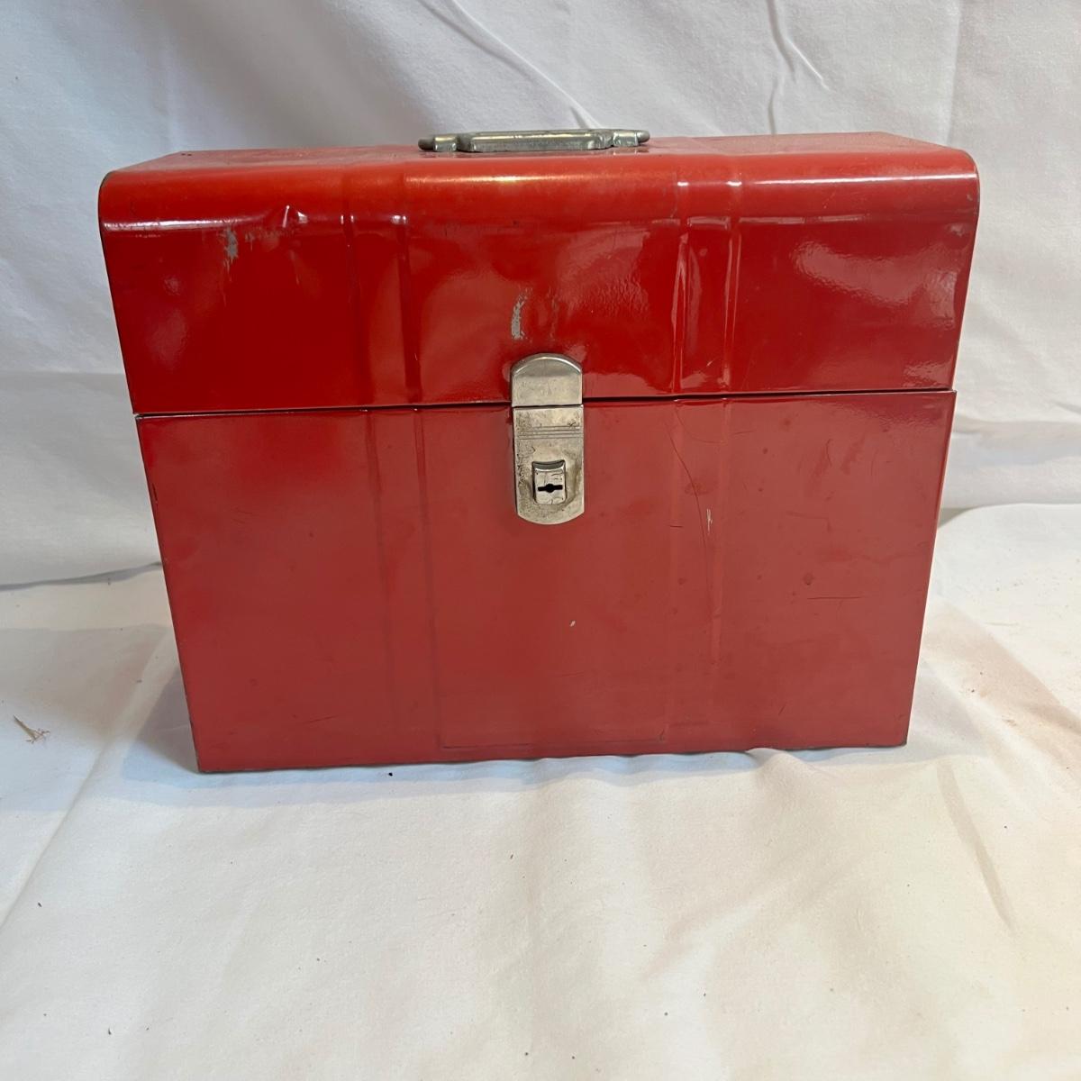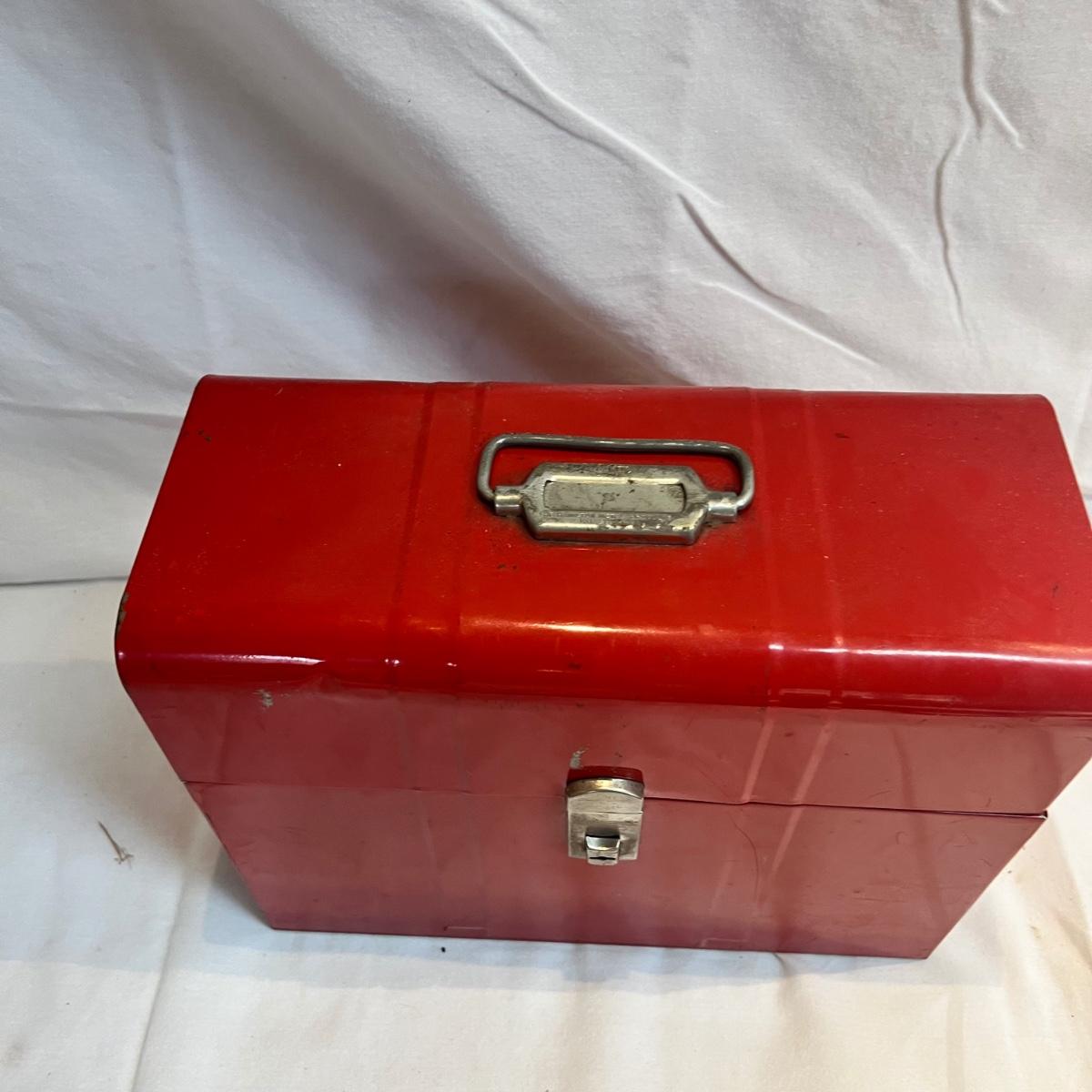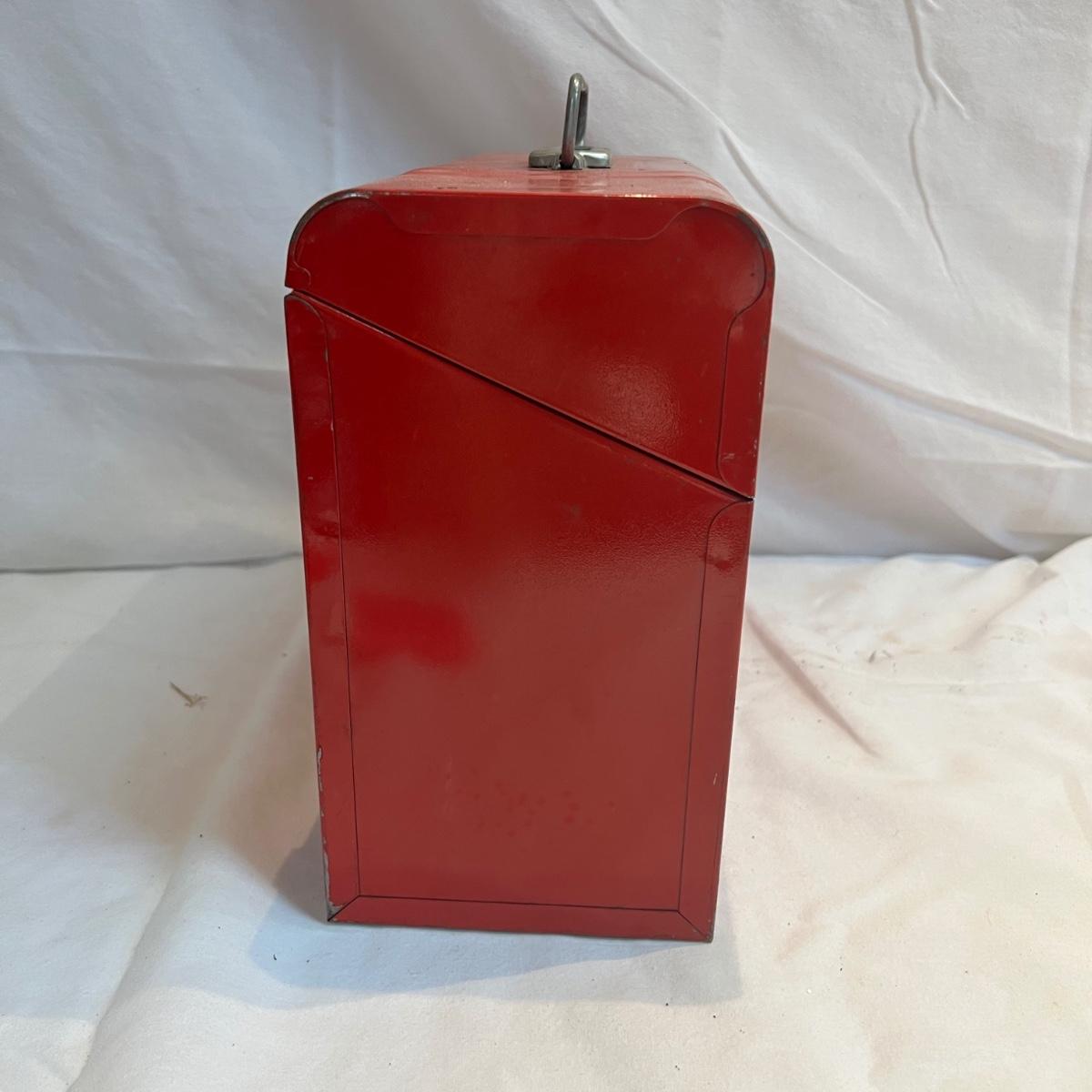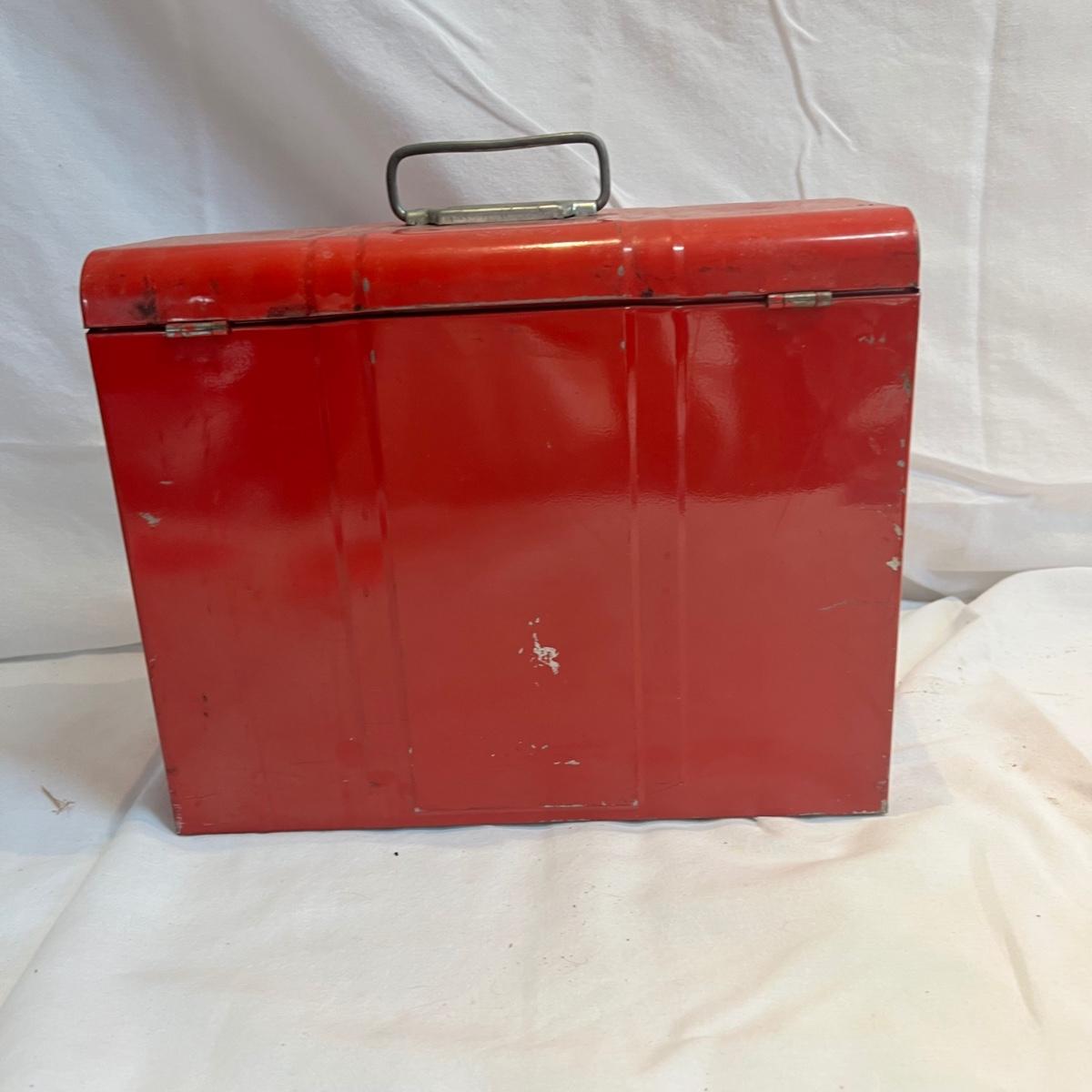 A quintessential blue metal lunch toolbox likely from the 50s measures 9” X 4.25” X 6.5”H. and comes with a clip to put your thermos in the lid! The red square metal tool box measures 12.5” X 5.75” X 10”H.