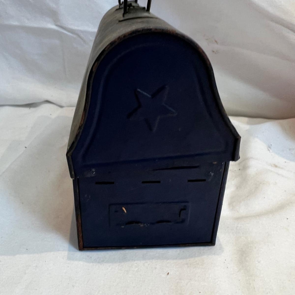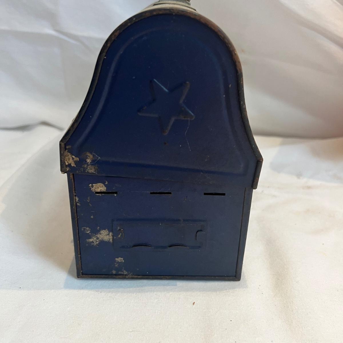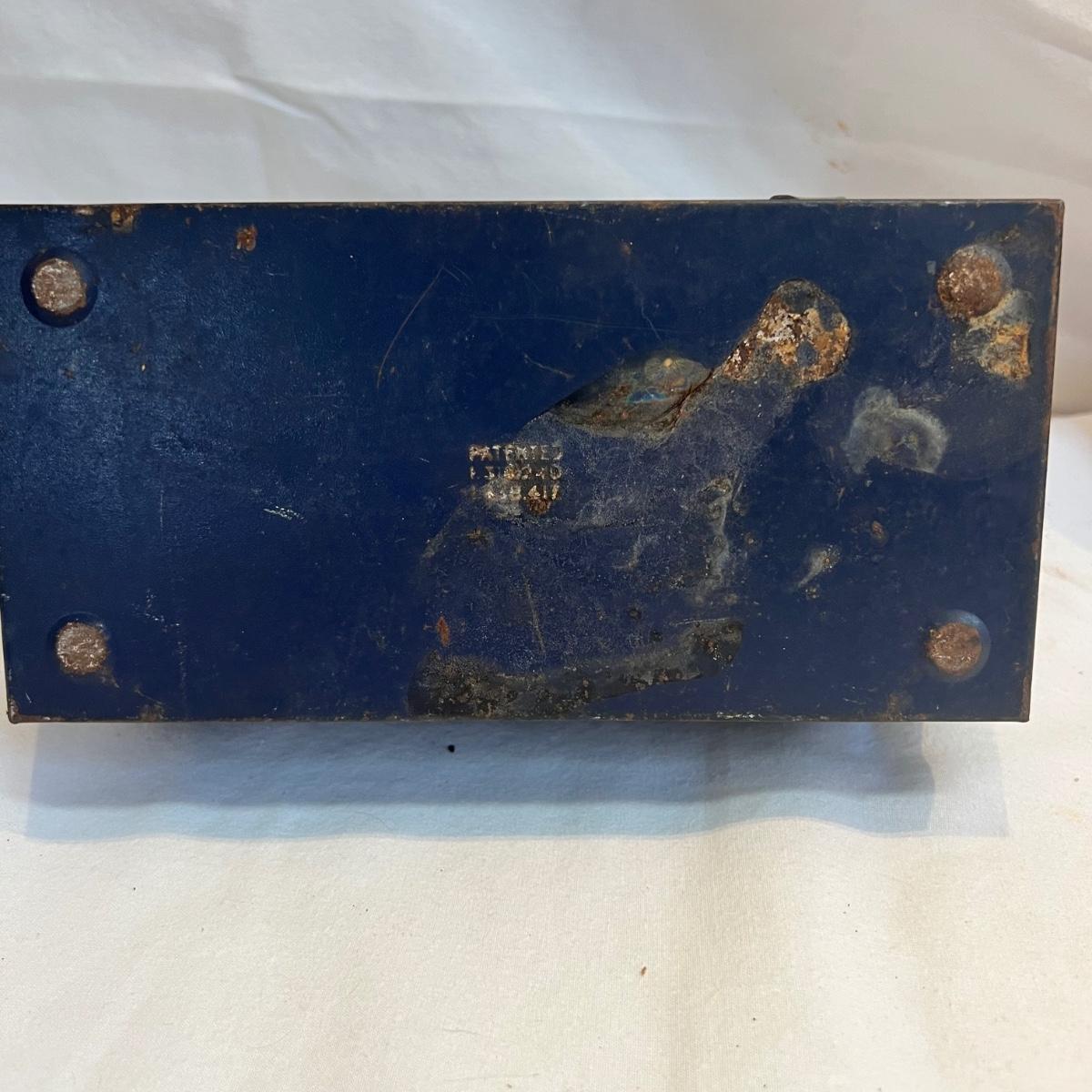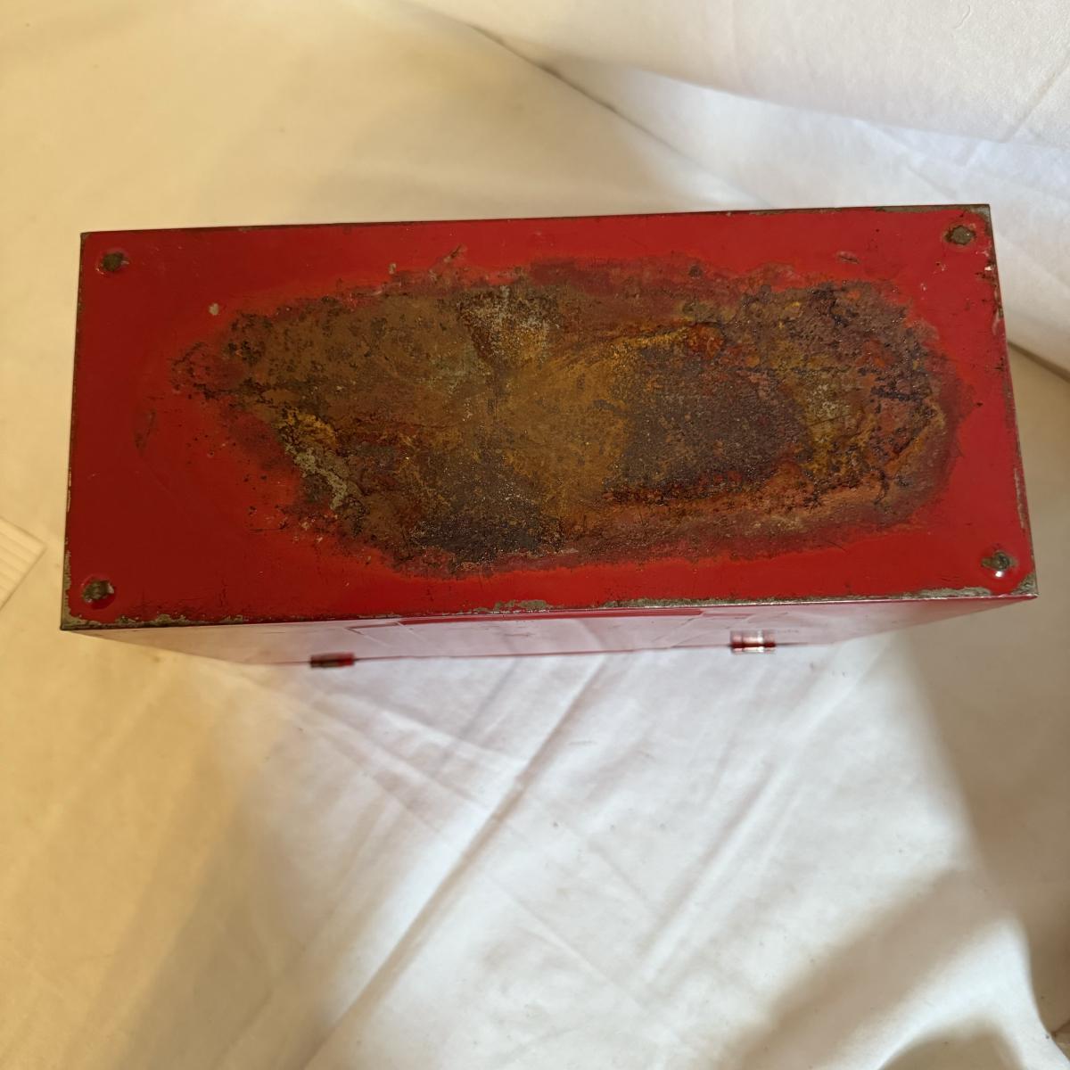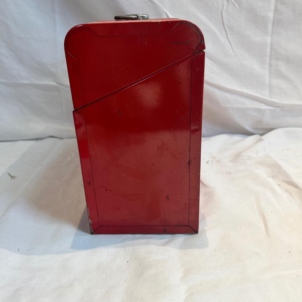 A quintessential blue metal lunch toolbox likely from the 50s measures 9” X 4.25” X 6.5”H. and comes with a clip to put your thermos in the lid! The red square metal tool box measures 12.5” X 5.75” X 10”H.