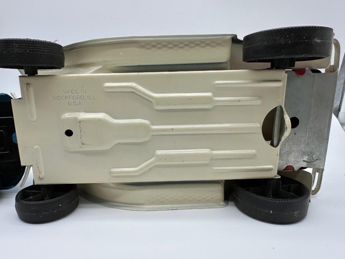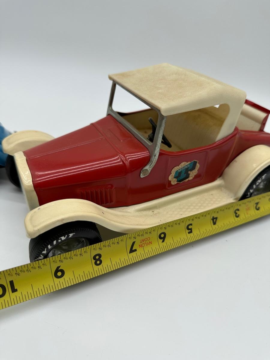 Vintage pressed steel toy car lot featuring a Tonka Volkswagen Beetle and a Nylint Toys Model T–style roadster. Both are American-made metal toys with original paint and classic mid-century styling. Great collector or display pieces.