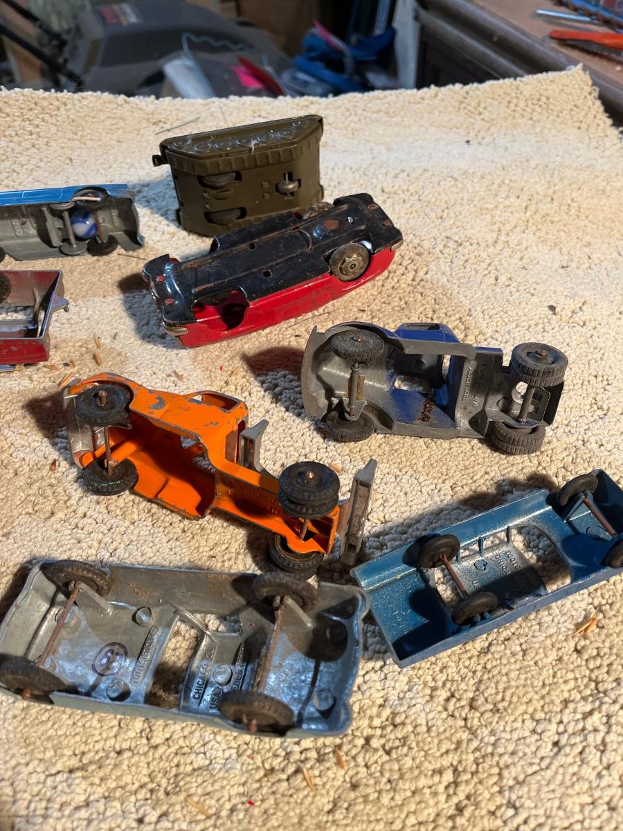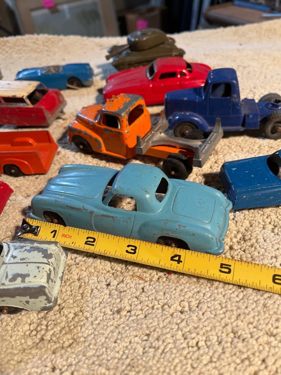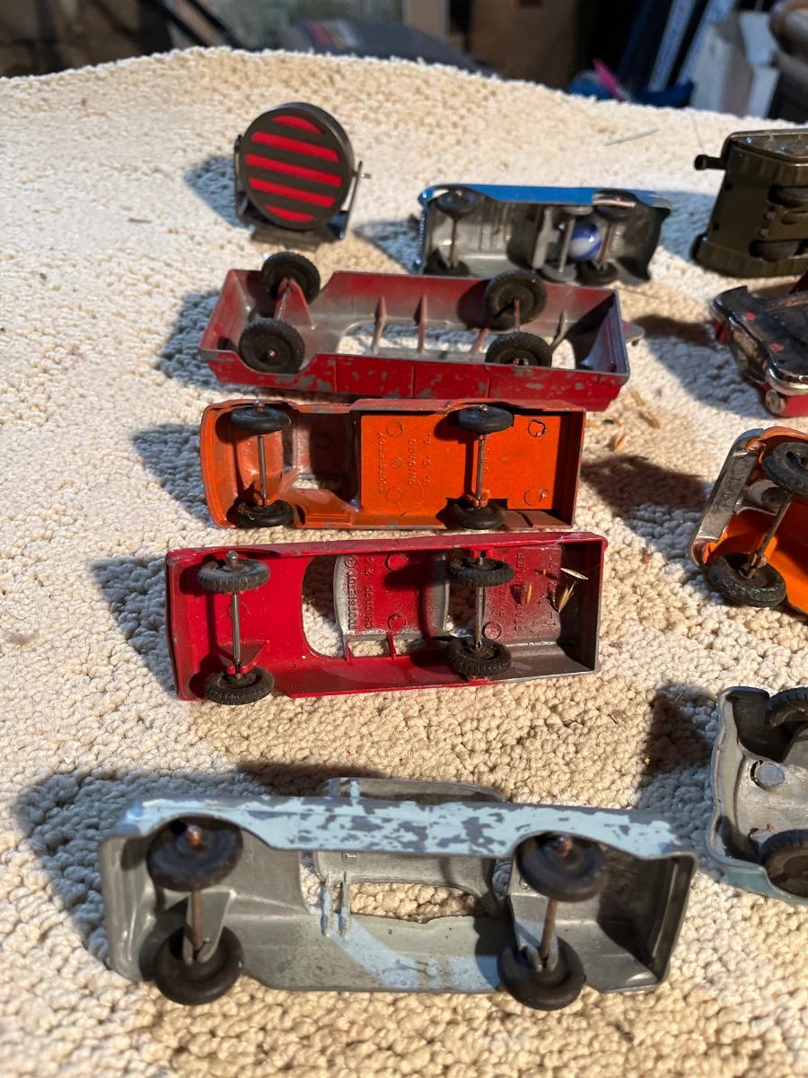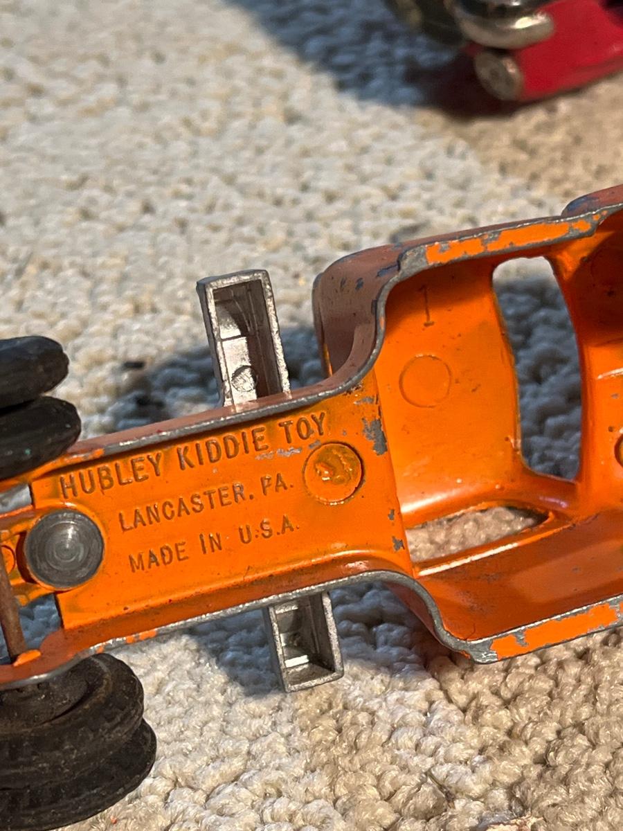 See pictures. Orange semi shiny Kiddie Toy. No name on red car with two wheels or Army items. Rest are Tootsie Toys