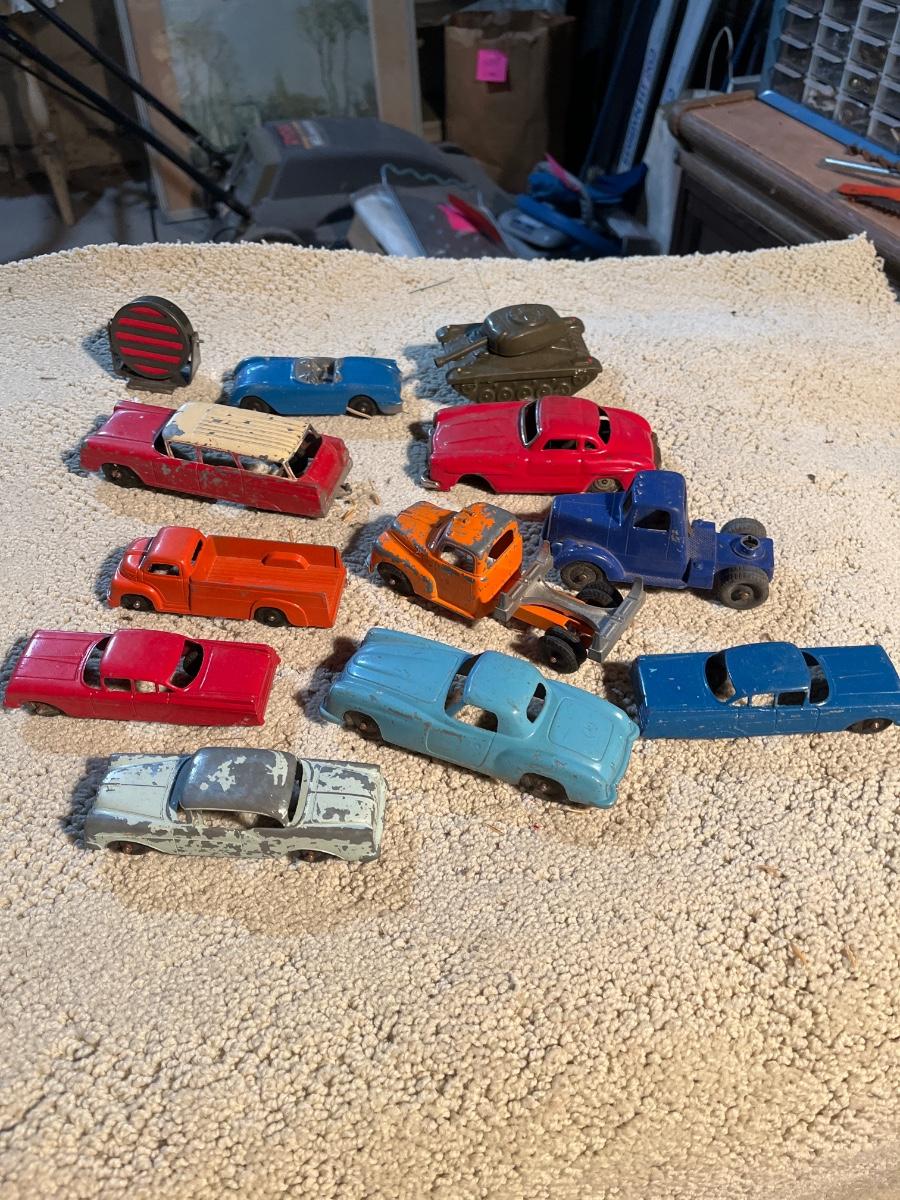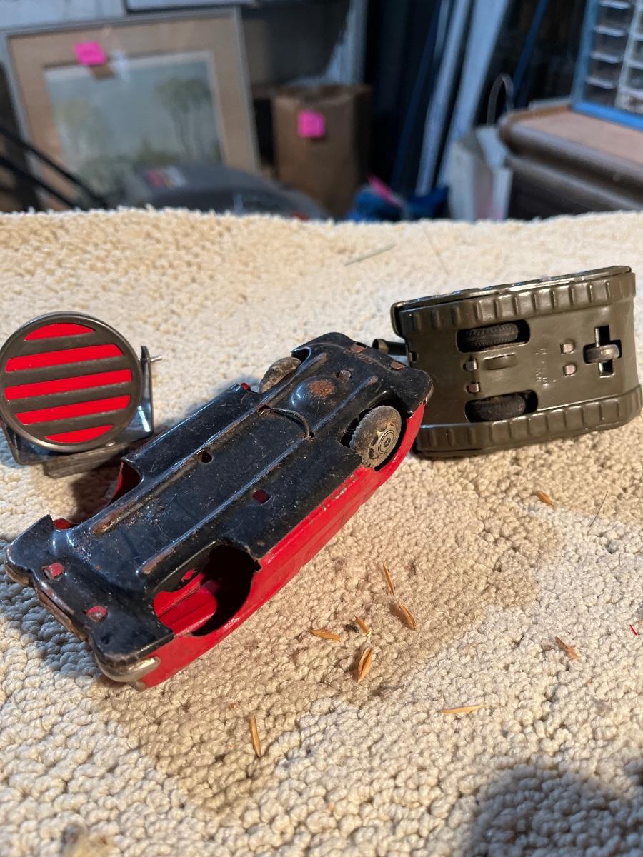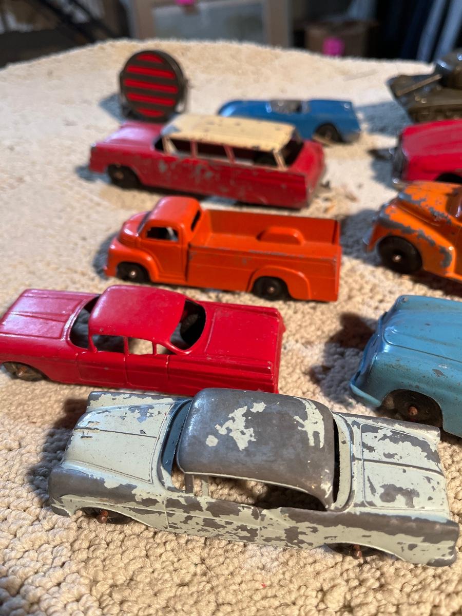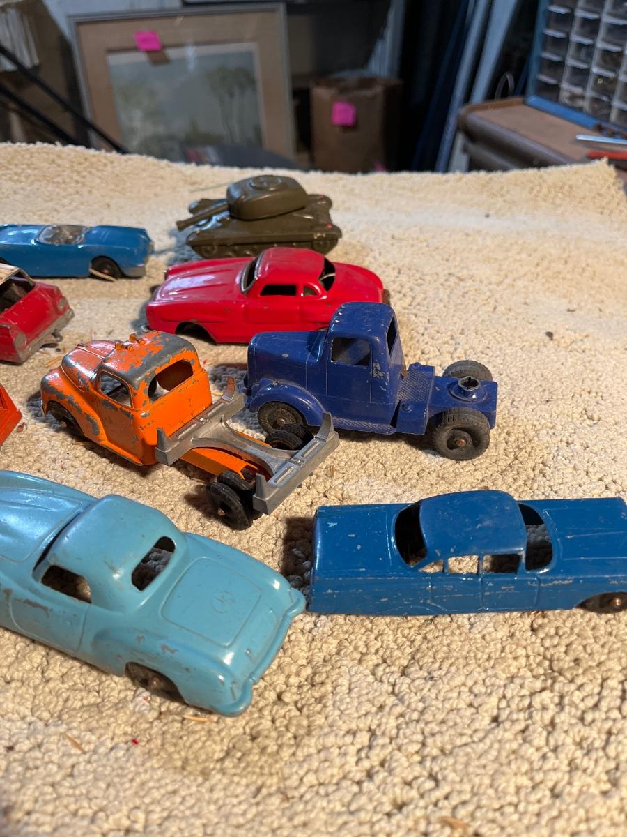 See pictures. Orange semi shiny Kiddie Toy. No name on red car with two wheels or Army items. Rest are Tootsie Toys