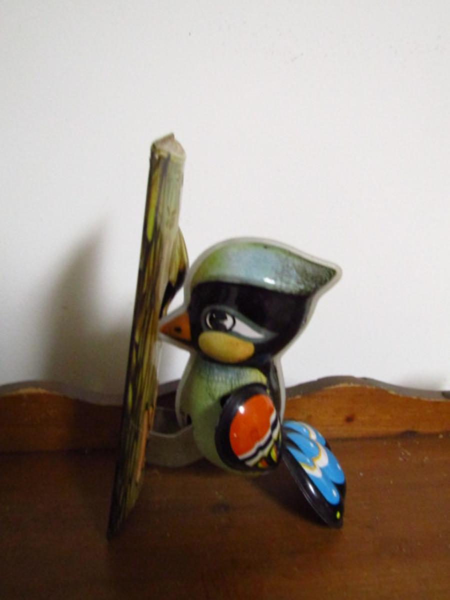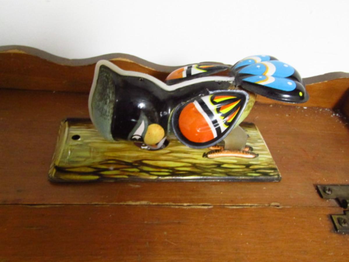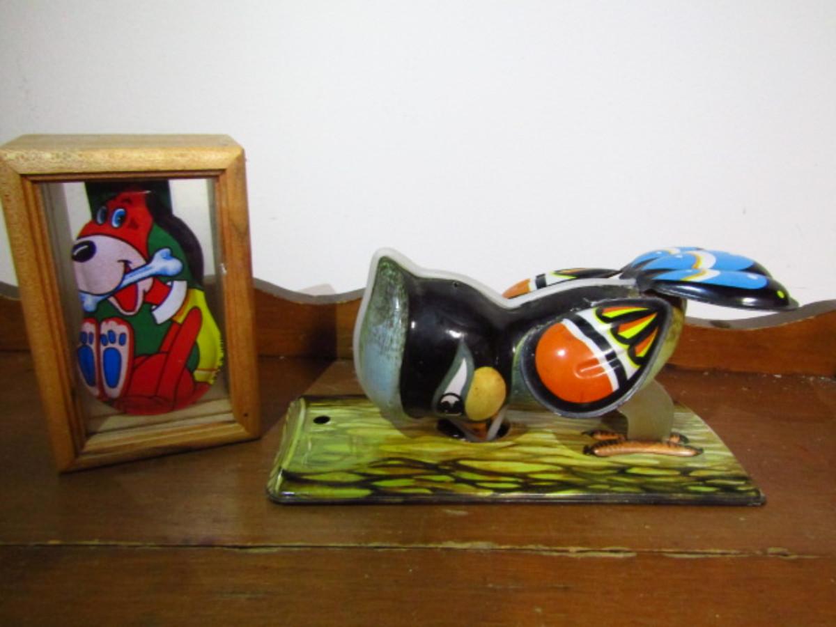 Vintage Metal Toys and Pieces. Woodpecker is a wind-up. Key is missing, so the item is untested. The framed metal dog with bone piece appears to be part of a larger toy.