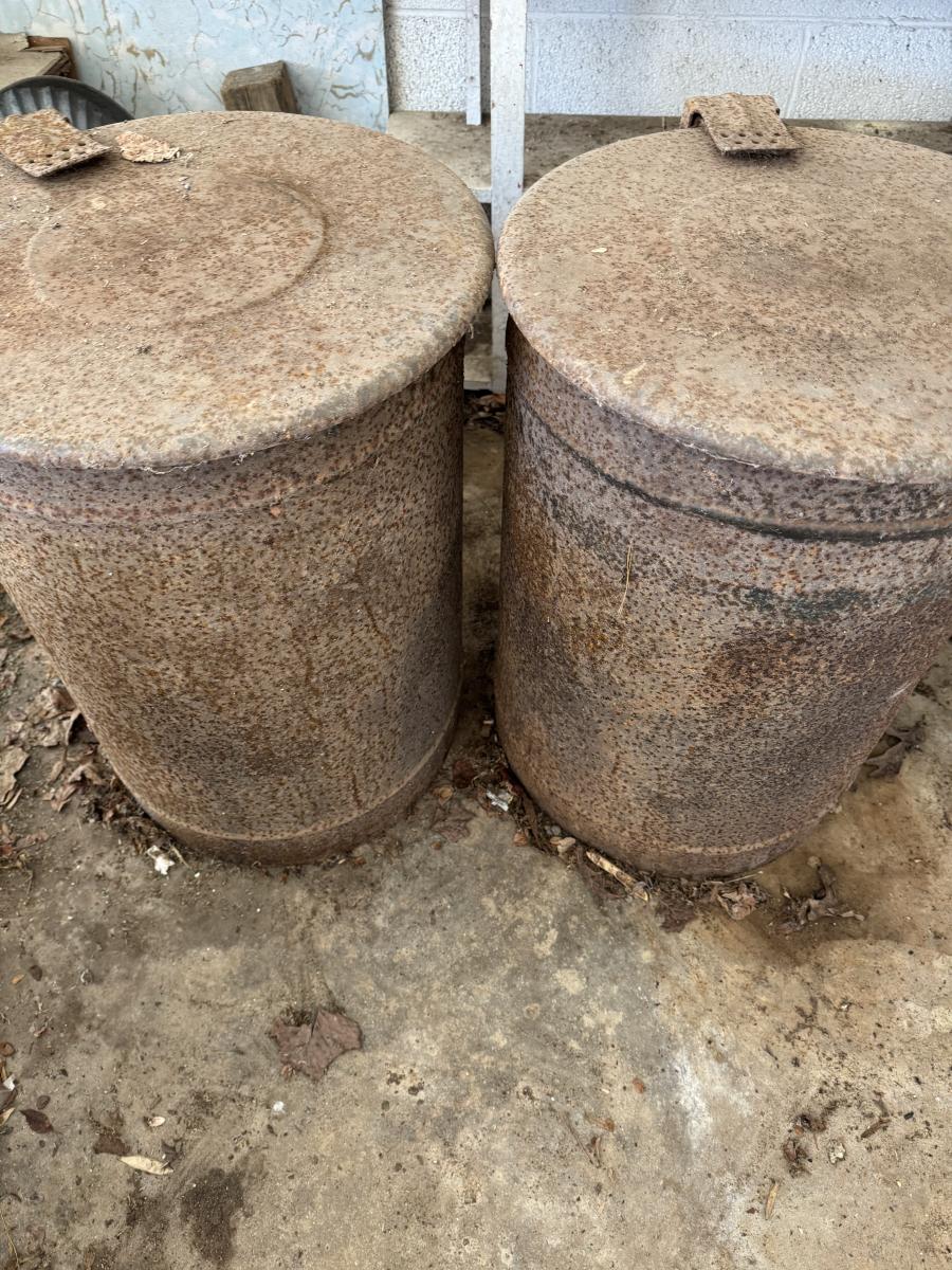 Two vintage rusty metal trashcan holders.