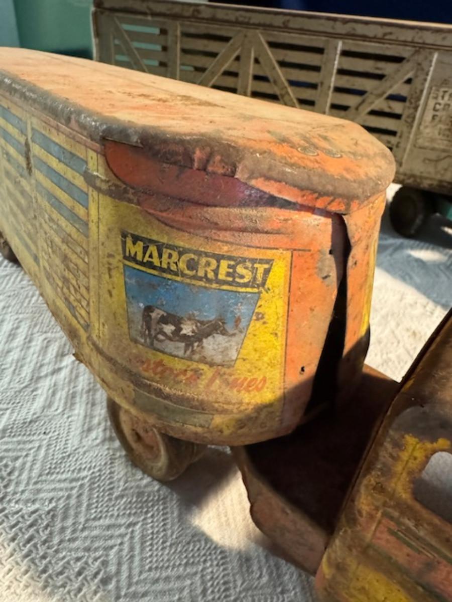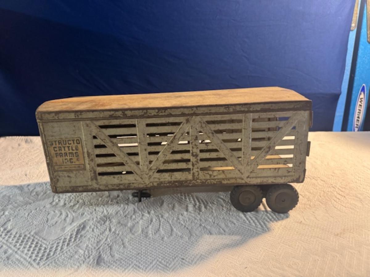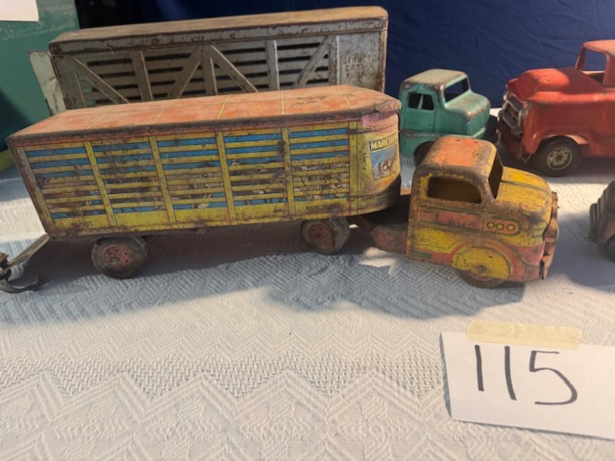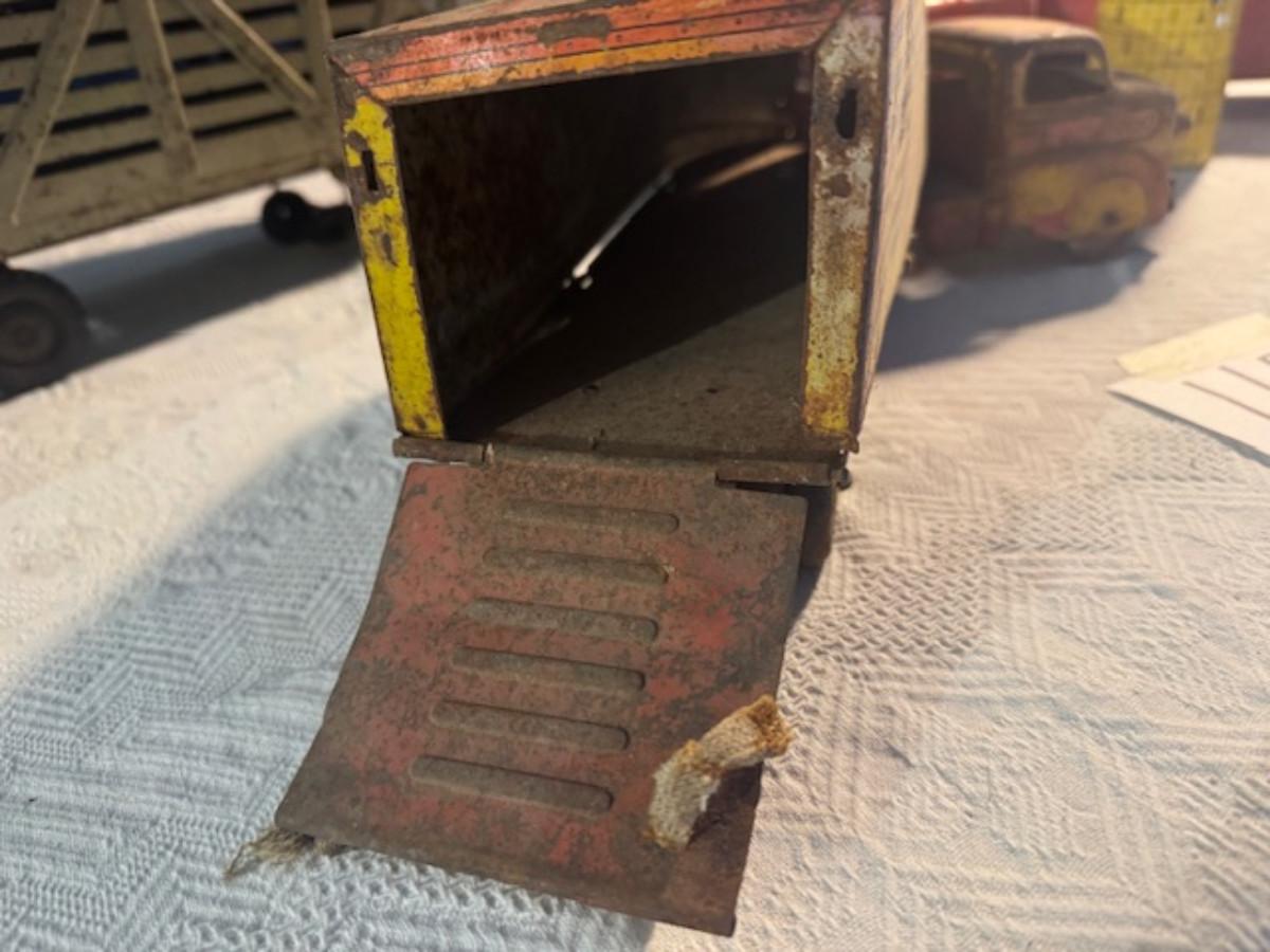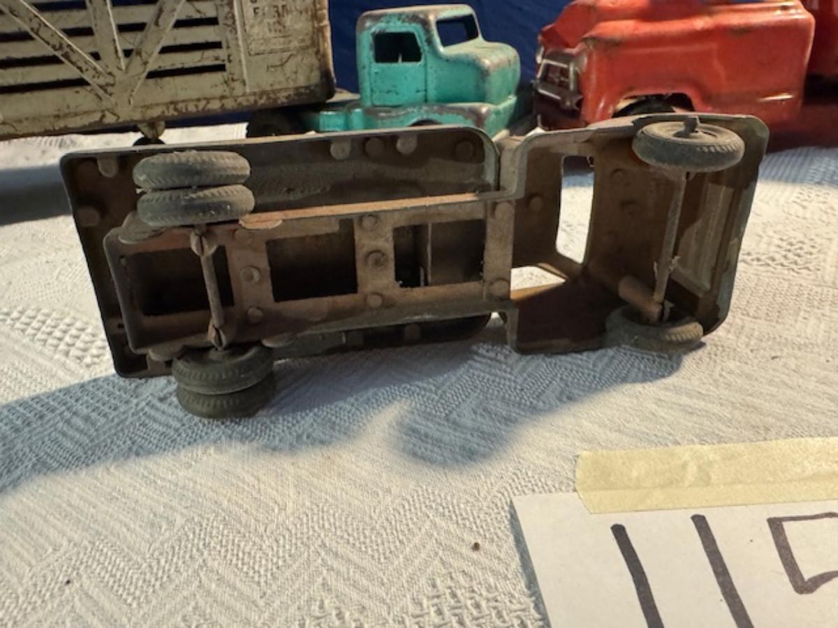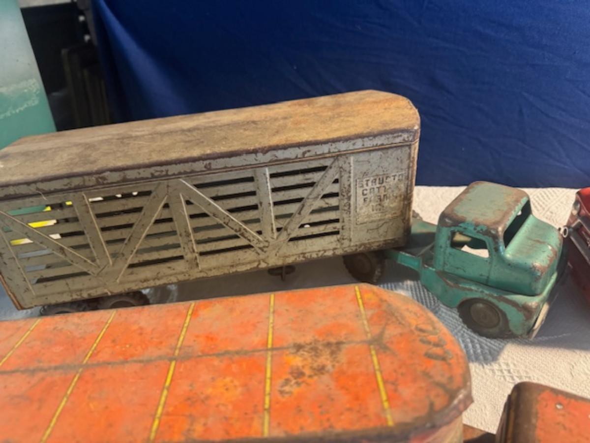 As found Structo Cattle Farms Inc 23" x 5 1/4" x 7.5" (half of back door is missing). Red Truck 22.5" x 5.5" x 6". Marcrest 17" x 4" x 5.5" back door doesn't stay shut, top of trailer isn't secure, part comes up when moved and someone wrote Lana on the side. Small brown truck 8.5" x 3" x 3"