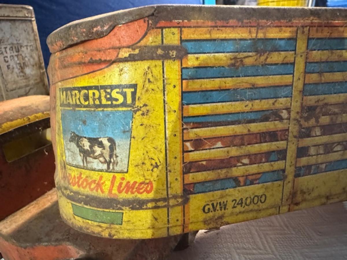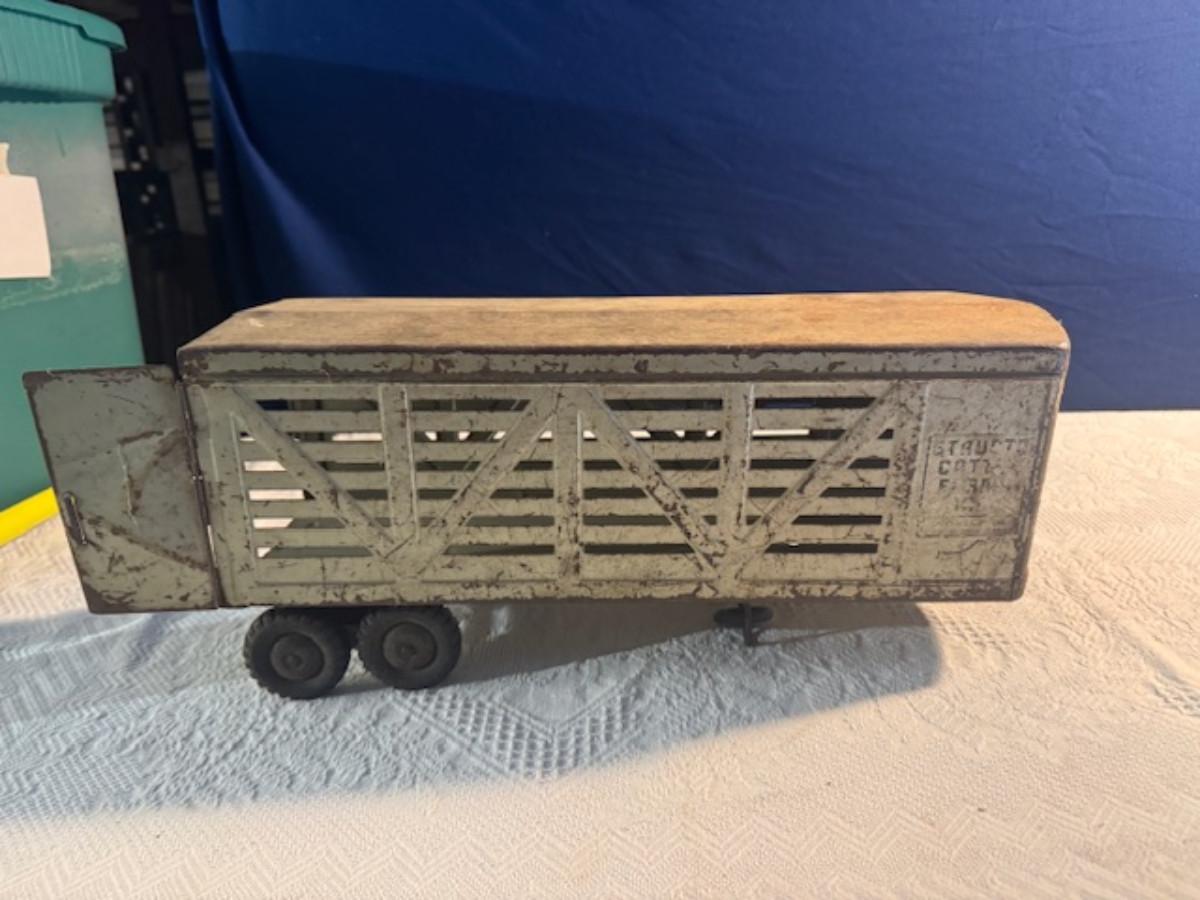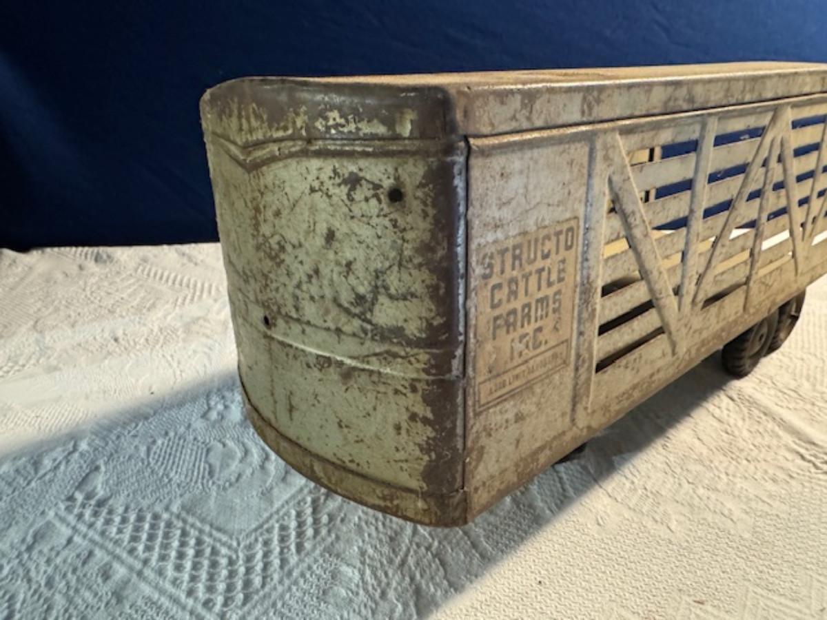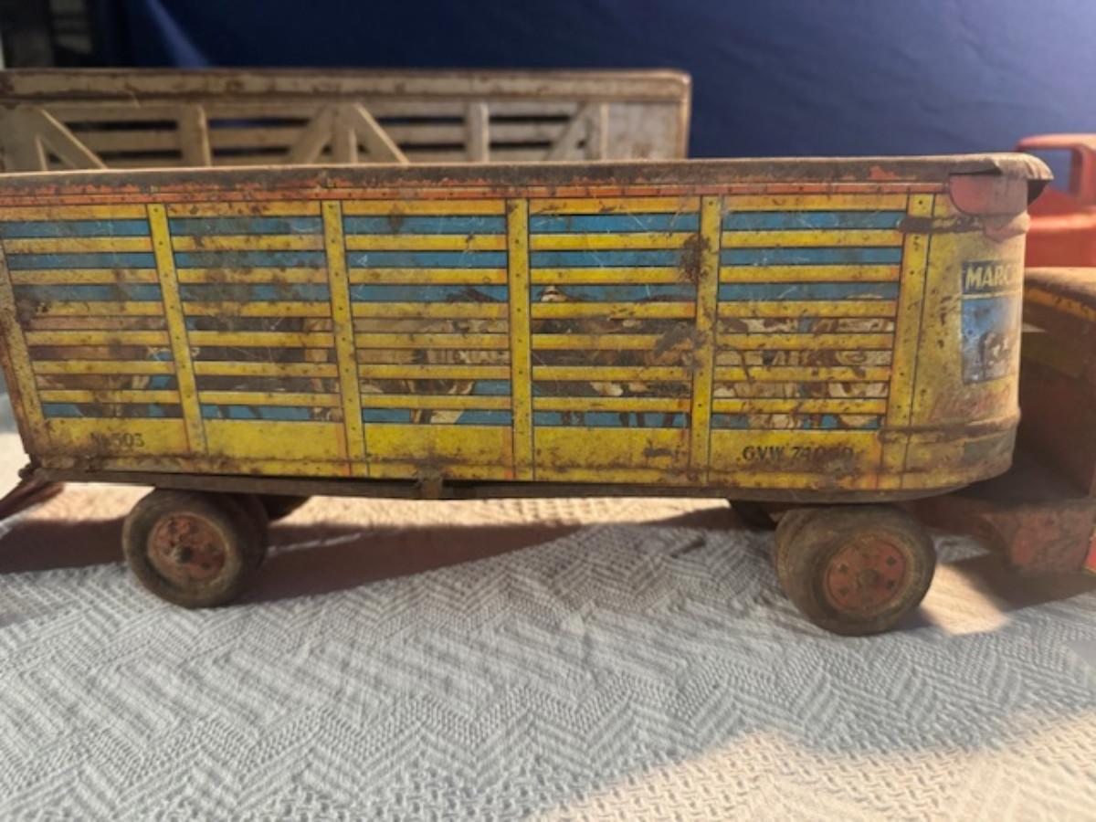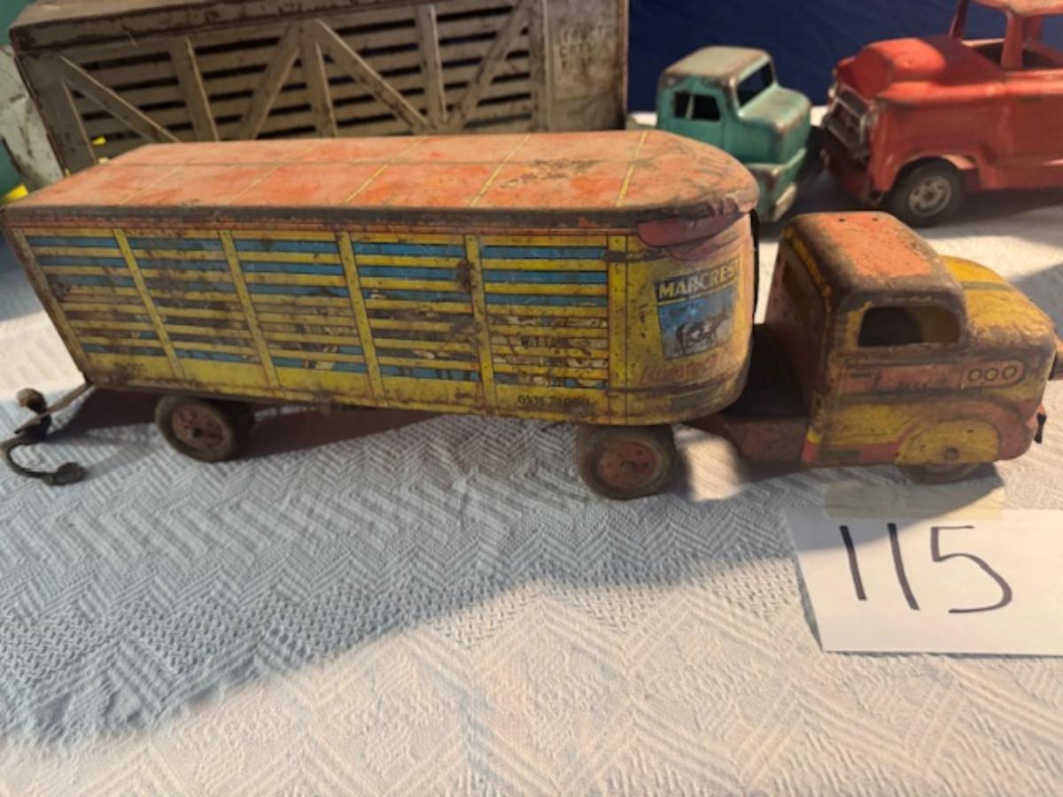 As found Structo Cattle Farms Inc 23" x 5 1/4" x 7.5" (half of back door is missing). Red Truck 22.5" x 5.5" x 6". Marcrest 17" x 4" x 5.5" back door doesn't stay shut, top of trailer isn't secure, part comes up when moved and someone wrote Lana on the side. Small brown truck 8.5" x 3" x 3"