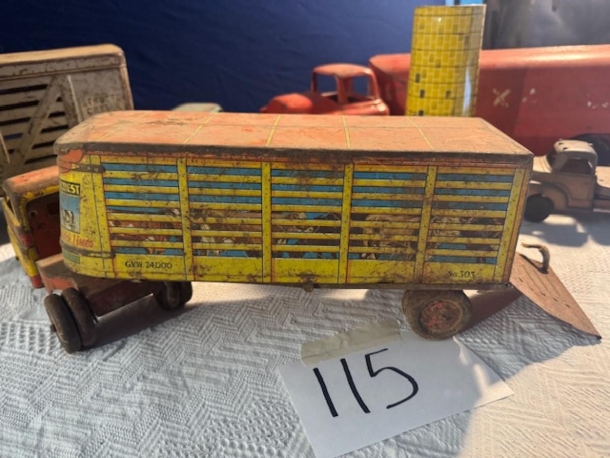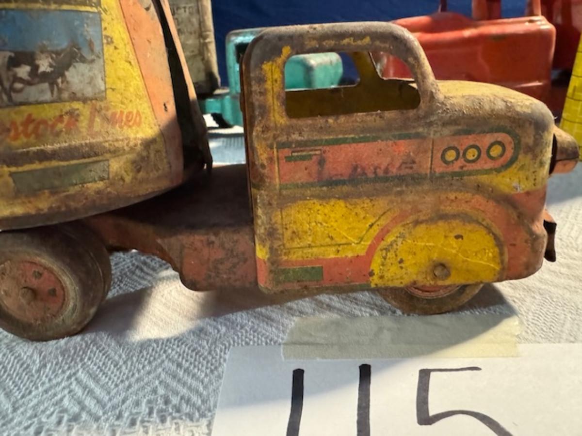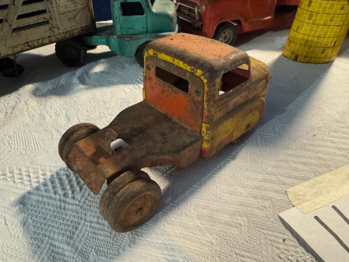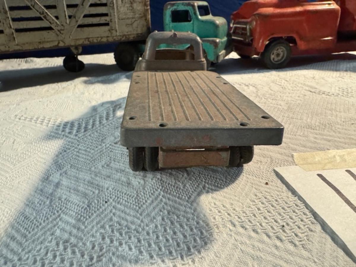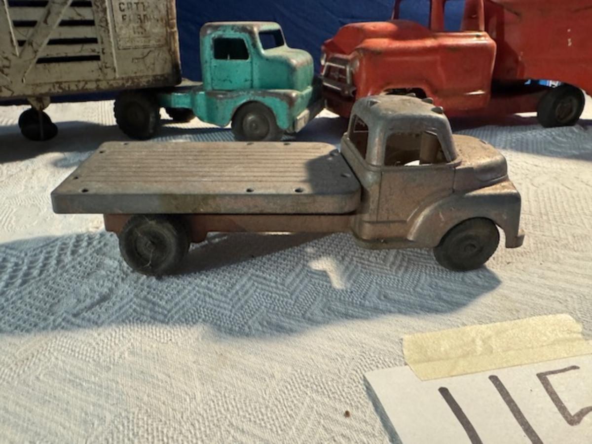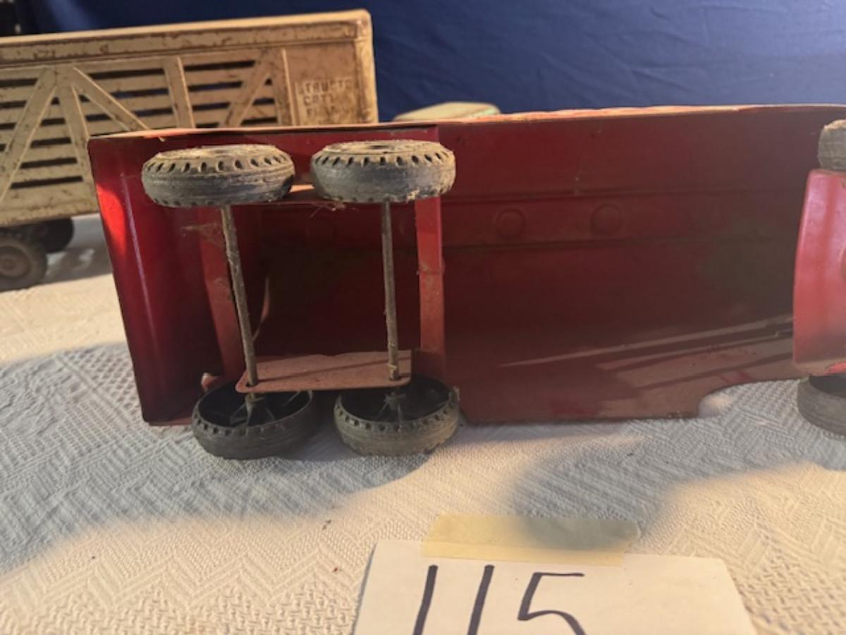As found Structo Cattle Farms Inc 23" x 5 1/4" x 7.5" (half of back door is missing). Red Truck 22.5" x 5.5" x 6". Marcrest 17" x 4" x 5.5" back door doesn't stay shut, top of trailer isn't secure, part comes up when moved and someone wrote Lana on the side. Small brown truck 8.5" x 3" x 3"