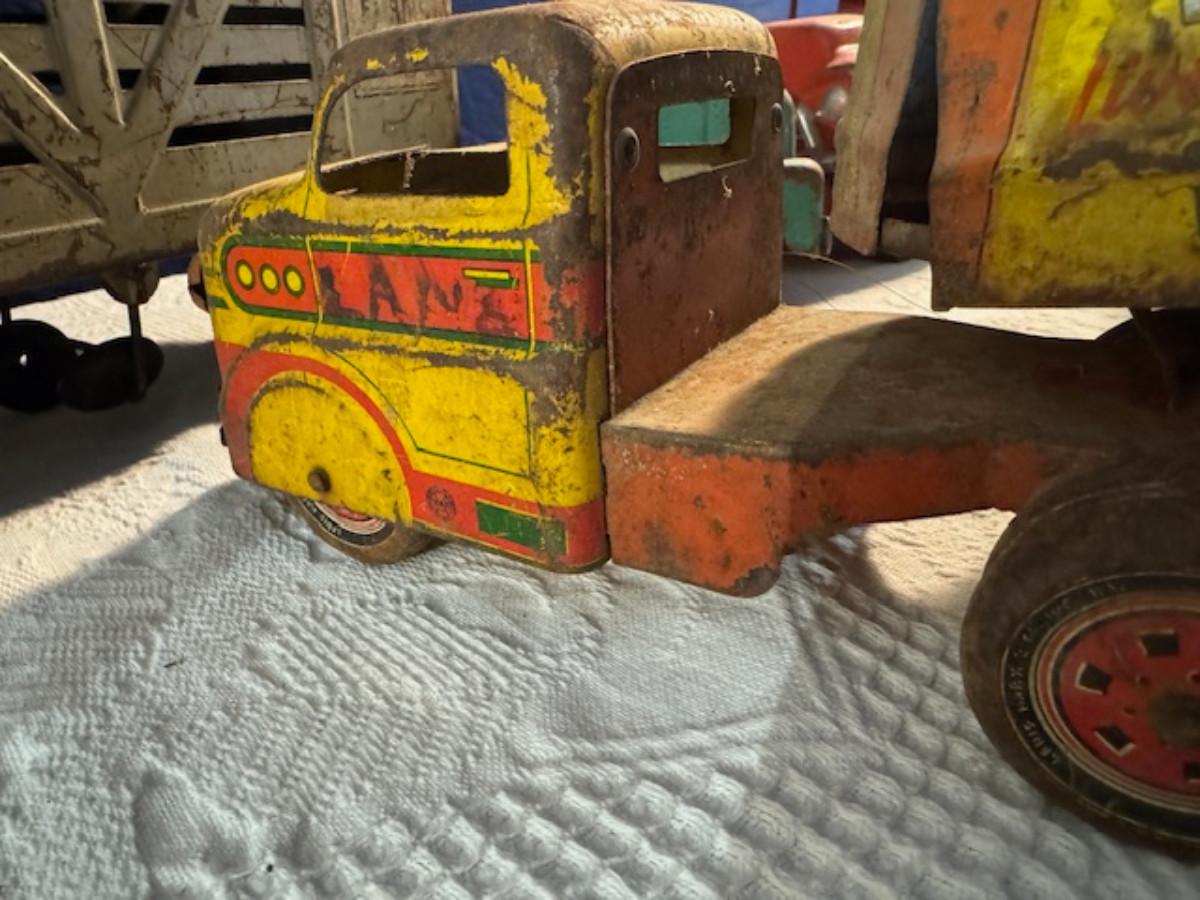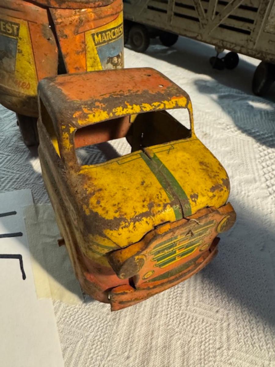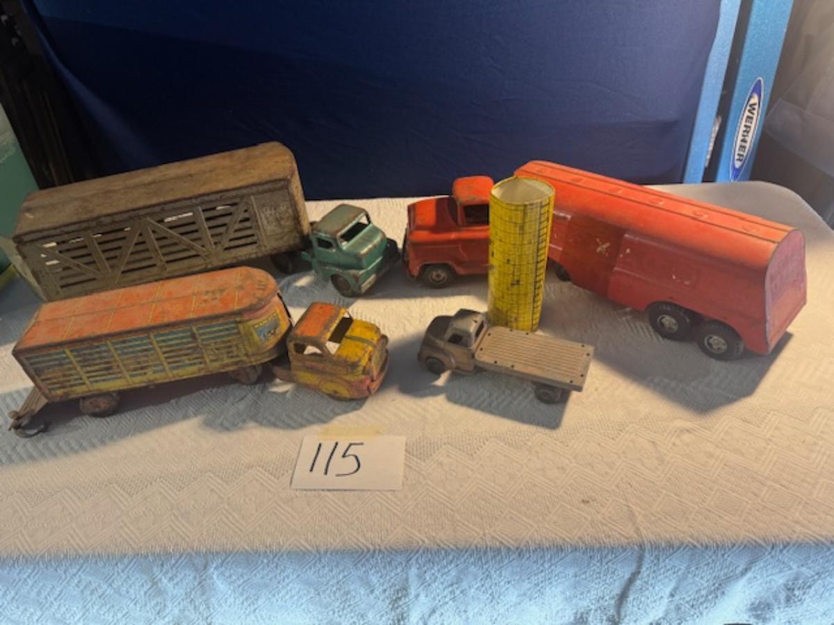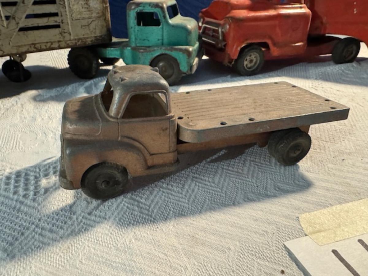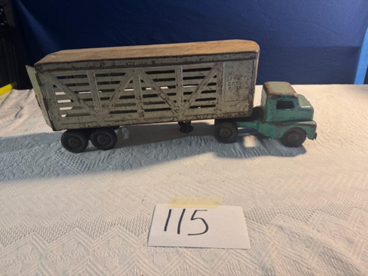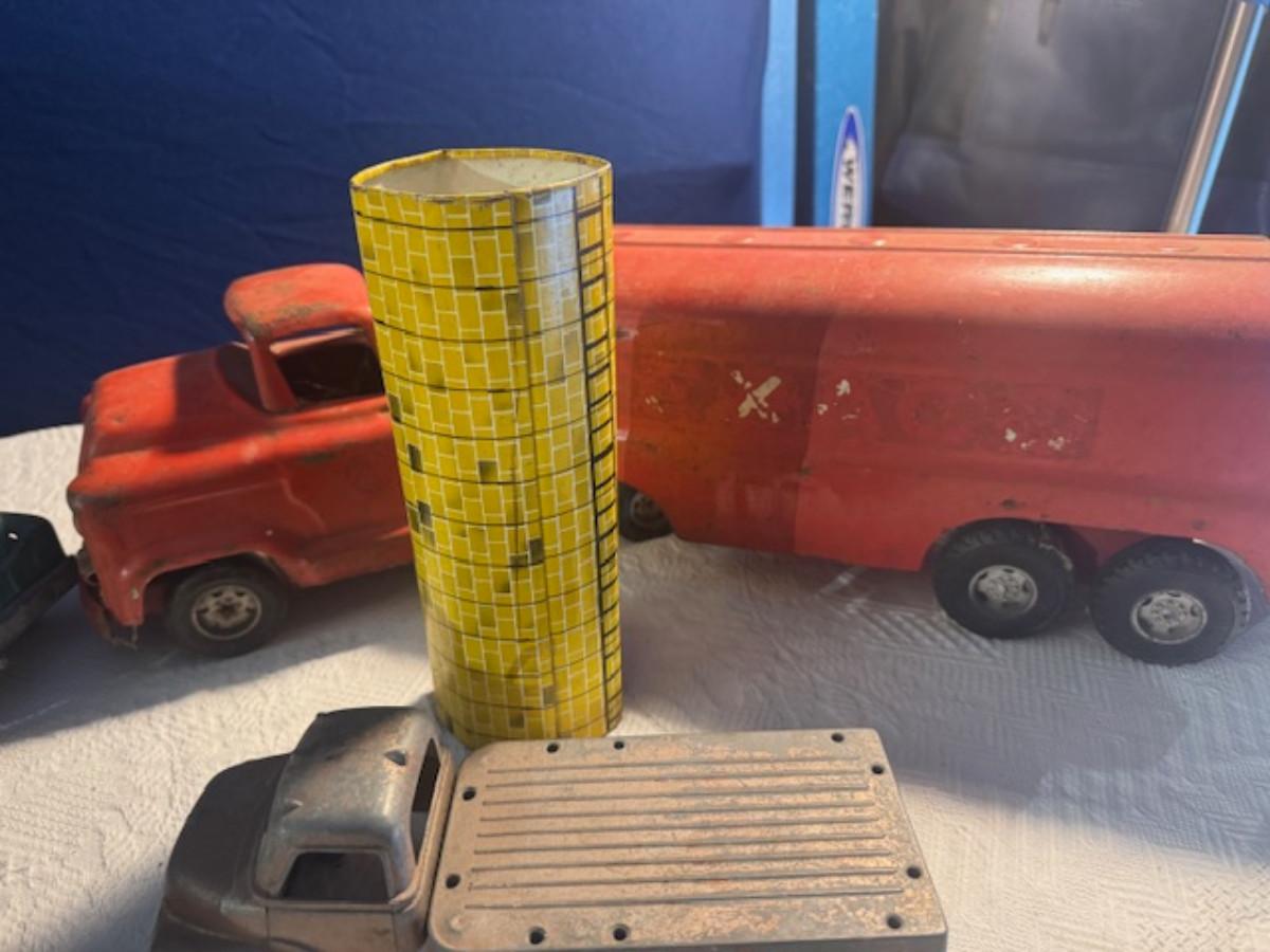 As found Structo Cattle Farms Inc 23" x 5 1/4" x 7.5" (half of back door is missing). Red Truck 22.5" x 5.5" x 6". Marcrest 17" x 4" x 5.5" back door doesn't stay shut, top of trailer isn't secure, part comes up when moved and someone wrote Lana on the side. Small brown truck 8.5" x 3" x 3"