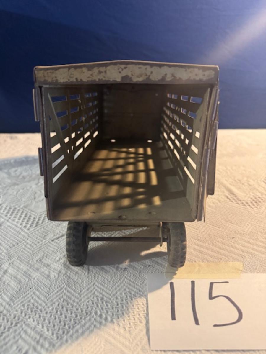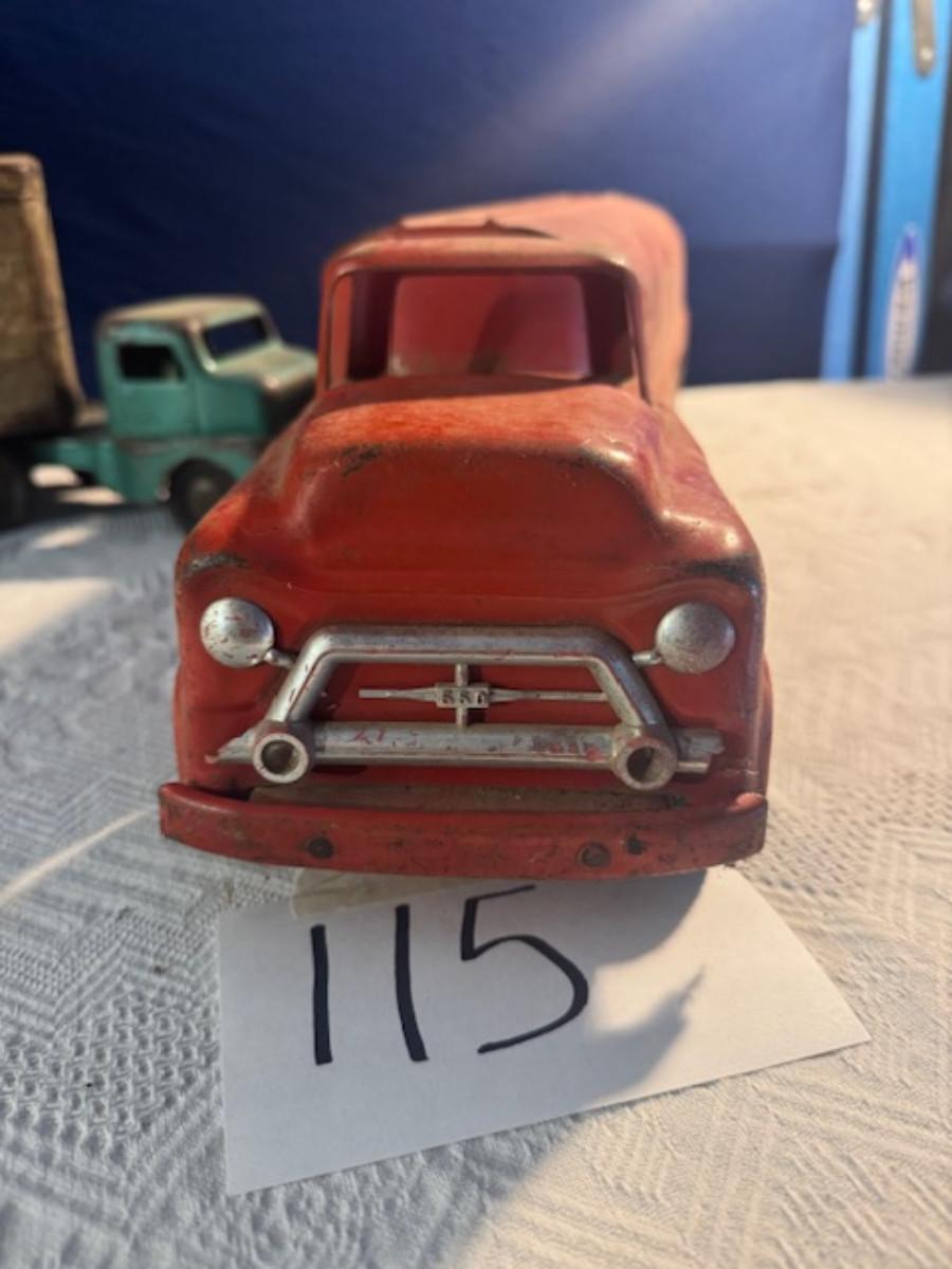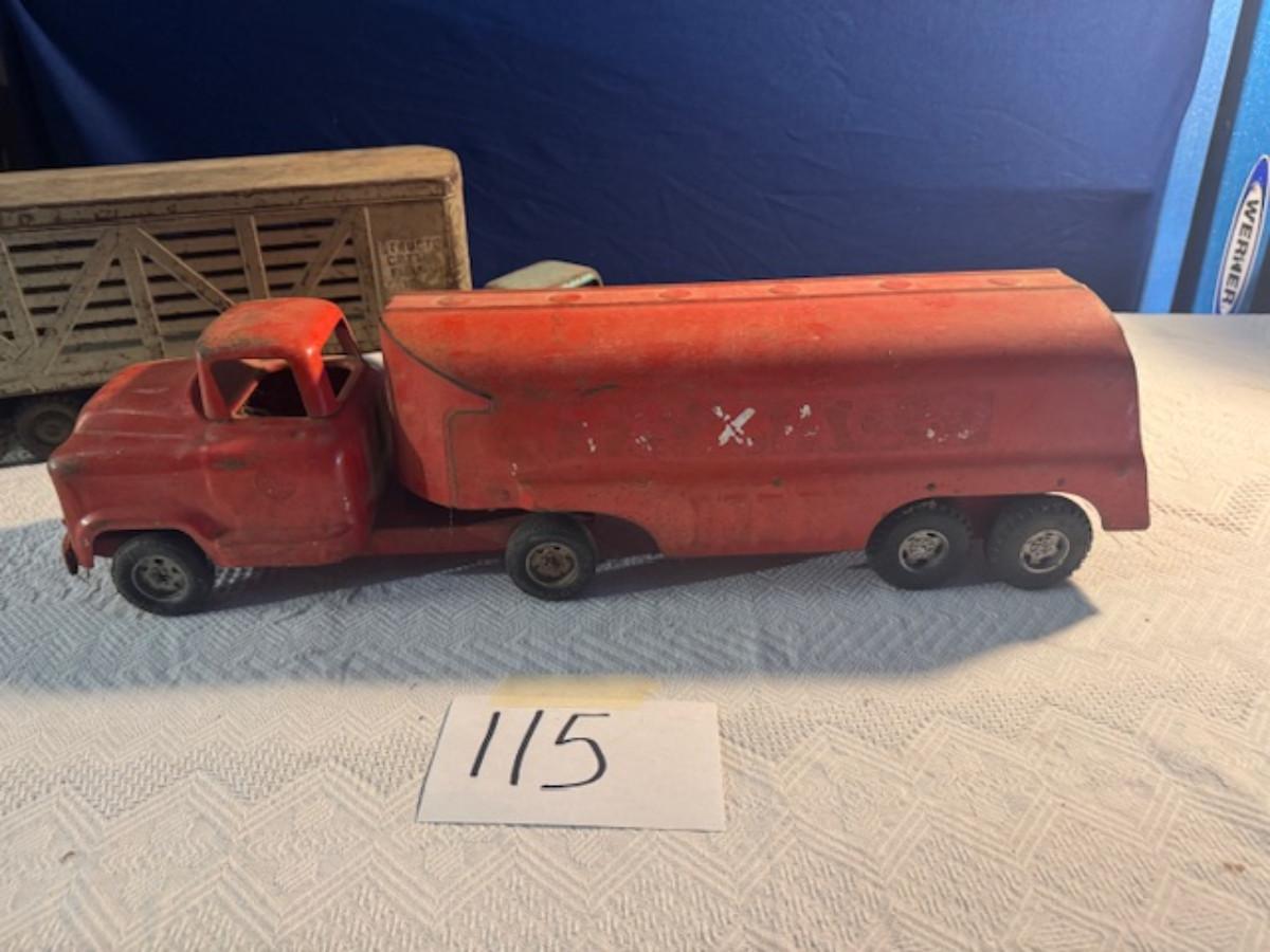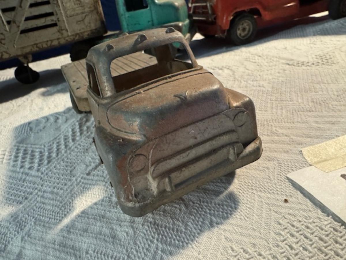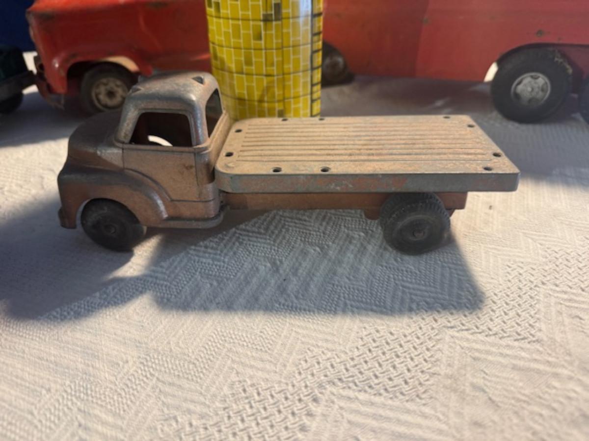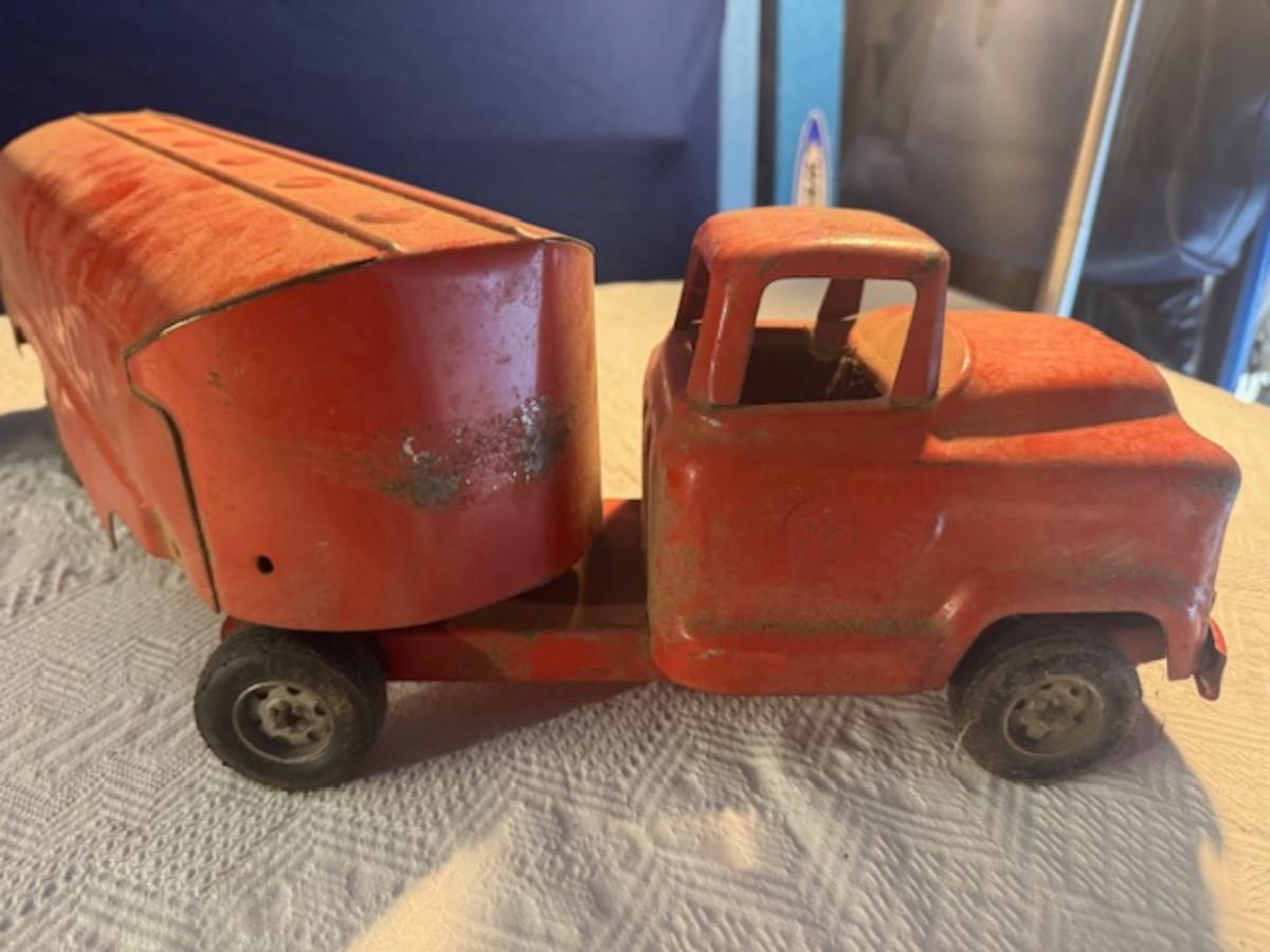 As found Structo Cattle Farms Inc 23" x 5 1/4" x 7.5" (half of back door is missing). Red Truck 22.5" x 5.5" x 6". Marcrest 17" x 4" x 5.5" back door doesn't stay shut, top of trailer isn't secure, part comes up when moved and someone wrote Lana on the side. Small brown truck 8.5" x 3" x 3"