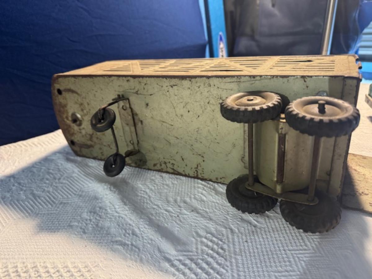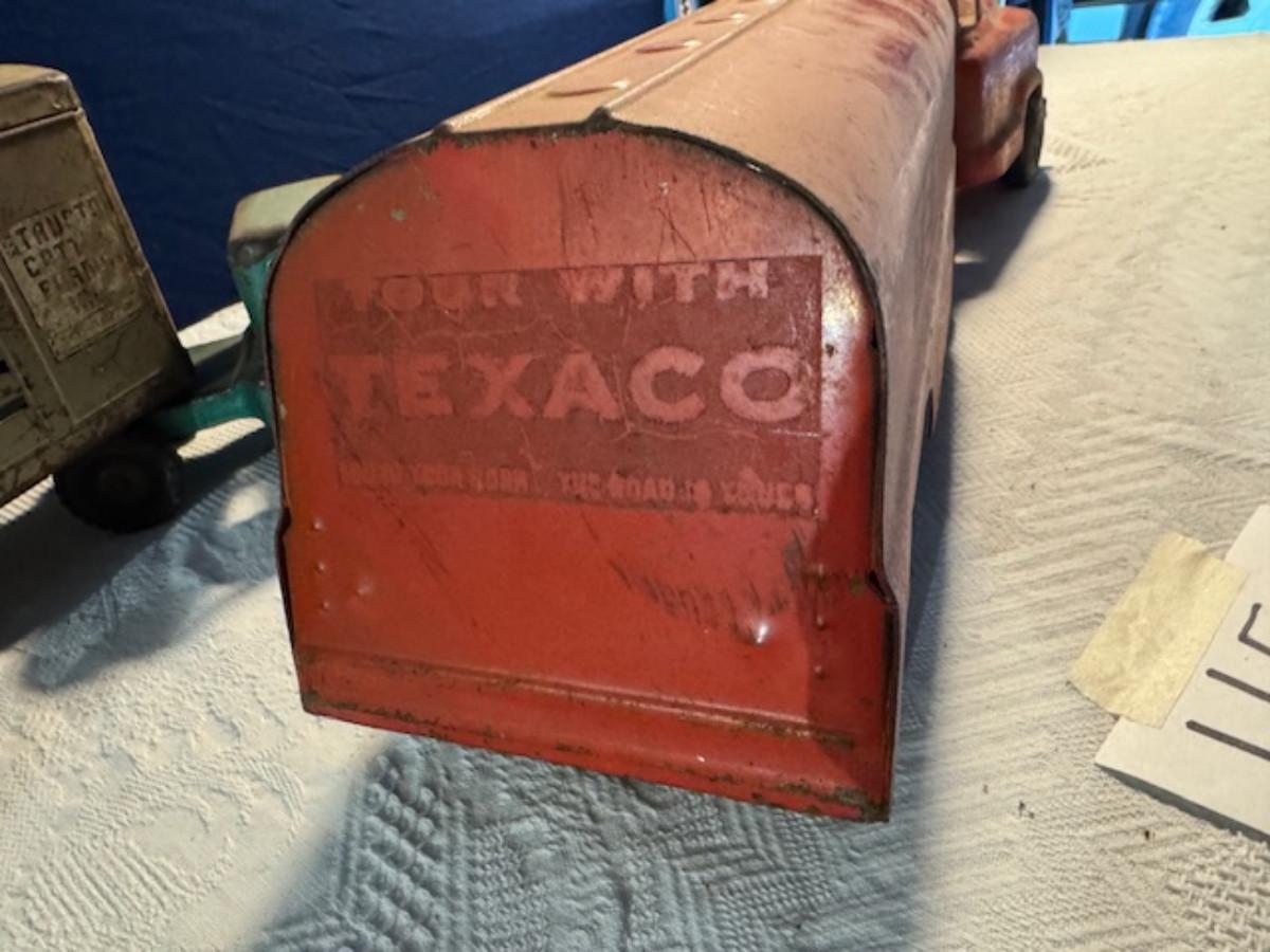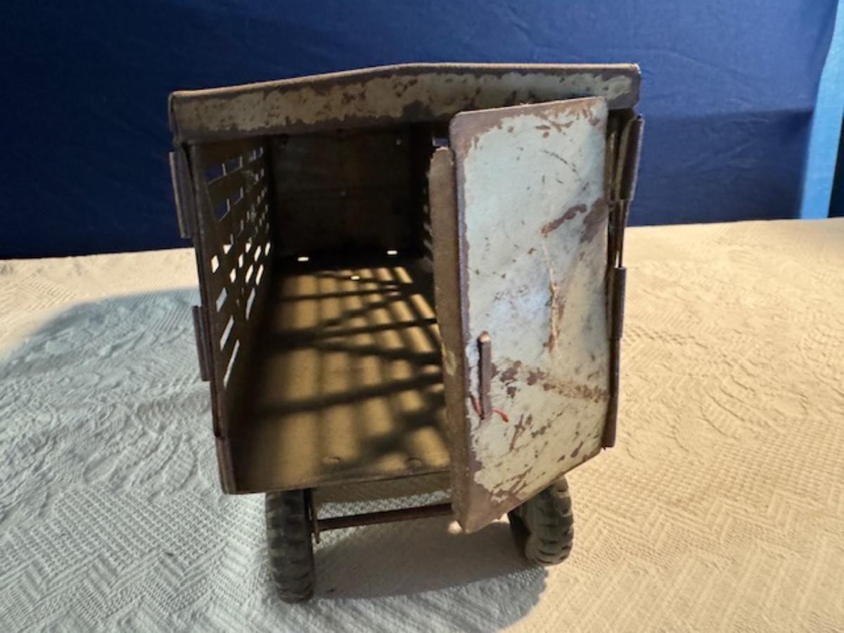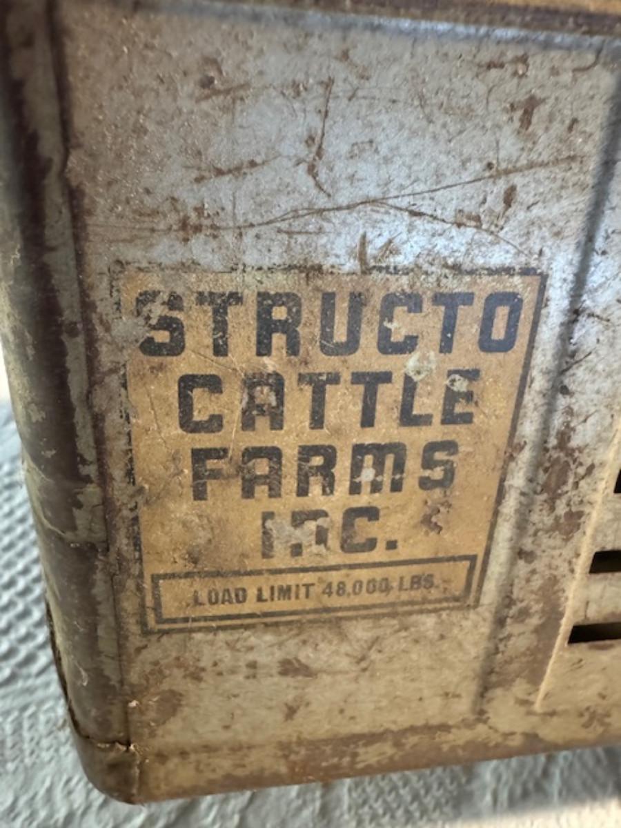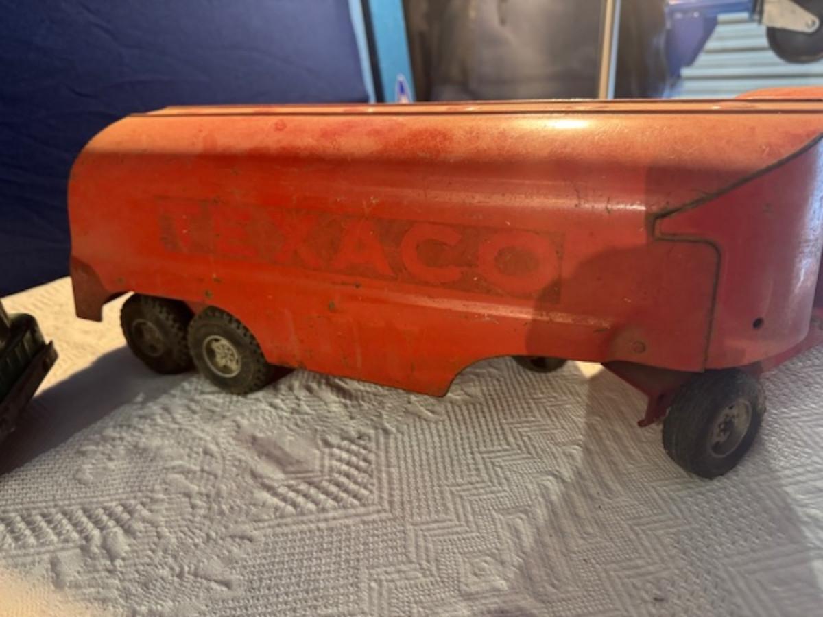 As found Structo Cattle Farms Inc 23" x 5 1/4" x 7.5" (half of back door is missing). Red Truck 22.5" x 5.5" x 6". Marcrest 17" x 4" x 5.5" back door doesn't stay shut, top of trailer isn't secure, part comes up when moved and someone wrote Lana on the side. Small brown truck 8.5" x 3" x 3"