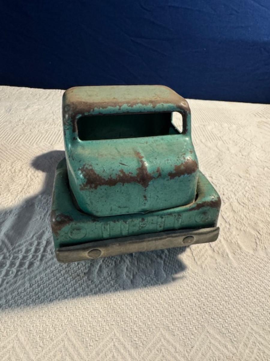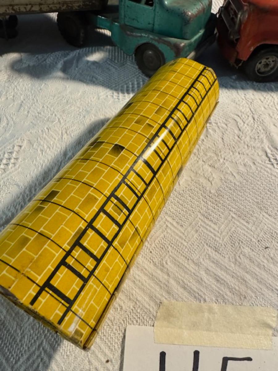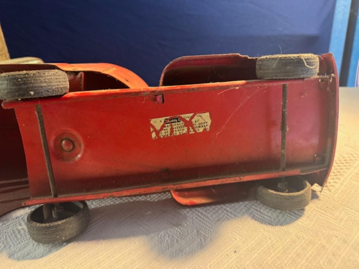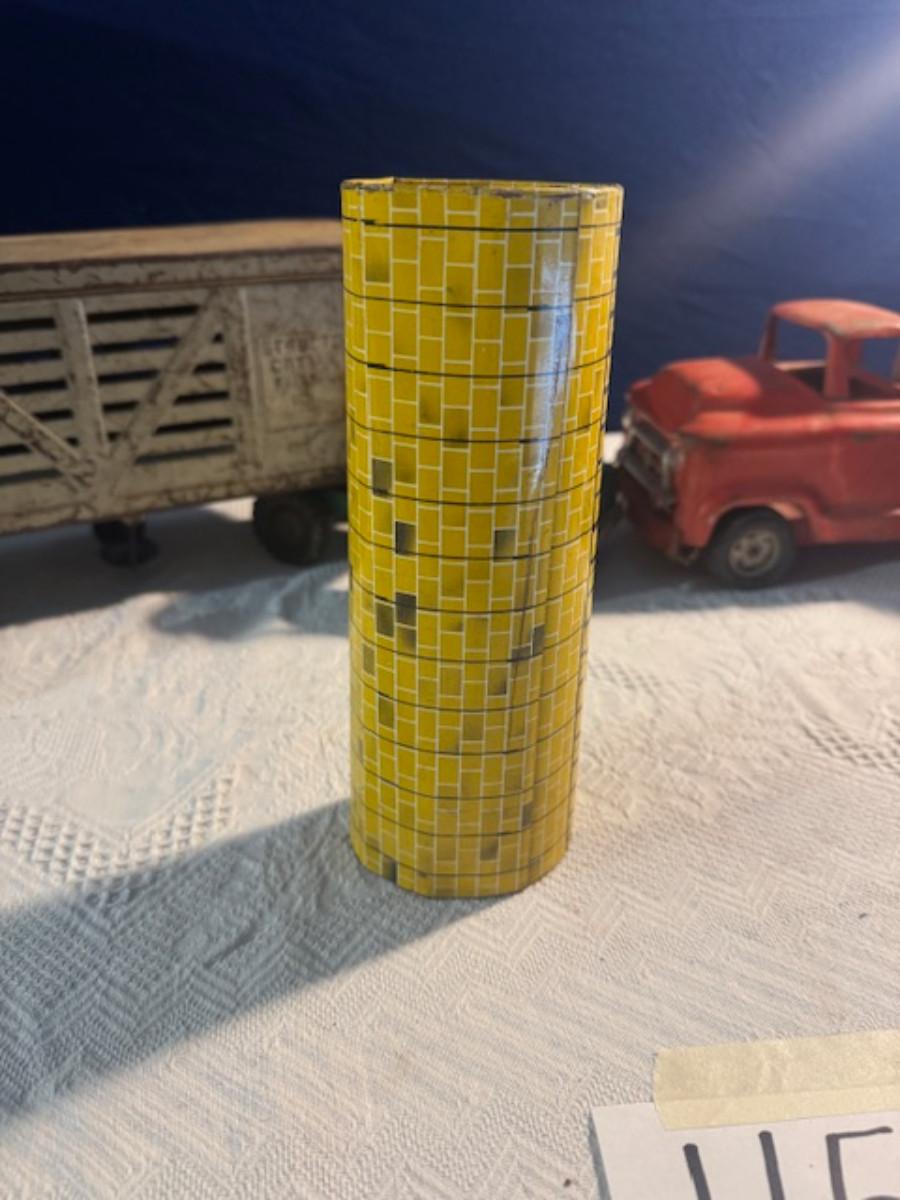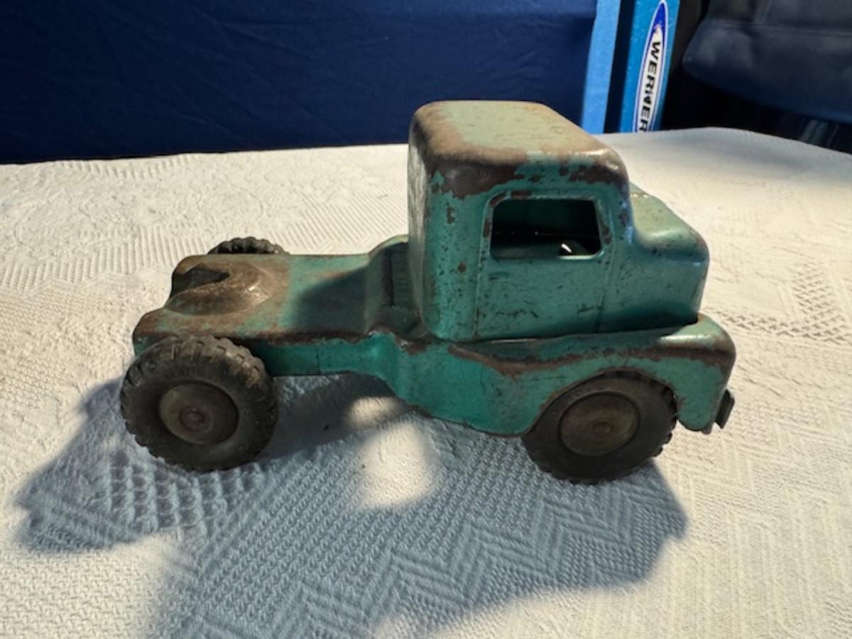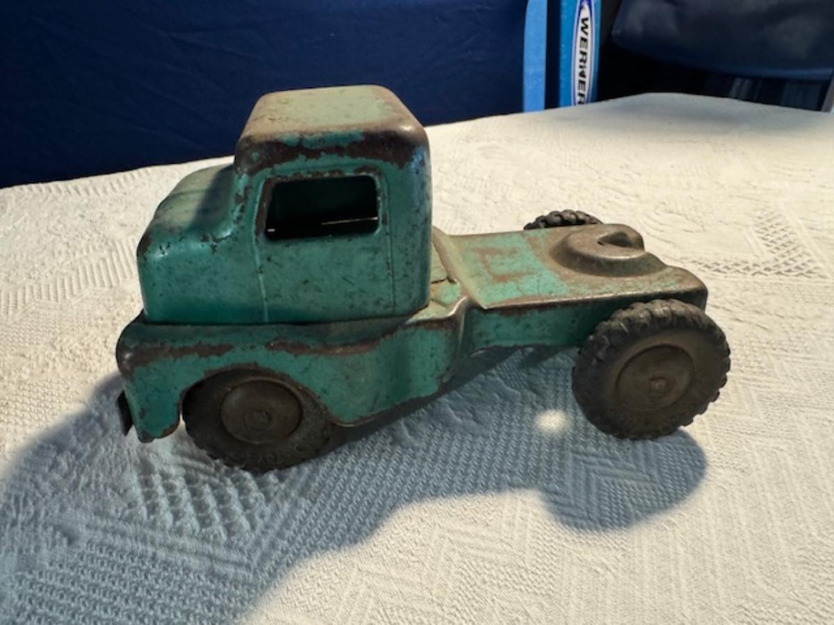 As found Structo Cattle Farms Inc 23" x 5 1/4" x 7.5" (half of back door is missing). Red Truck 22.5" x 5.5" x 6". Marcrest 17" x 4" x 5.5" back door doesn't stay shut, top of trailer isn't secure, part comes up when moved and someone wrote Lana on the side. Small brown truck 8.5" x 3" x 3"