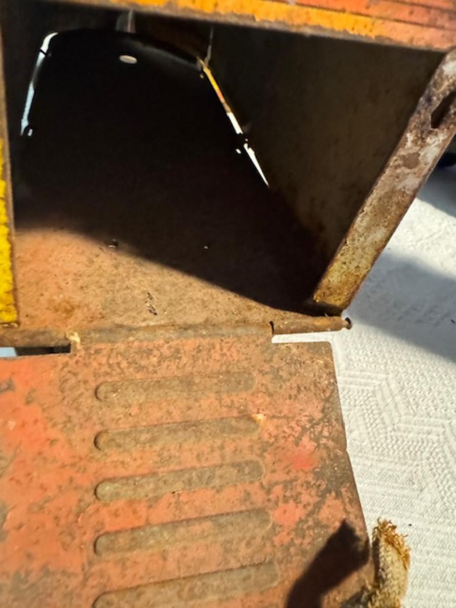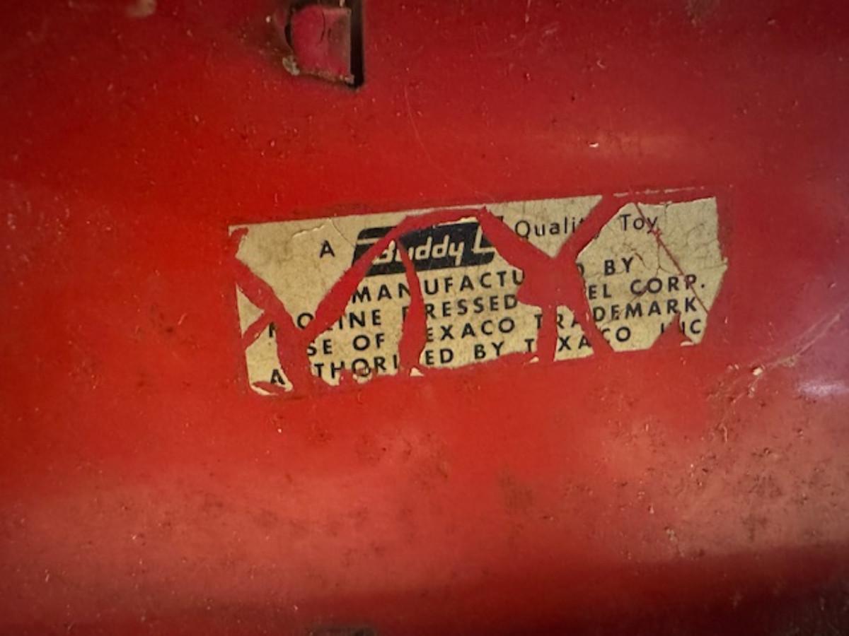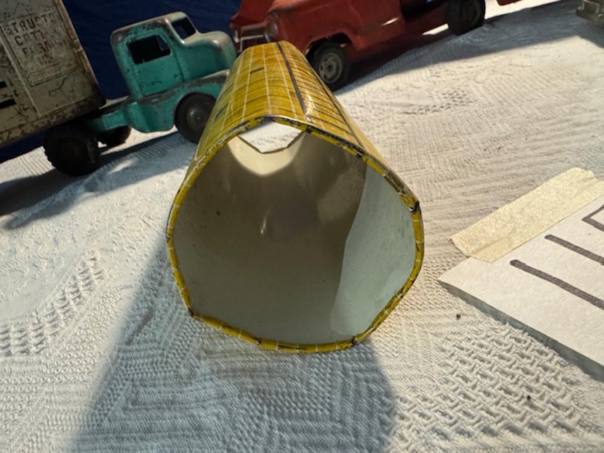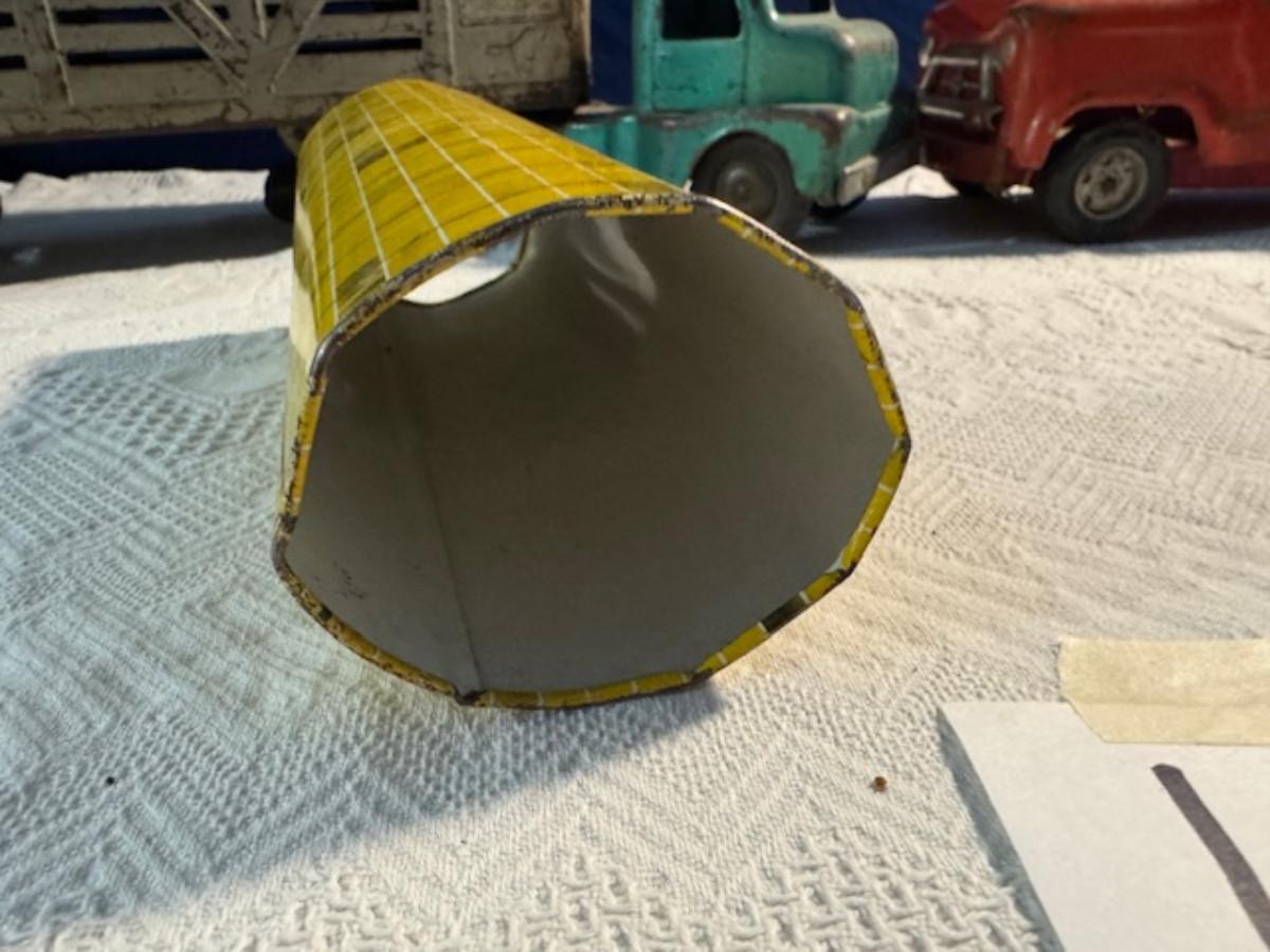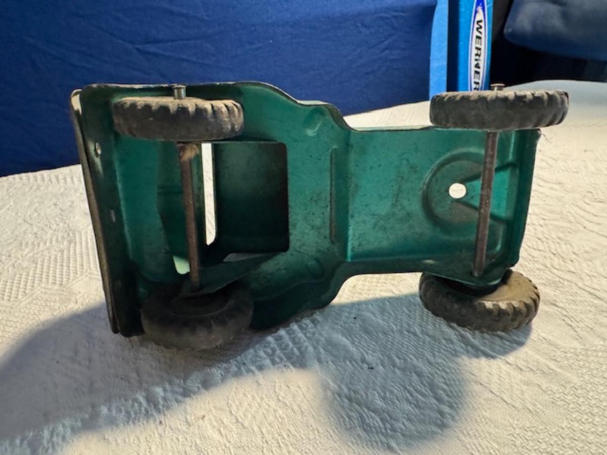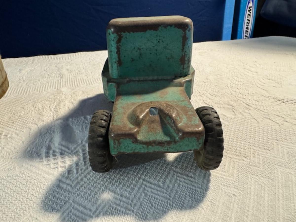 As found Structo Cattle Farms Inc 23" x 5 1/4" x 7.5" (half of back door is missing). Red Truck 22.5" x 5.5" x 6". Marcrest 17" x 4" x 5.5" back door doesn't stay shut, top of trailer isn't secure, part comes up when moved and someone wrote Lana on the side. Small brown truck 8.5" x 3" x 3"