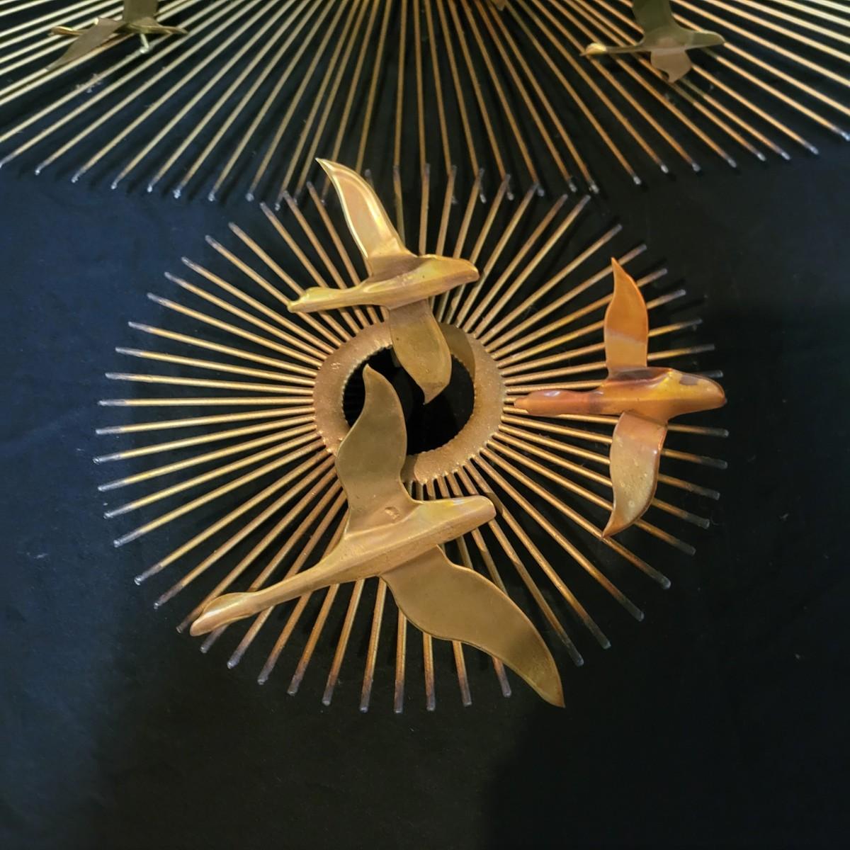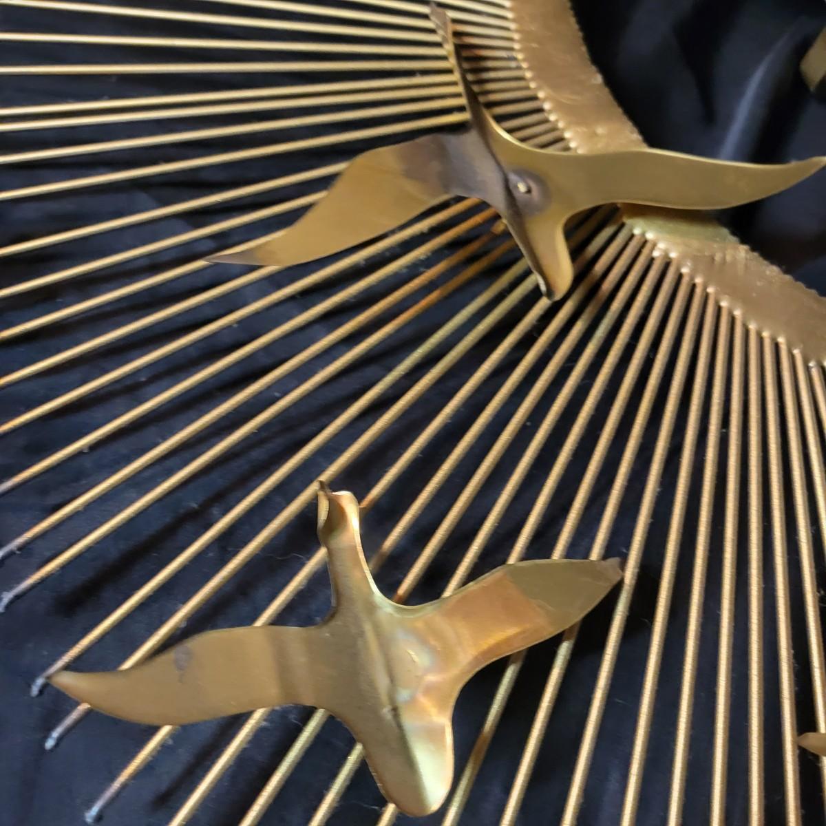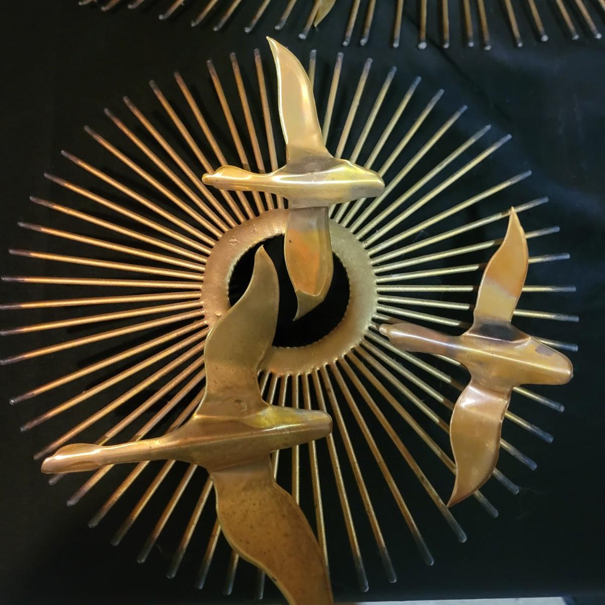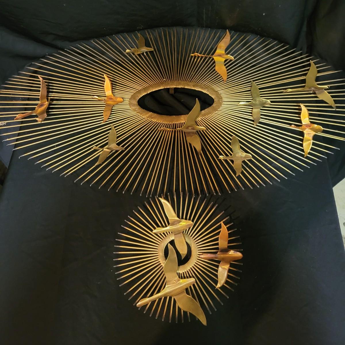A pair of vintage wall art pieces are made of metal. These pieces feature a starburst pattern with birds that have a gold finish with copper accents. Largest piece measures approximately 38" x 20" x 2"H. Local pickup only