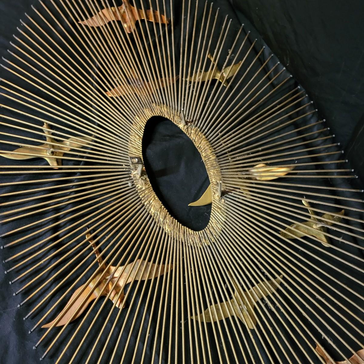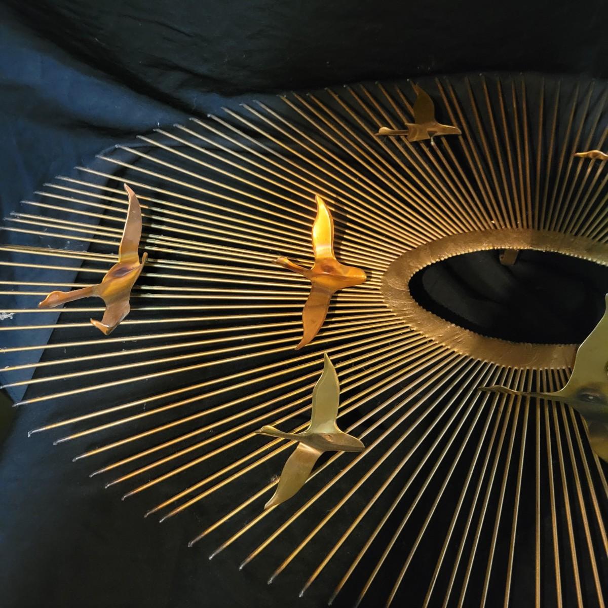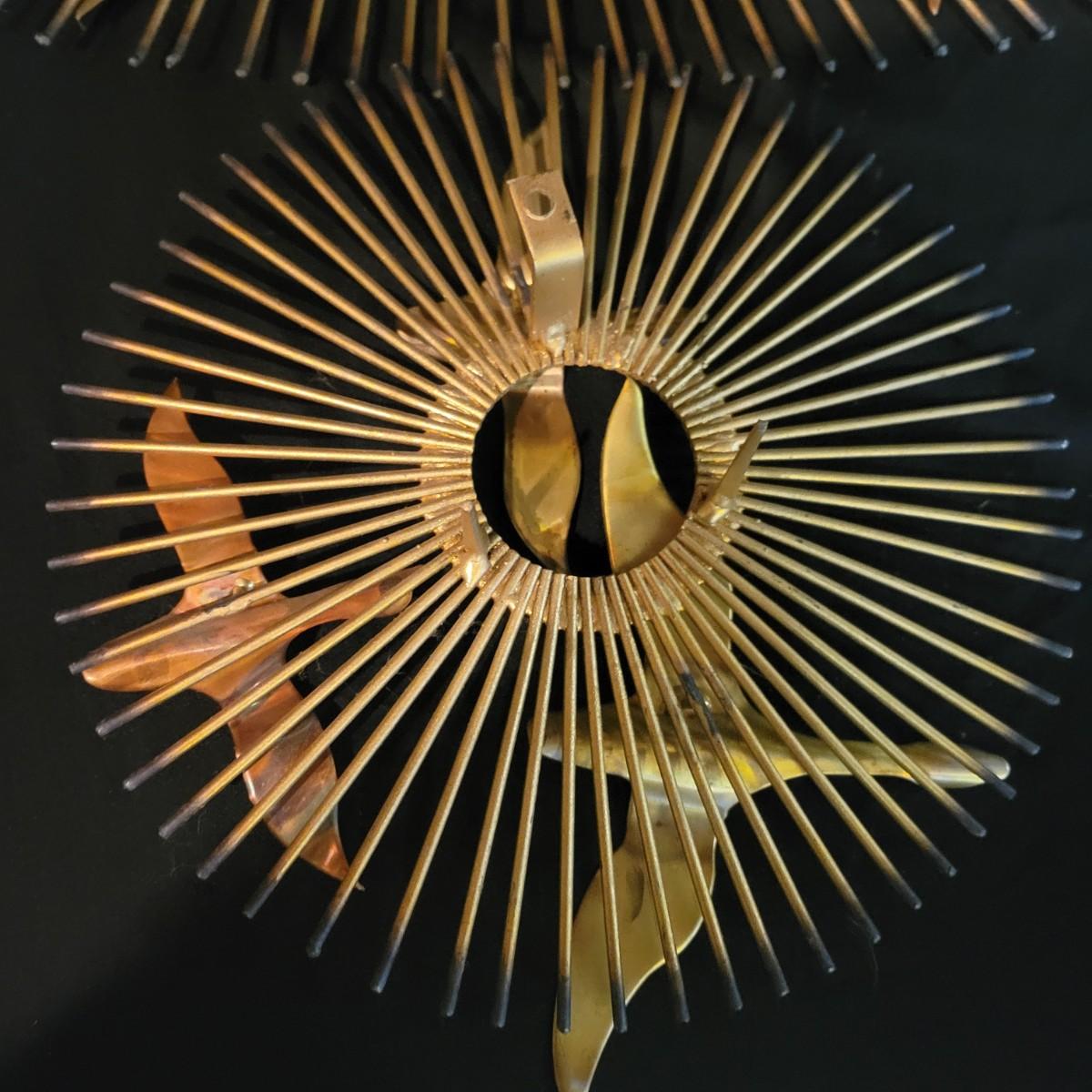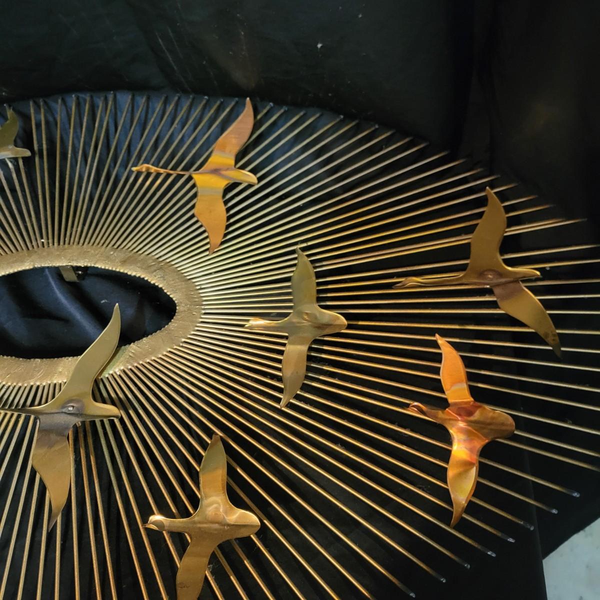 A pair of vintage wall art pieces are made of metal. These pieces feature a starburst pattern with birds that have a gold finish with copper accents. Largest piece measures approximately 38" x 20" x 2"H. Local pickup only