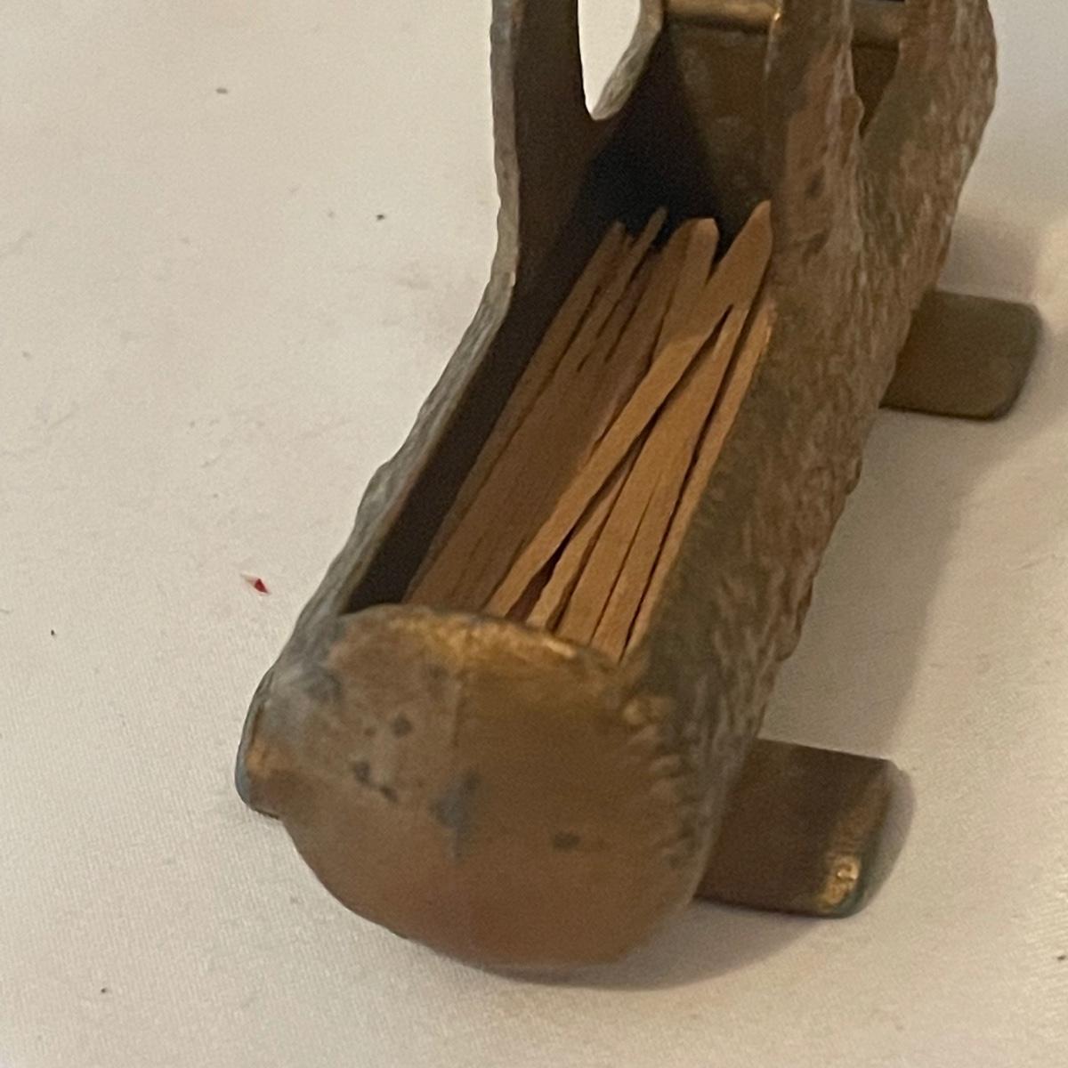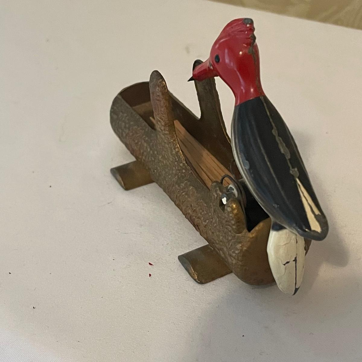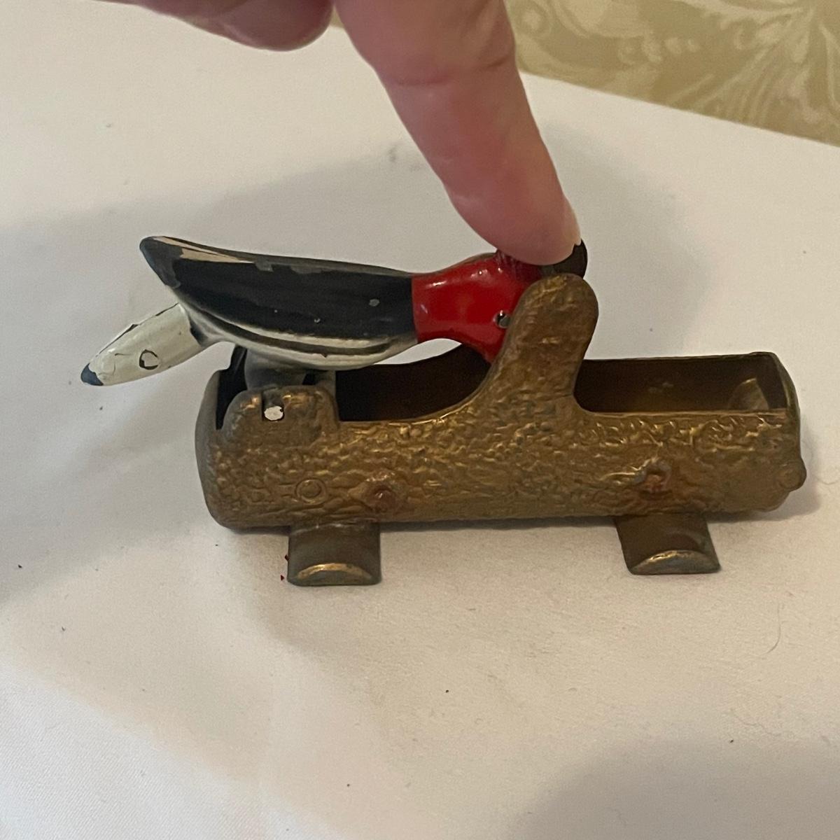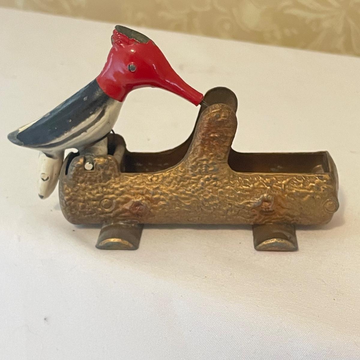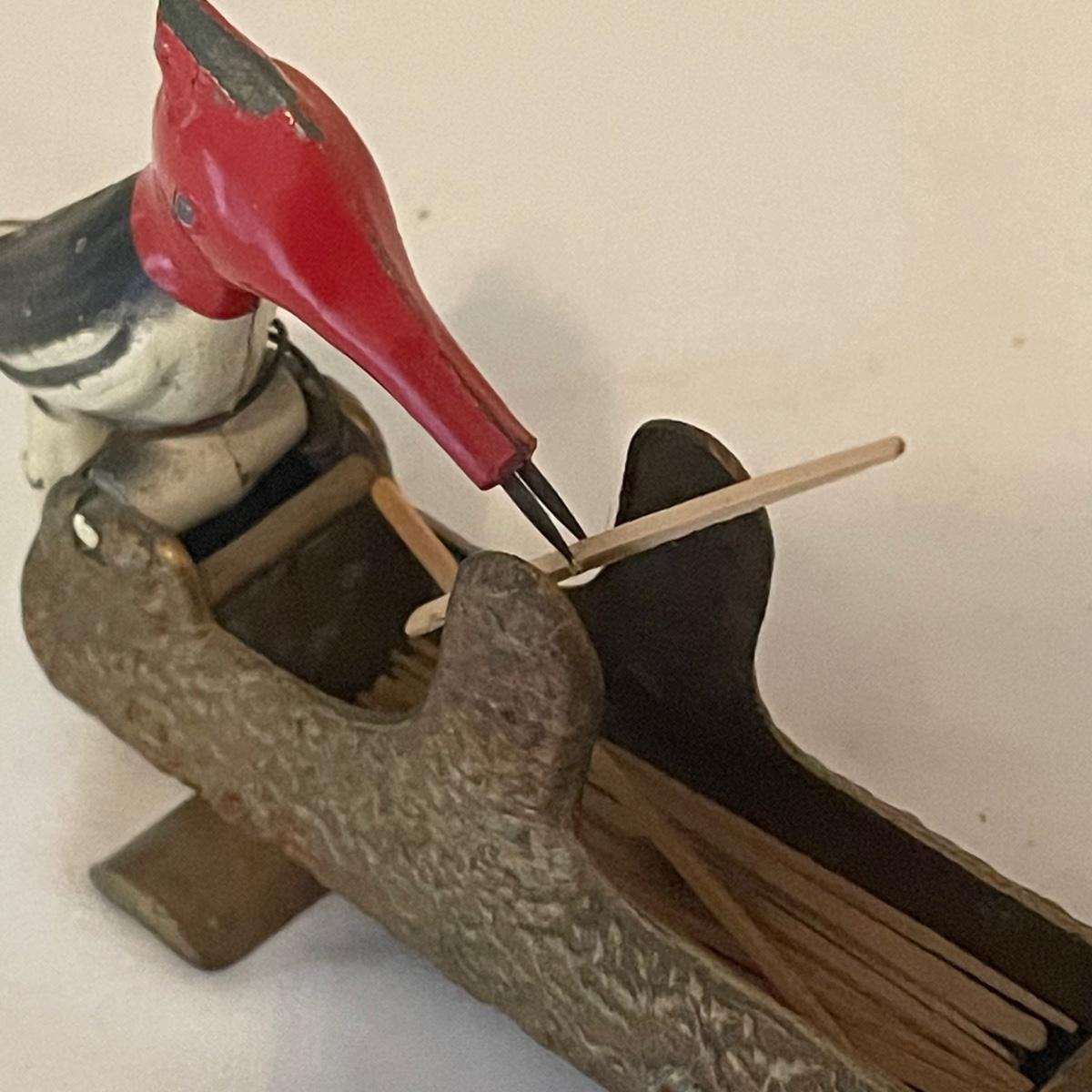 This unique collectible is a metal woodpecker with prongs on its beak that when pushed into the toothpick/log compartment conveniently grabs one toothpick.