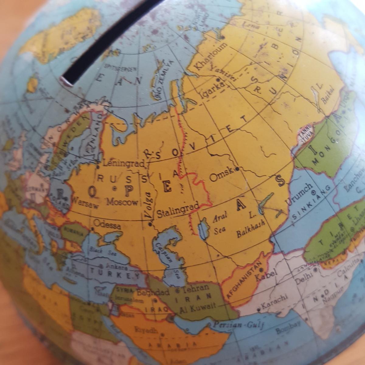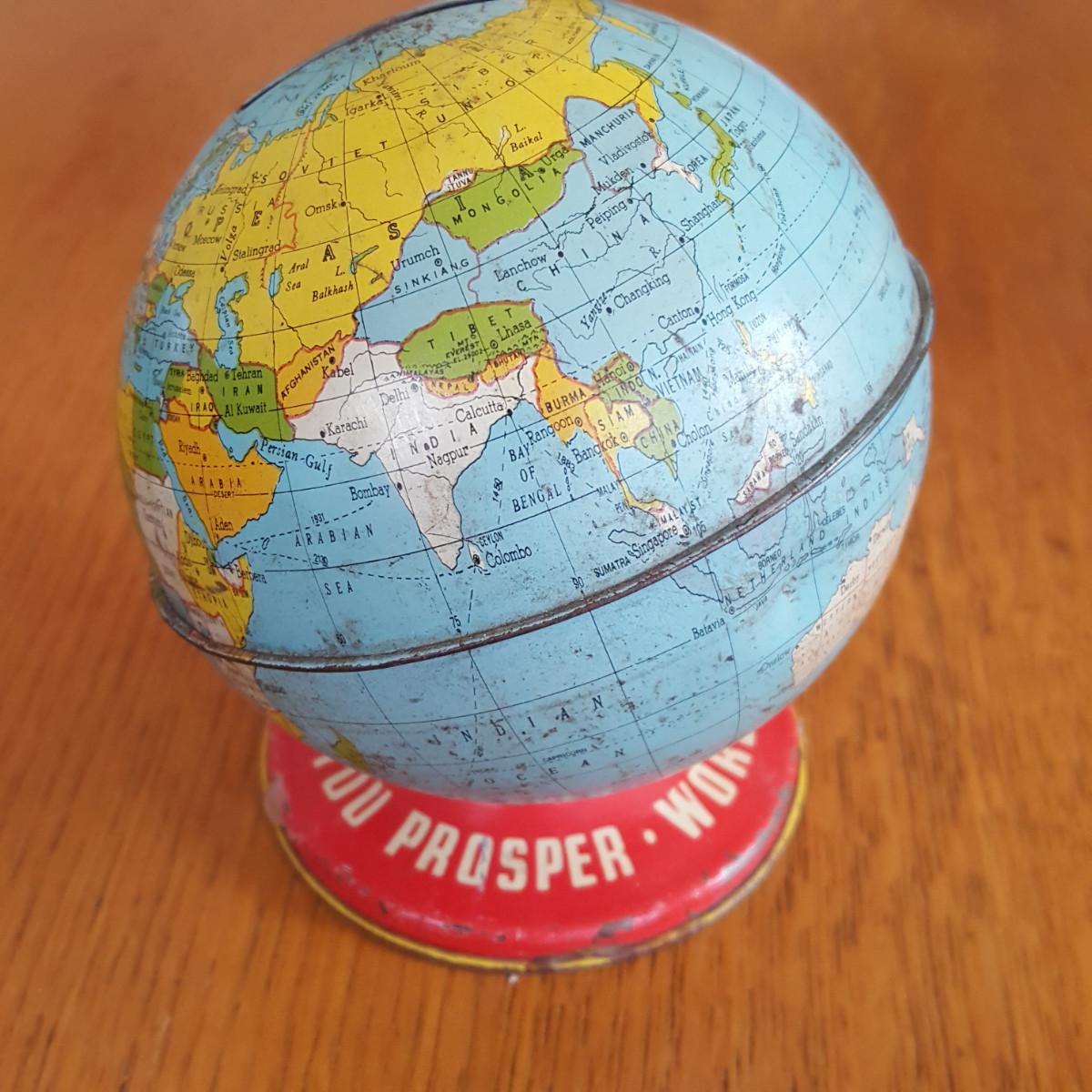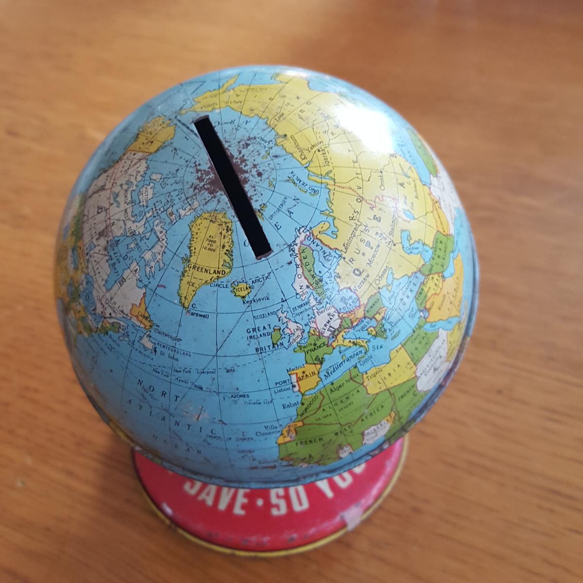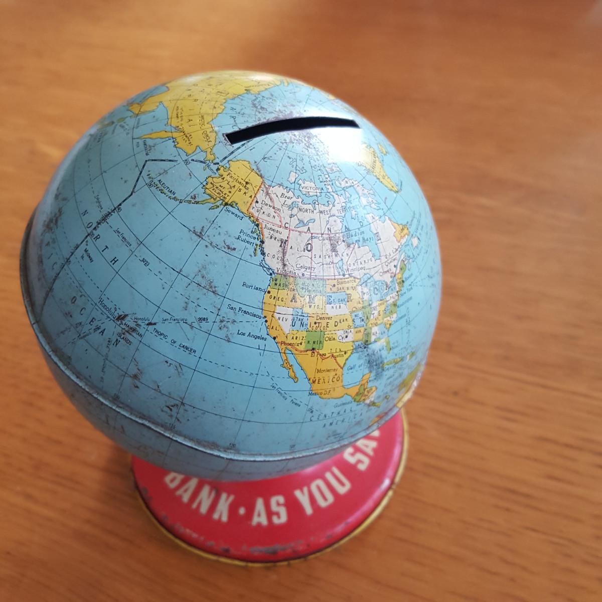 Vintage Metal World Globe Bank