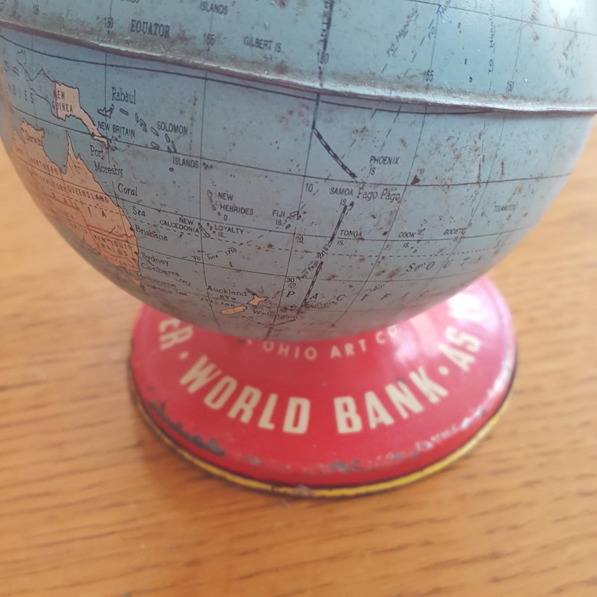 This auction lot is for a Vintage Metal World Globe Bank. This nifty bank manufactured by the Ohio Art Company was on the shelves of many youngsters of the 1950s. This globe is is good shape with the note that there is a very small indention just above Australia. Stands about 4.5-inches tall.