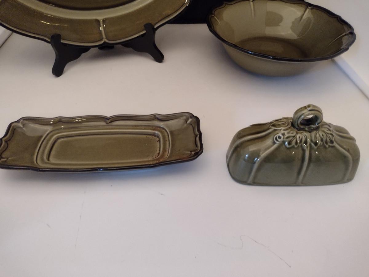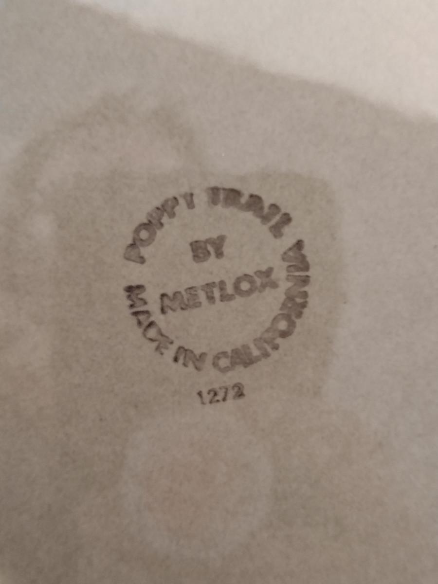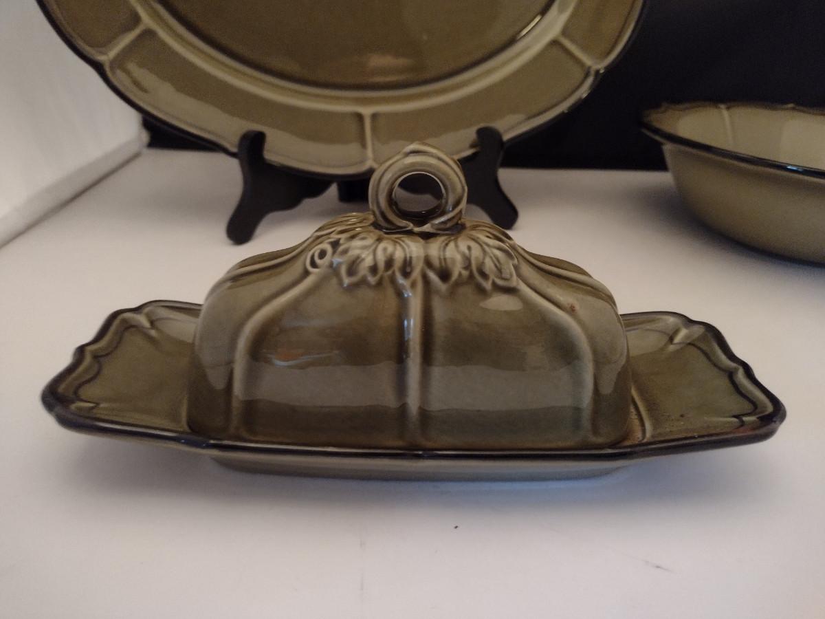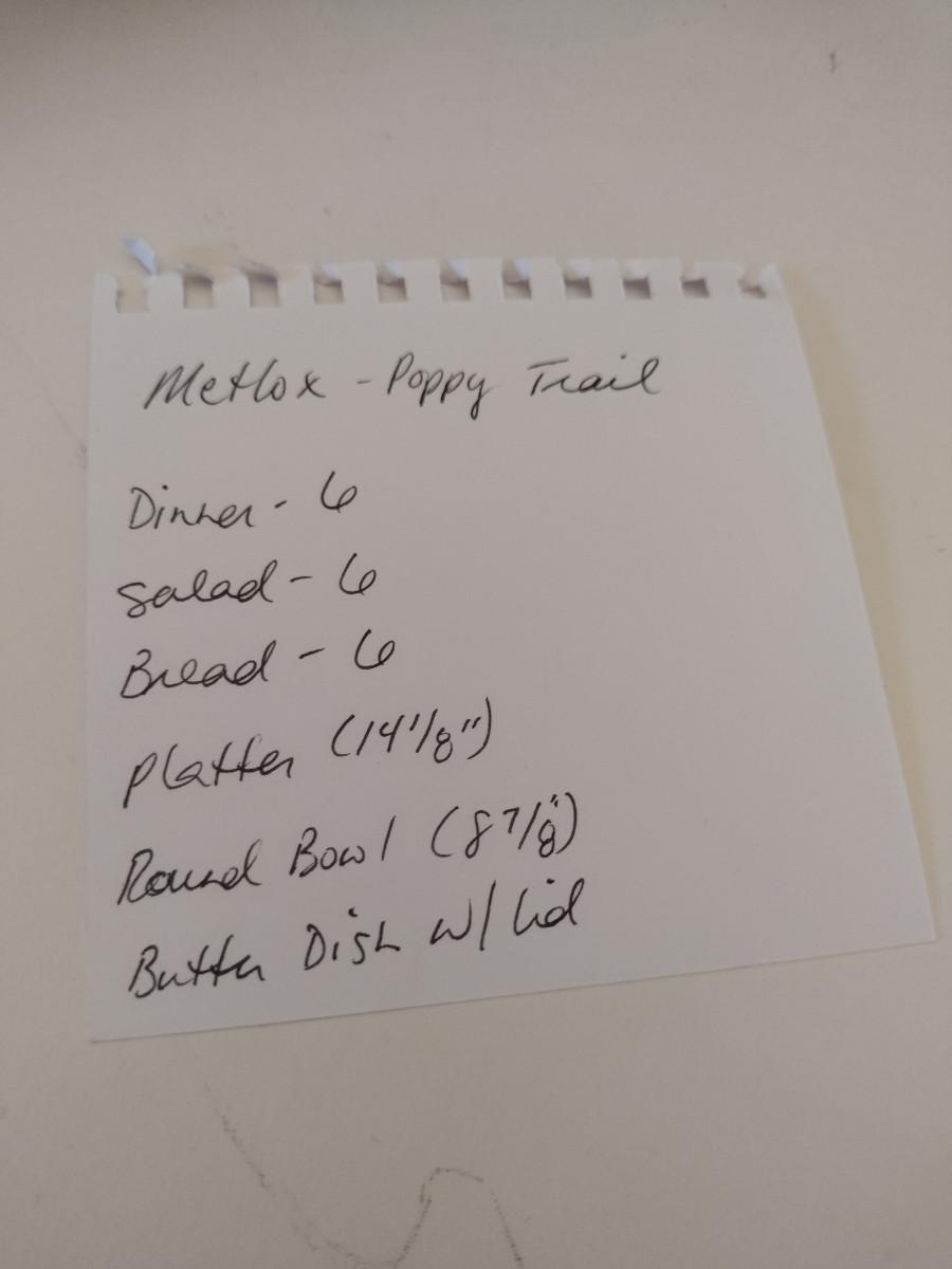 Metlox Dinner Ware- Poppy Trail Pattern- Approx 21 Pieces. Set includes: Dinner plate- 6, Salad plate- 6, Bread/Dessert plate- 6, Platter (14 1/8")- 1, Round bowl (8 7/8")- 1, Covered butter dish- 1. Items appear to be in good, but used condition- please expect occasional chip.