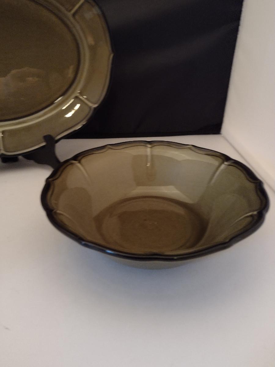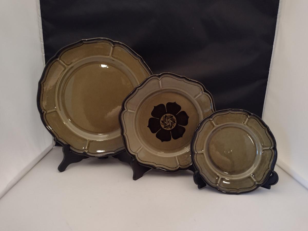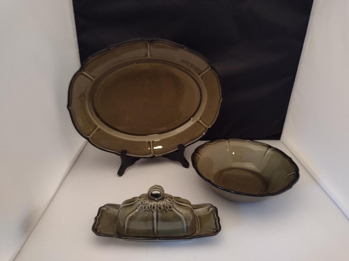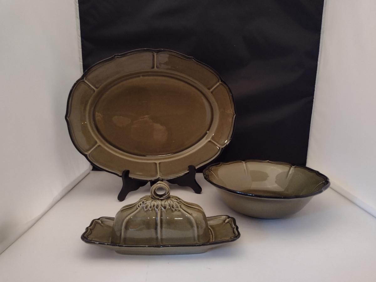Metlox Dinner Ware- Poppy Trail Pattern- Approx 21 Pieces. Set includes: Dinner plate- 6, Salad plate- 6, Bread/Dessert plate- 6, Platter (14 1/8")- 1, Round bowl (8 7/8")- 1, Covered butter dish- 1. Items appear to be in good, but used condition- please expect occasional chip.