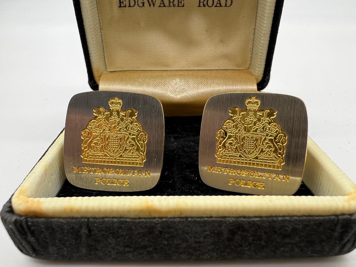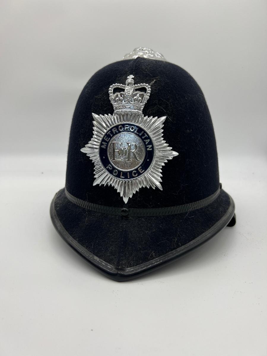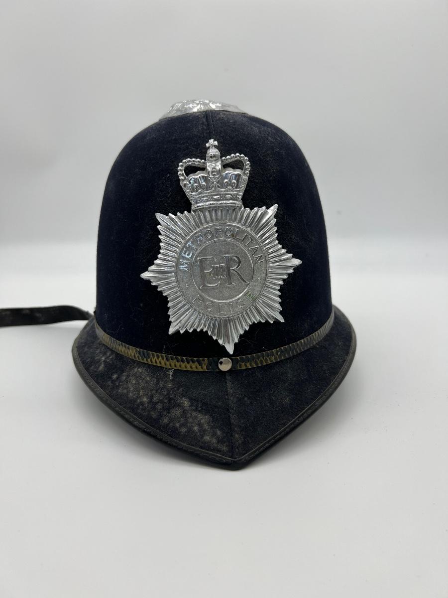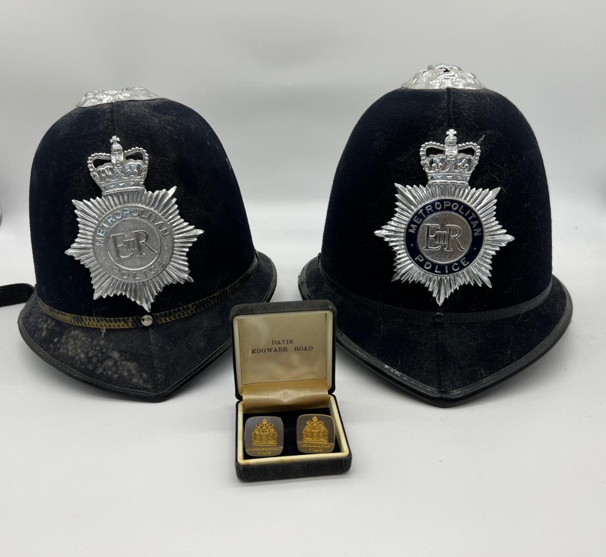 Metropolitan police hats measure 8 inches tall approximately 10 inches wide with a pair of Metropolitan Police Cufflinks Note the hats are decoration only, and will need to be cleaned, see pictures.
