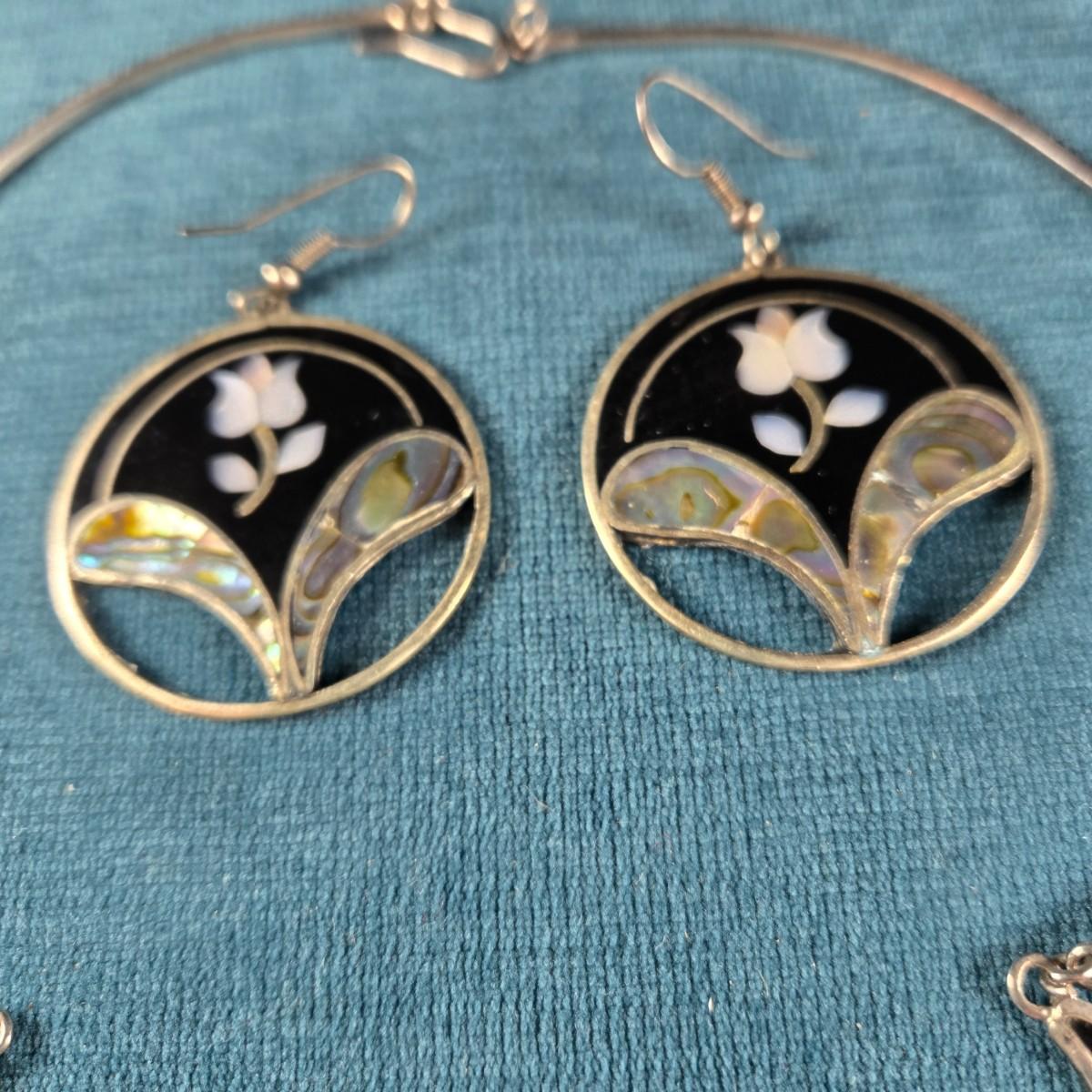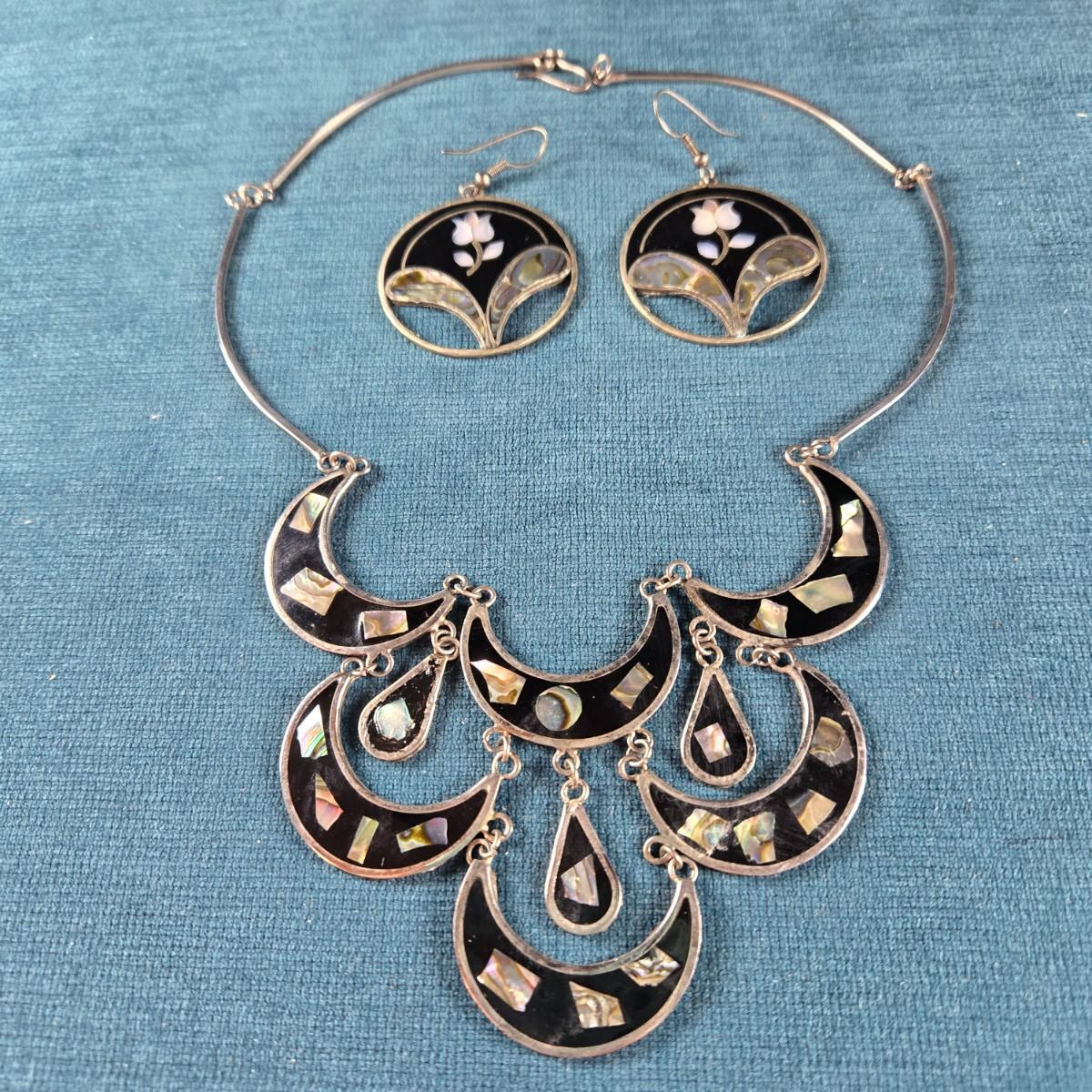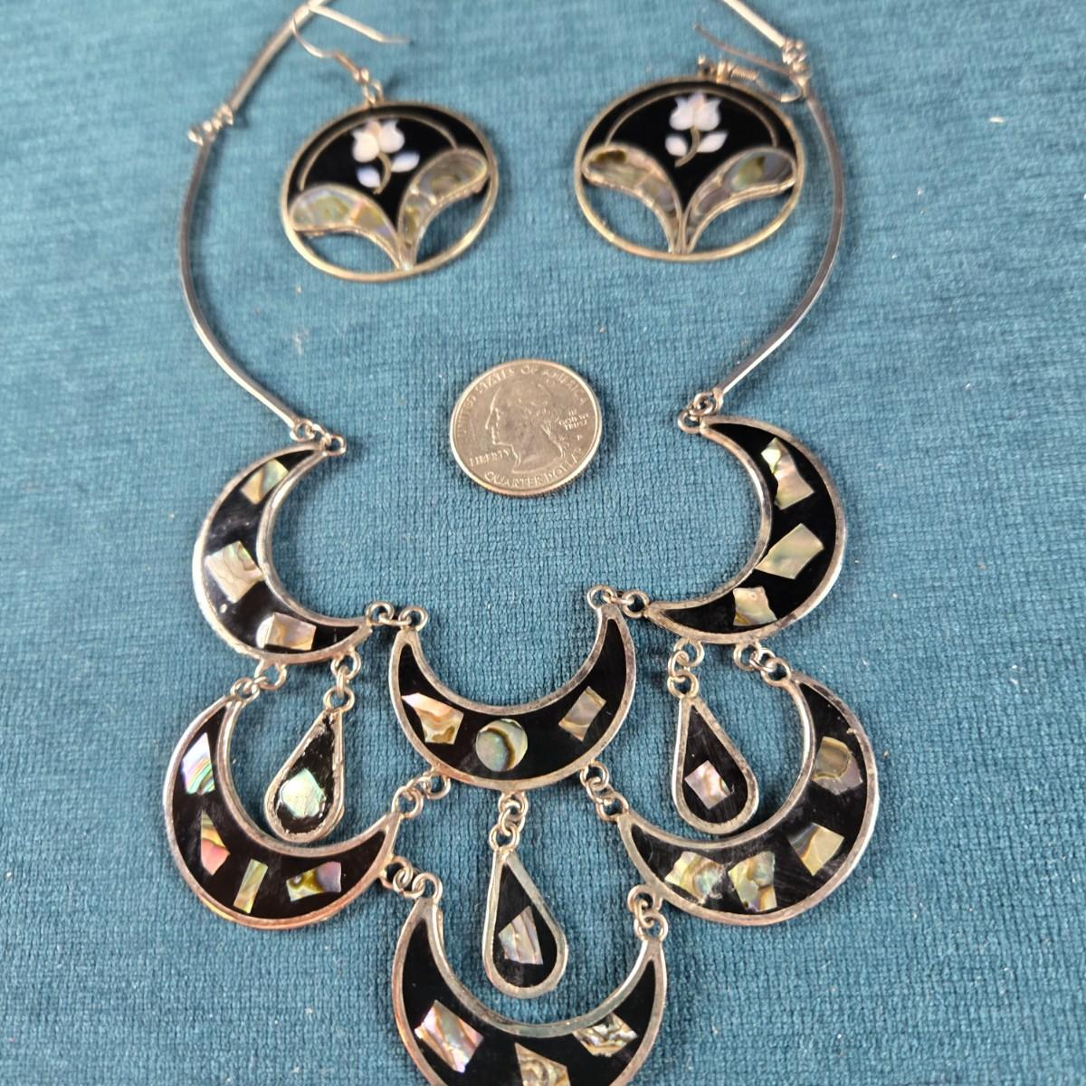 This auction lot is for a Vintage Mexican Alpaca Silver Necklace and Earrings Set. This is a beautiful Vintage Mexican Alpaca Silver Necklace and Earrings inlaid with Abalone Shell. It is about 8-inches long and in very good shape.