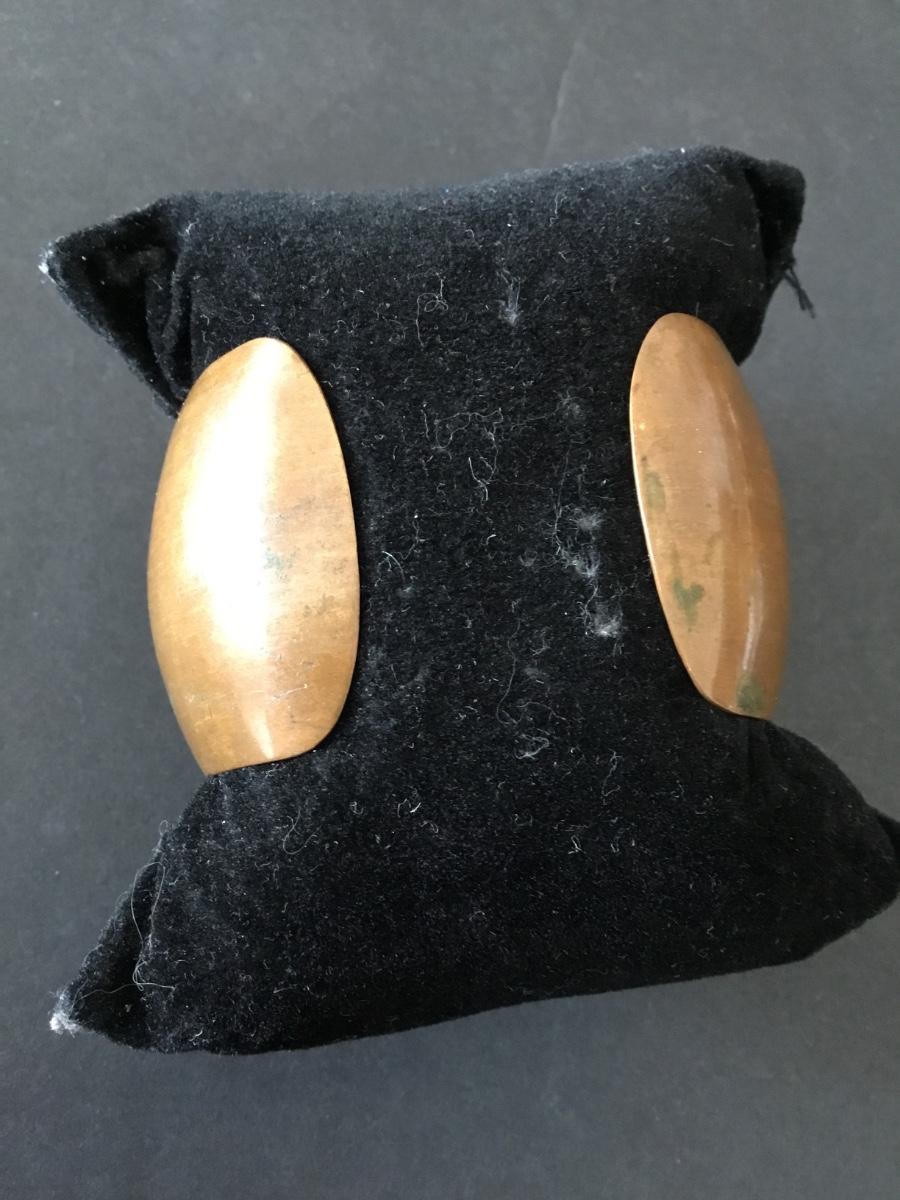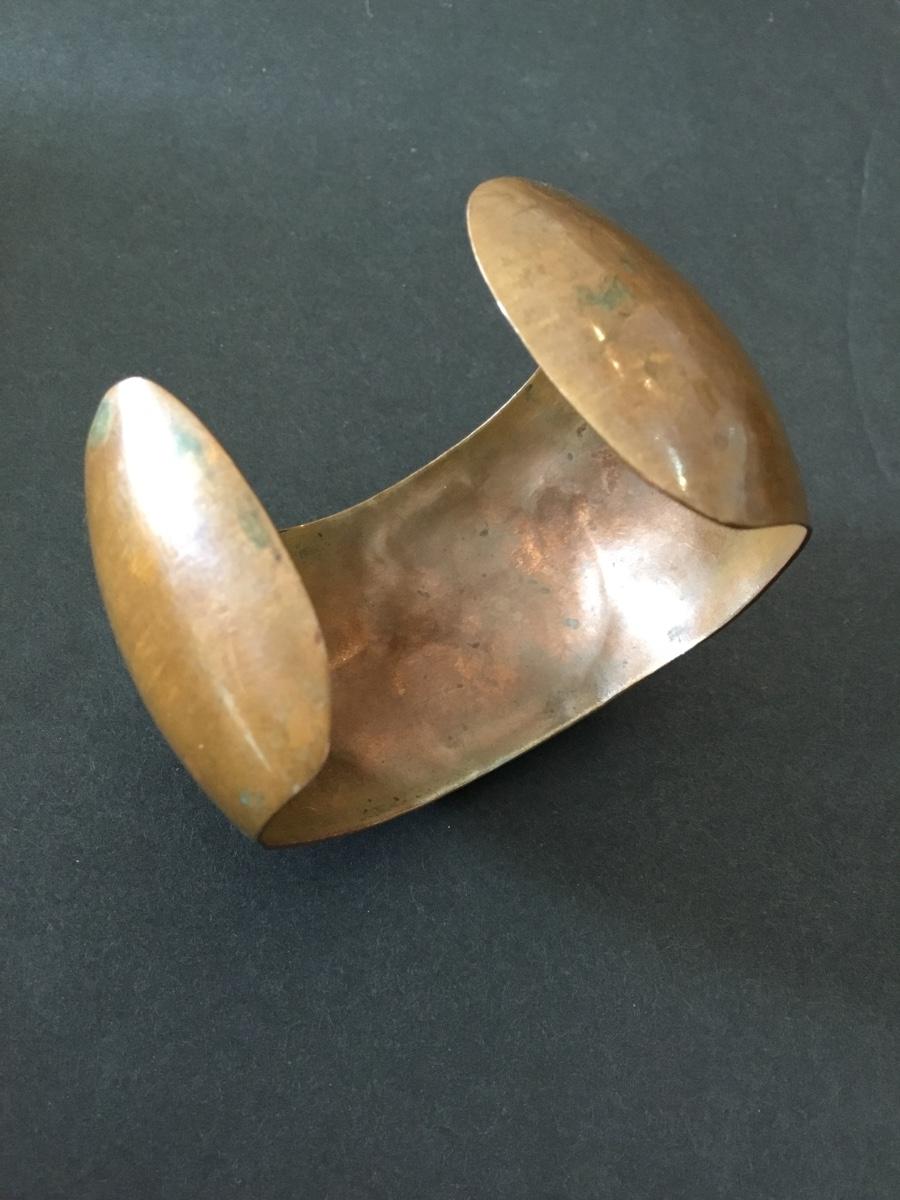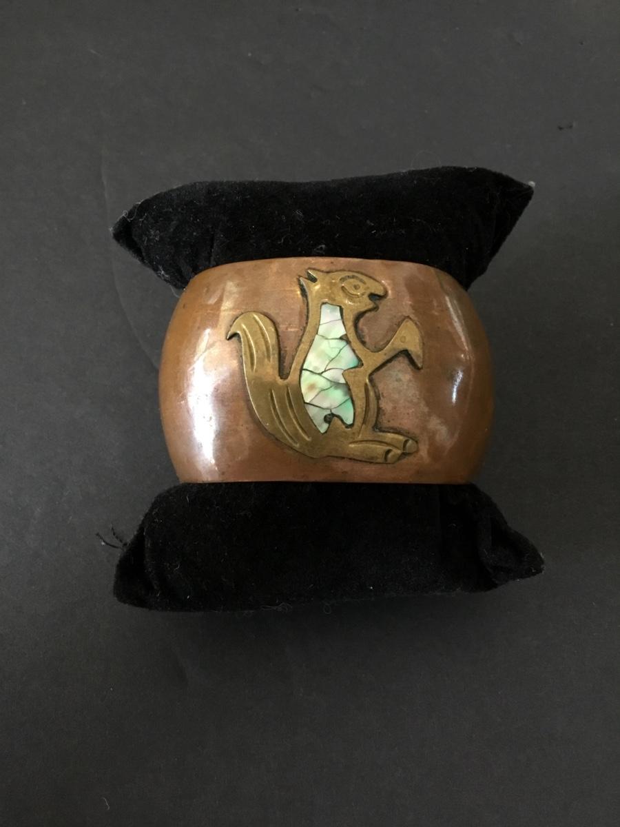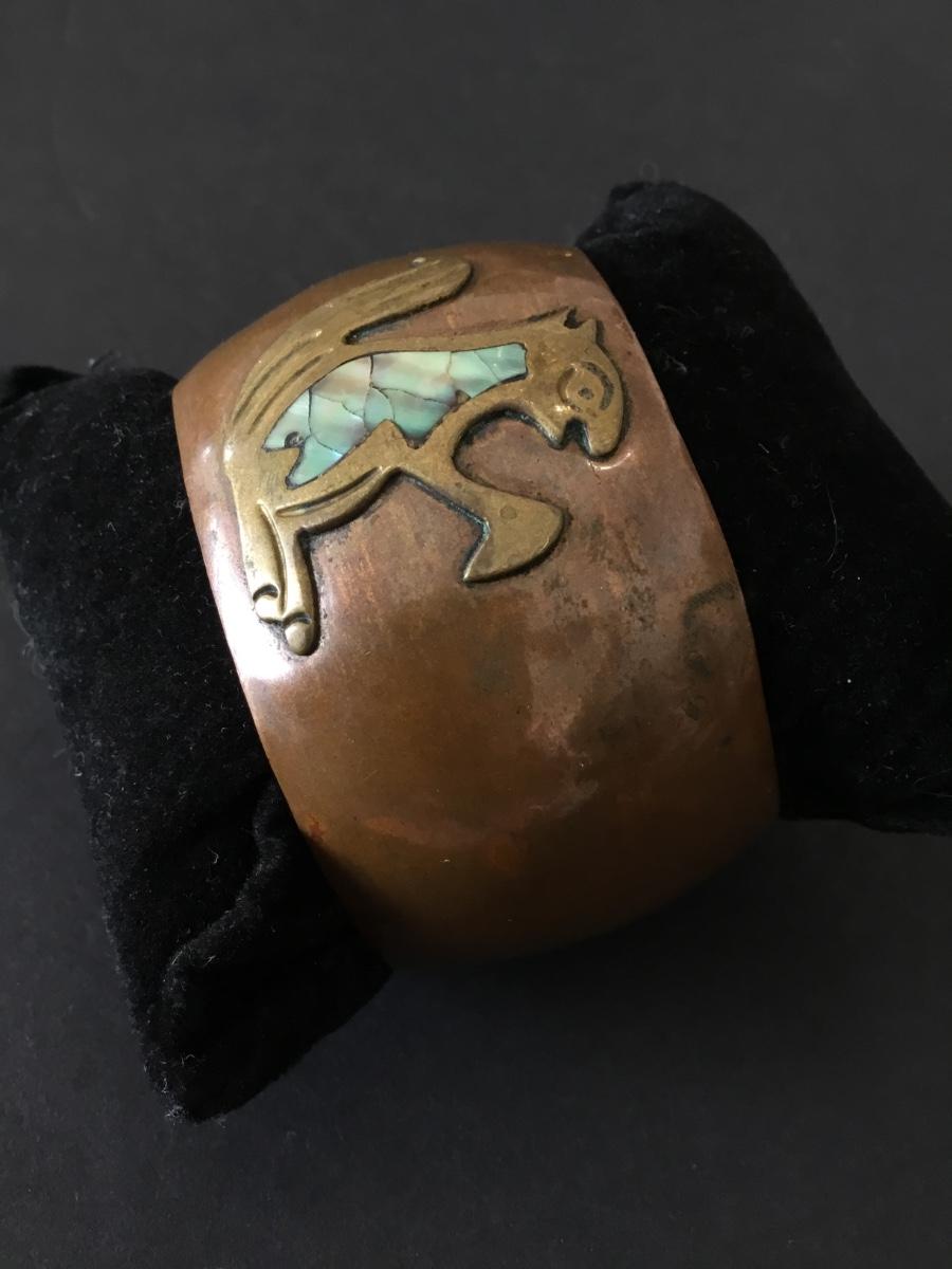 Vintage, Mexican bronze cuff, abalone, shell, inlay, copper, and brass cuff