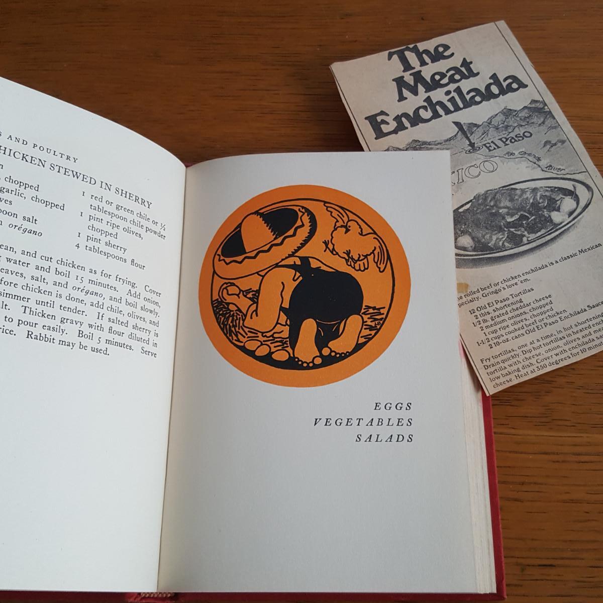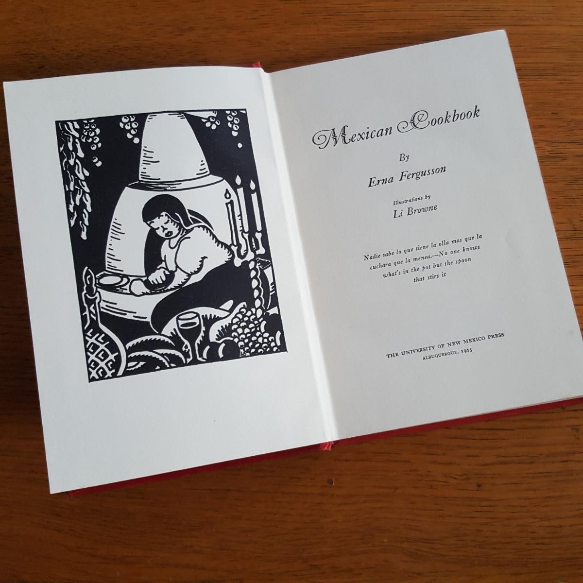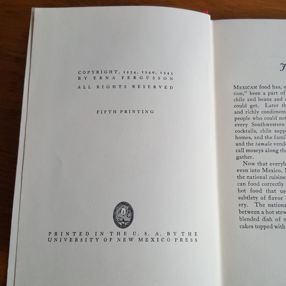 This auction lot is for a fun Vintage Mexican Cookbook. This small hardbound book sports 120 pages of lore and recipes related to authentic true Mexican cookery. Filled with nifty art designs and the secret to a tasty Tamale Pie. Printed by the University of New Mexico Press in 1945.