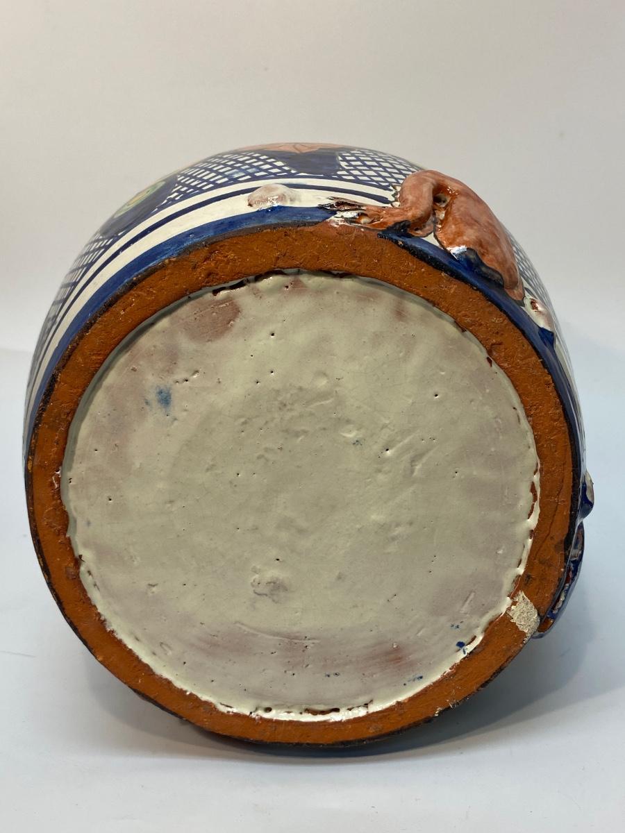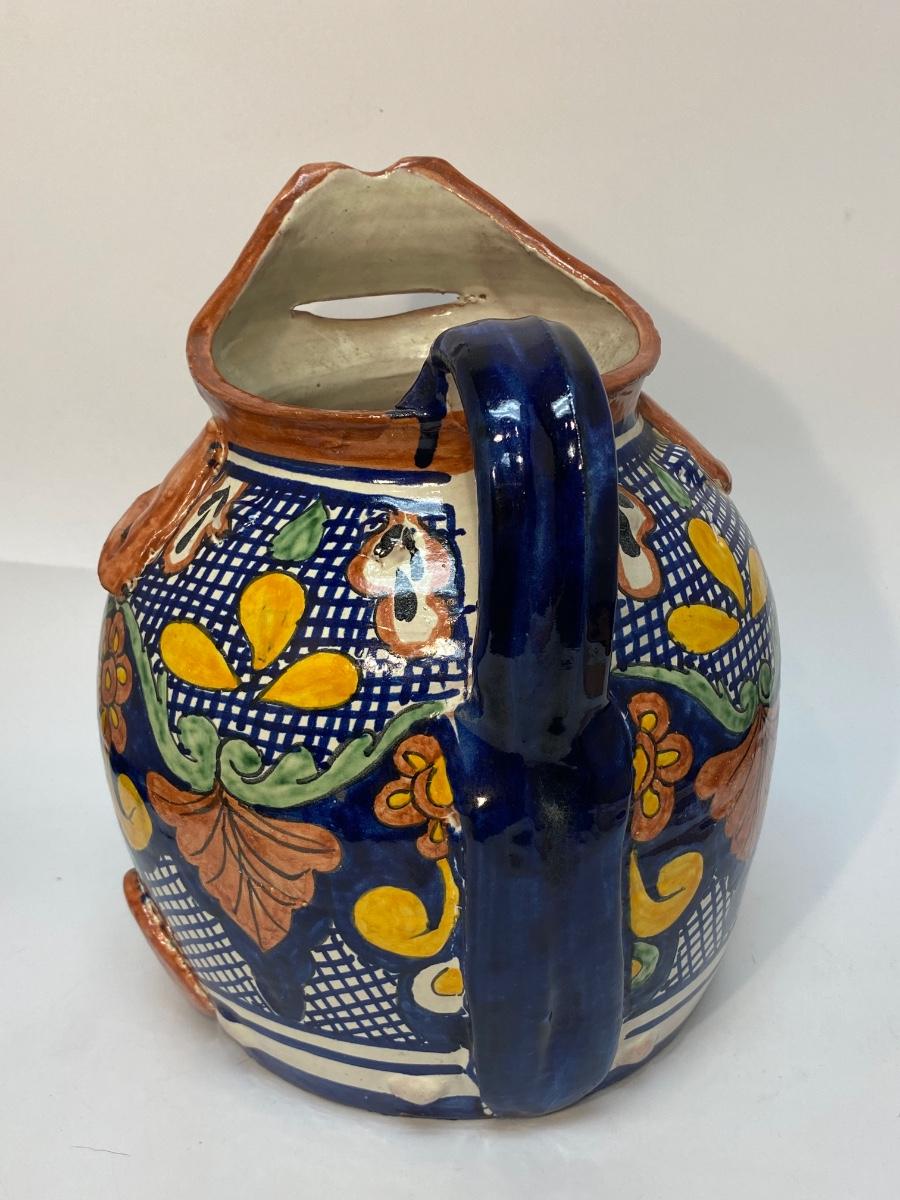 Vintage Mexican folk art pottery figural pitcher. Shaped after a frog or toad. Hand painted and looks to be hand thrown pottery. In good vintage condition. Seems to be unsigned except there is some etched lines on the bottom that can't be made out. About 11" tall, displays great.