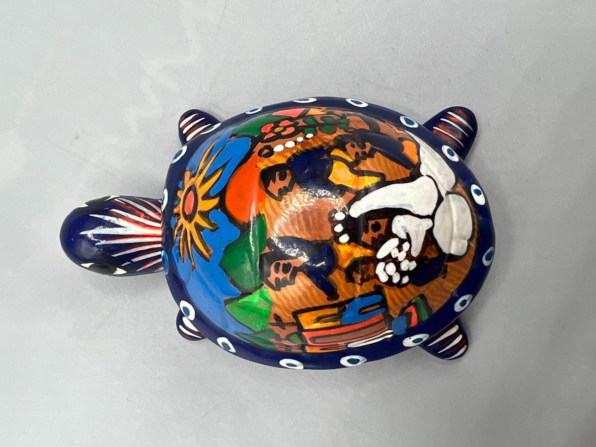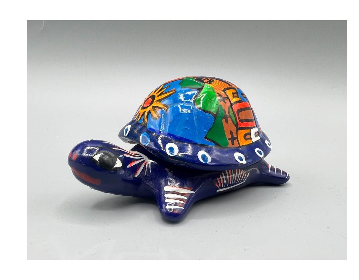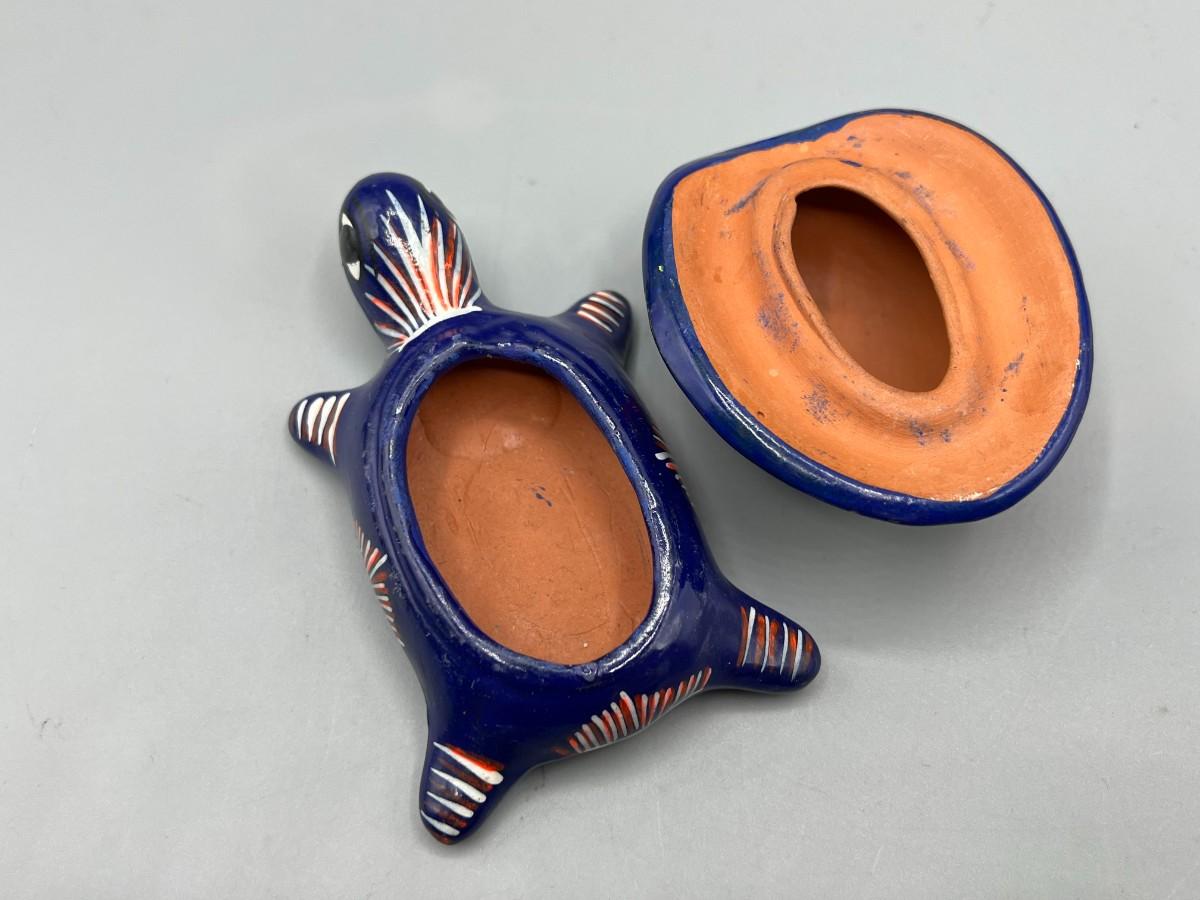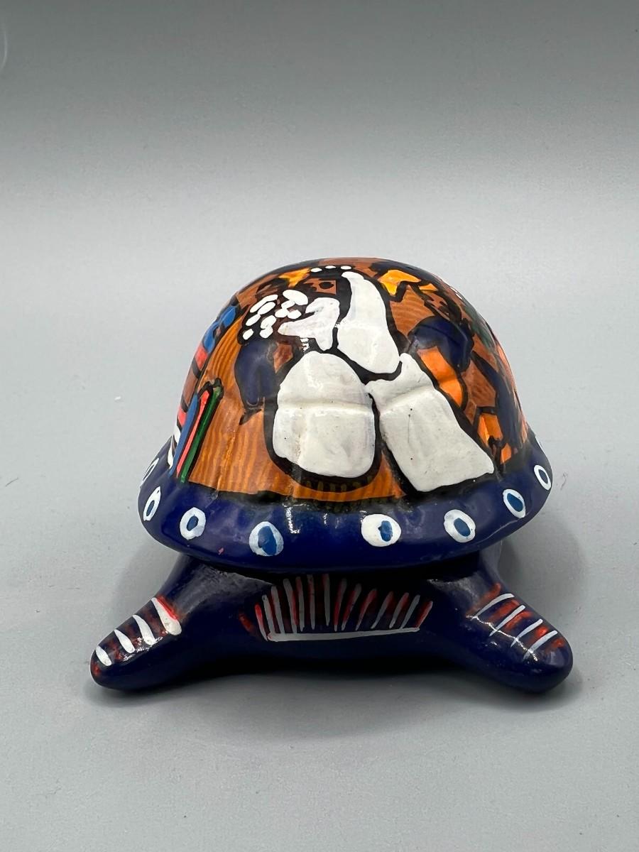 Vintage Mexican Folk Art Handmade Ceramic Pottery of Turtle Depicting Wedding Ceremony, there is no significant damage to the pottery and is in good displayable condition. Check pictures for more details and for sizing.