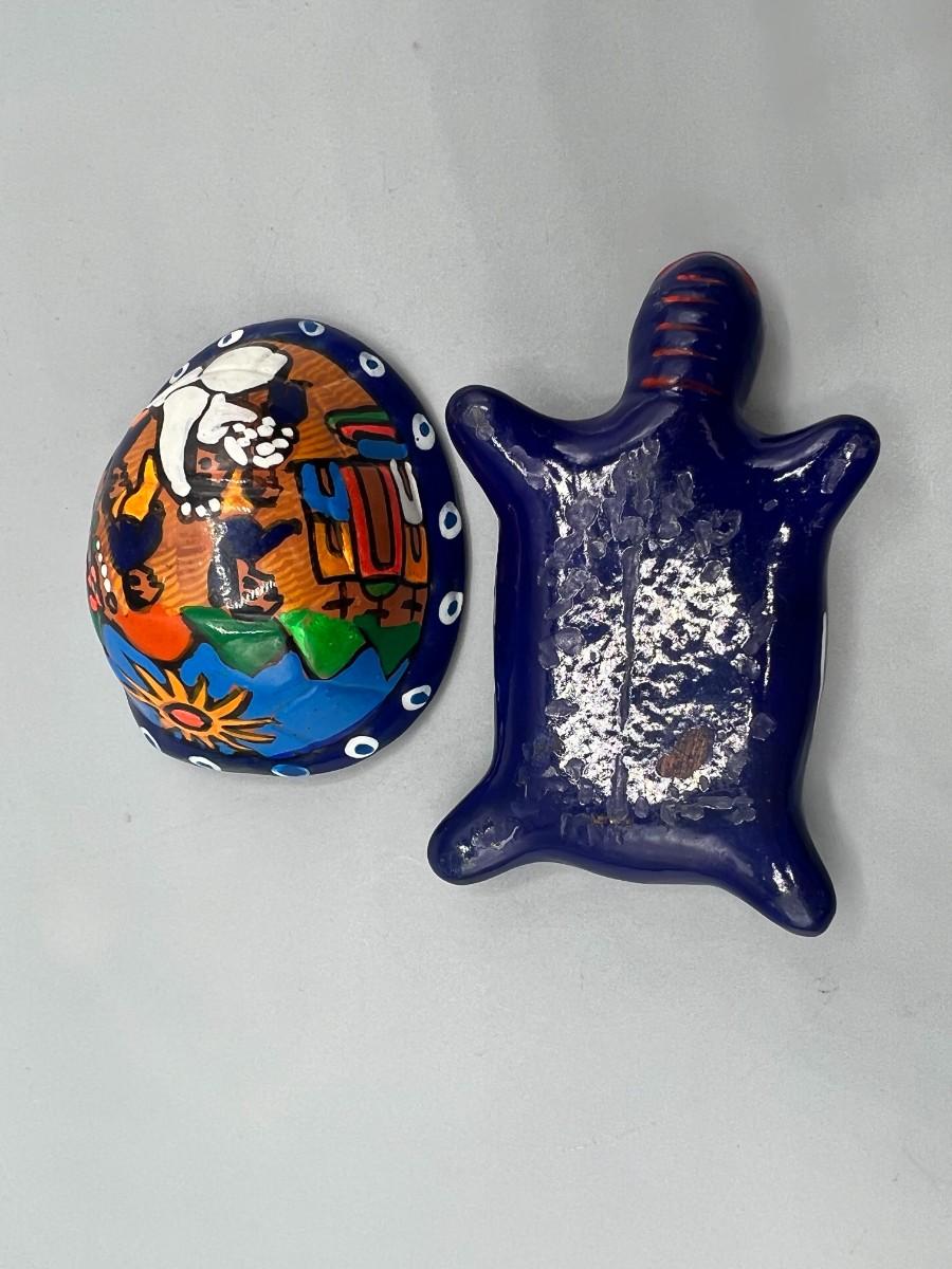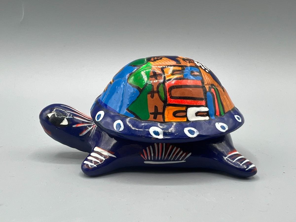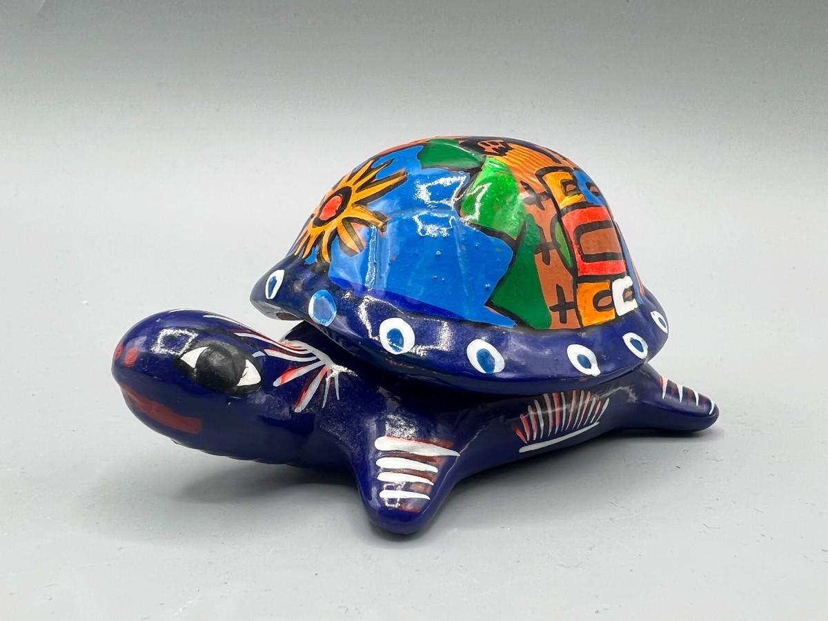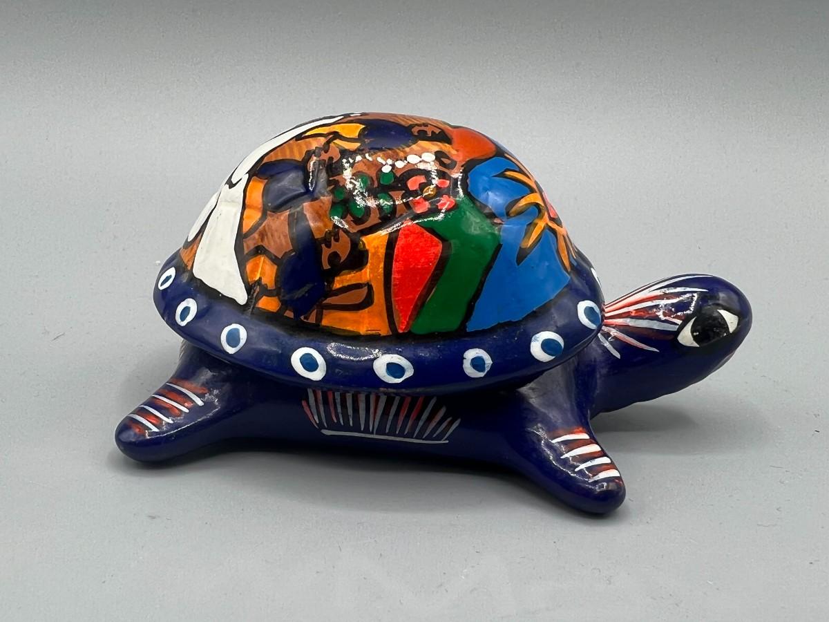 Vintage Mexican Folk Art Handmade Ceramic Pottery of Turtle Depicting Wedding Ceremony, there is no significant damage to the pottery and is in good displayable condition. Check pictures for more details and for sizing.
