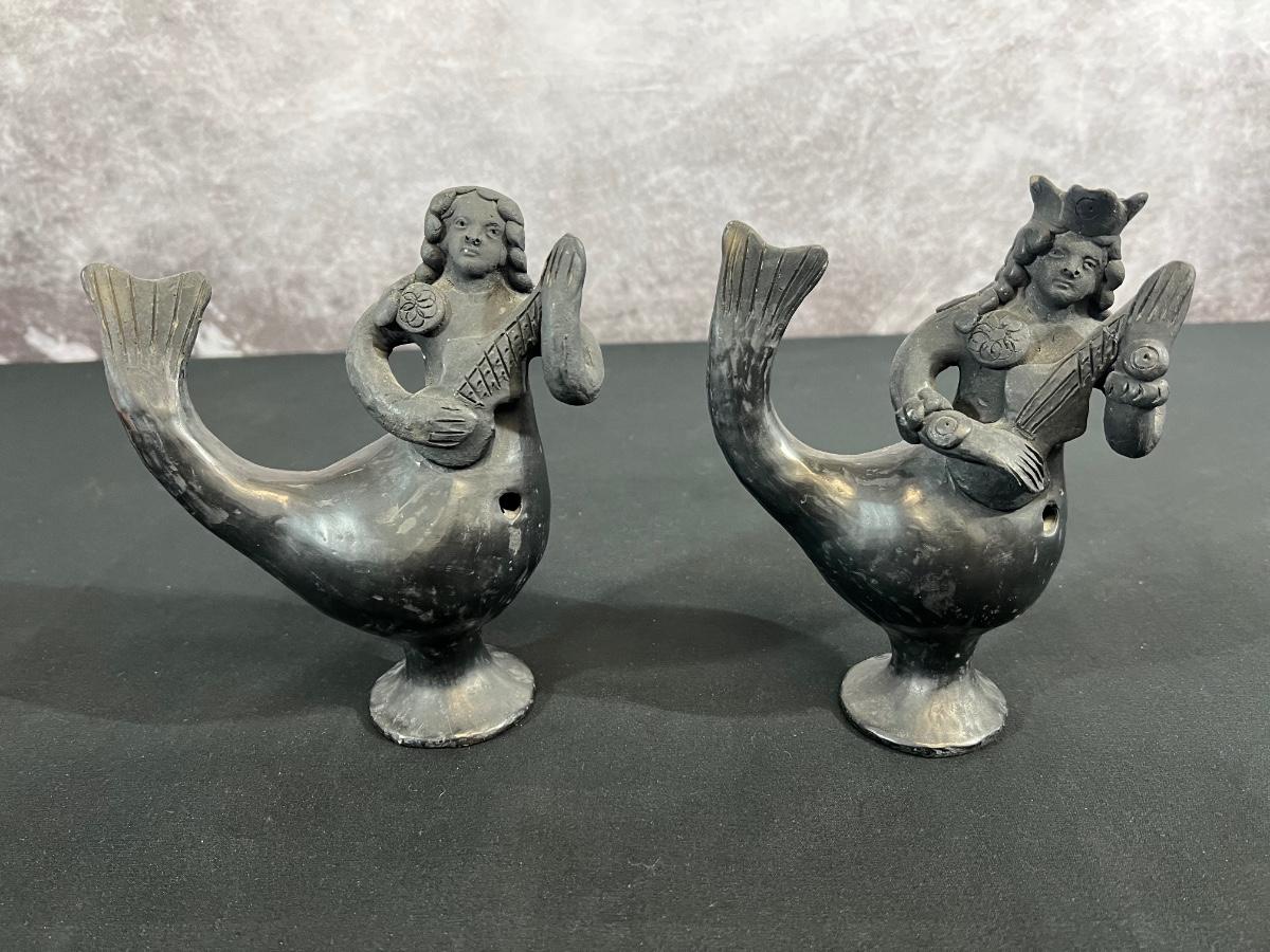Set of Vintage Mexican Folk Art Mermaid and Merman of Coyotepec Oaxaca Pottery Blackware