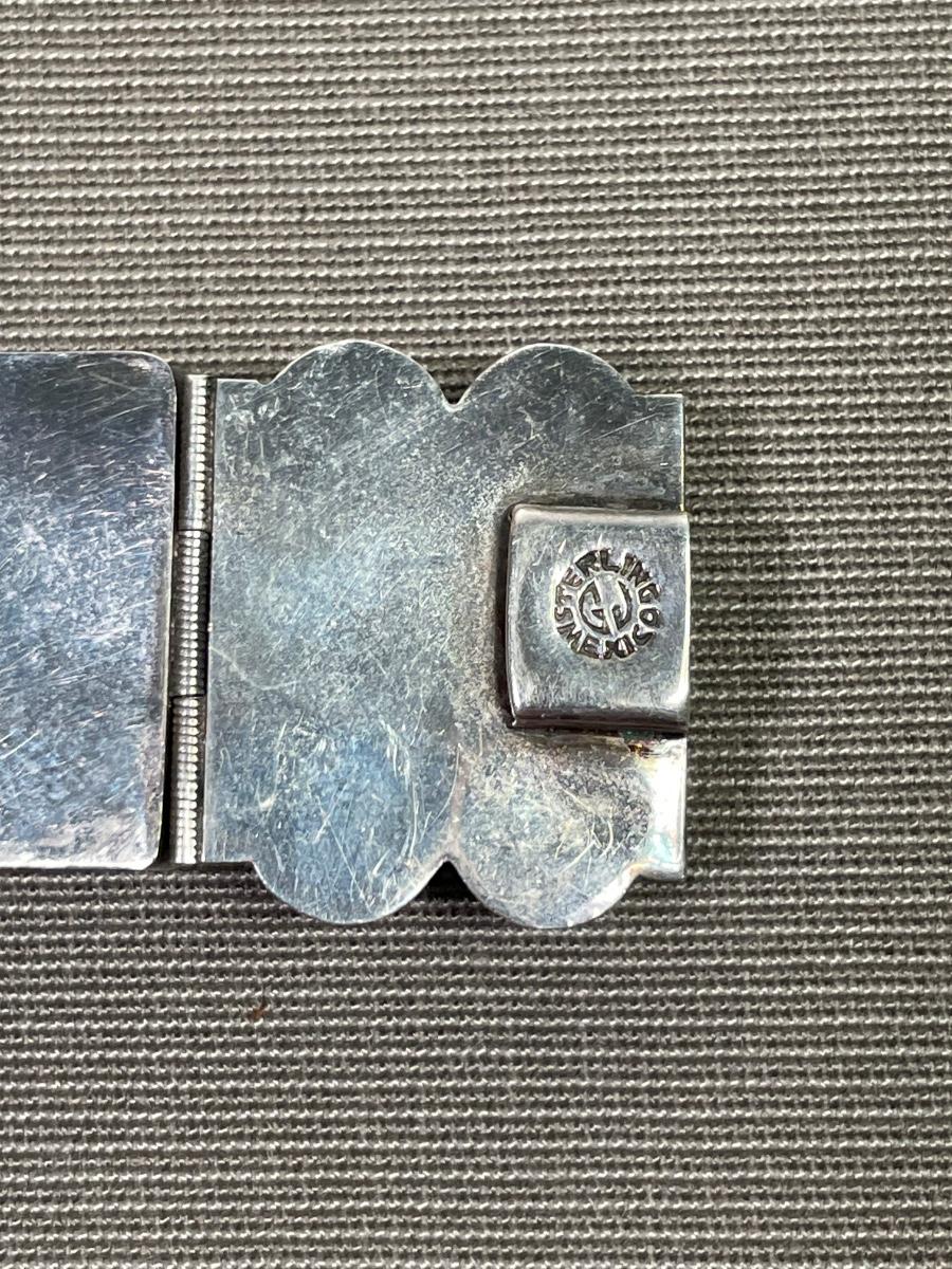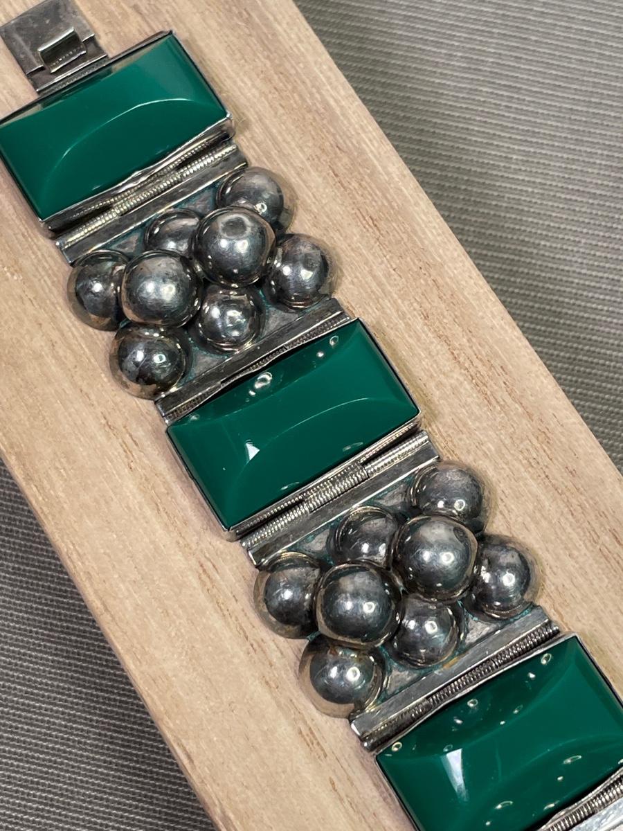 Wonderful bracelet! Great vintage condition. I noticed a little dent in just one sterling dome. Clasp works well. The stones might be green onyx.