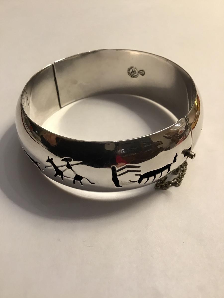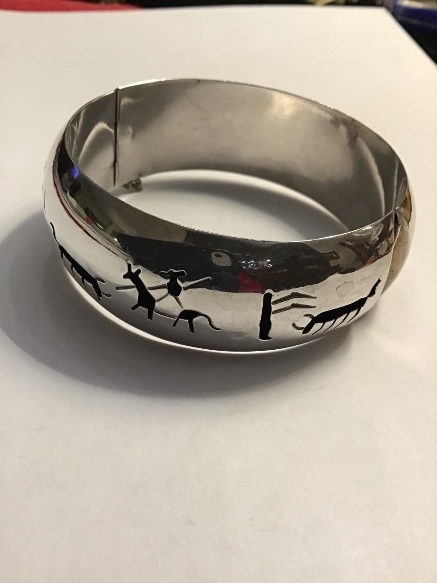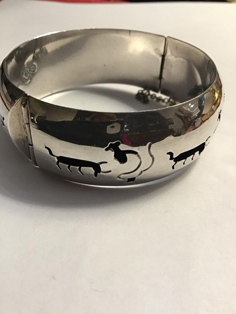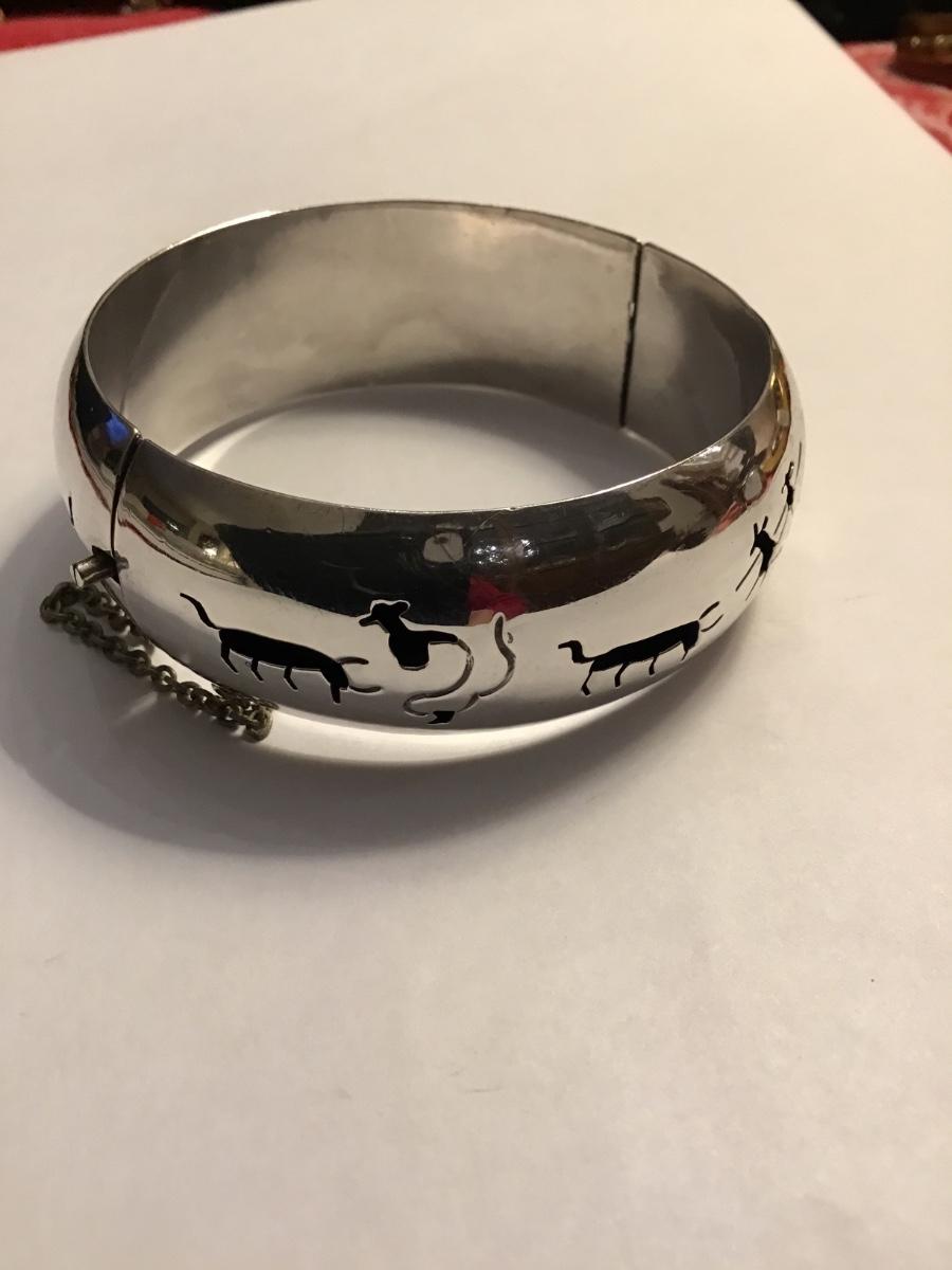 Mexican Sterling Silver bangle bracelet, Taxco, cut work animals figures, safety chain, signed, 2-1/4” dia. from inside x 3/4”, 29.1 grams