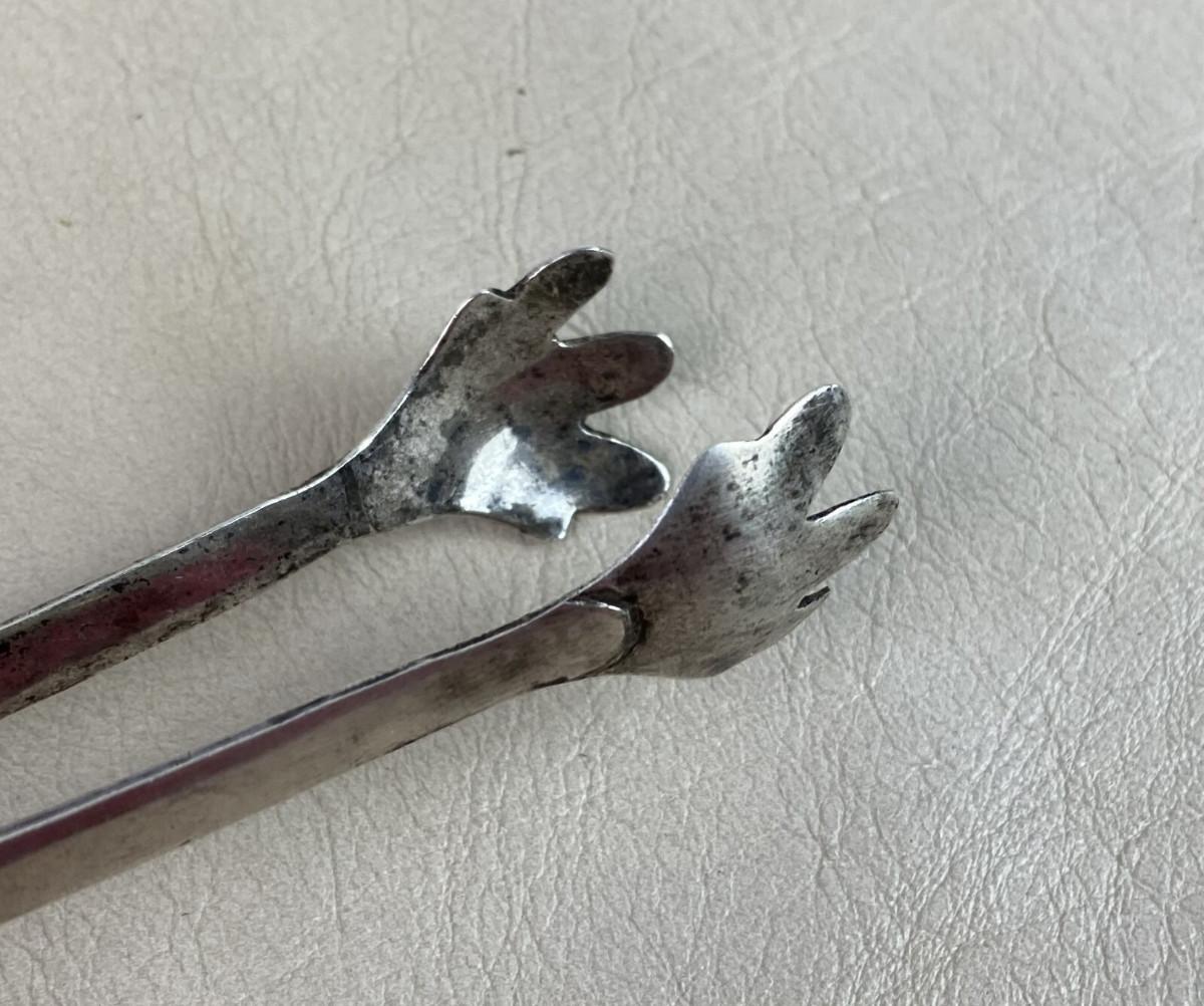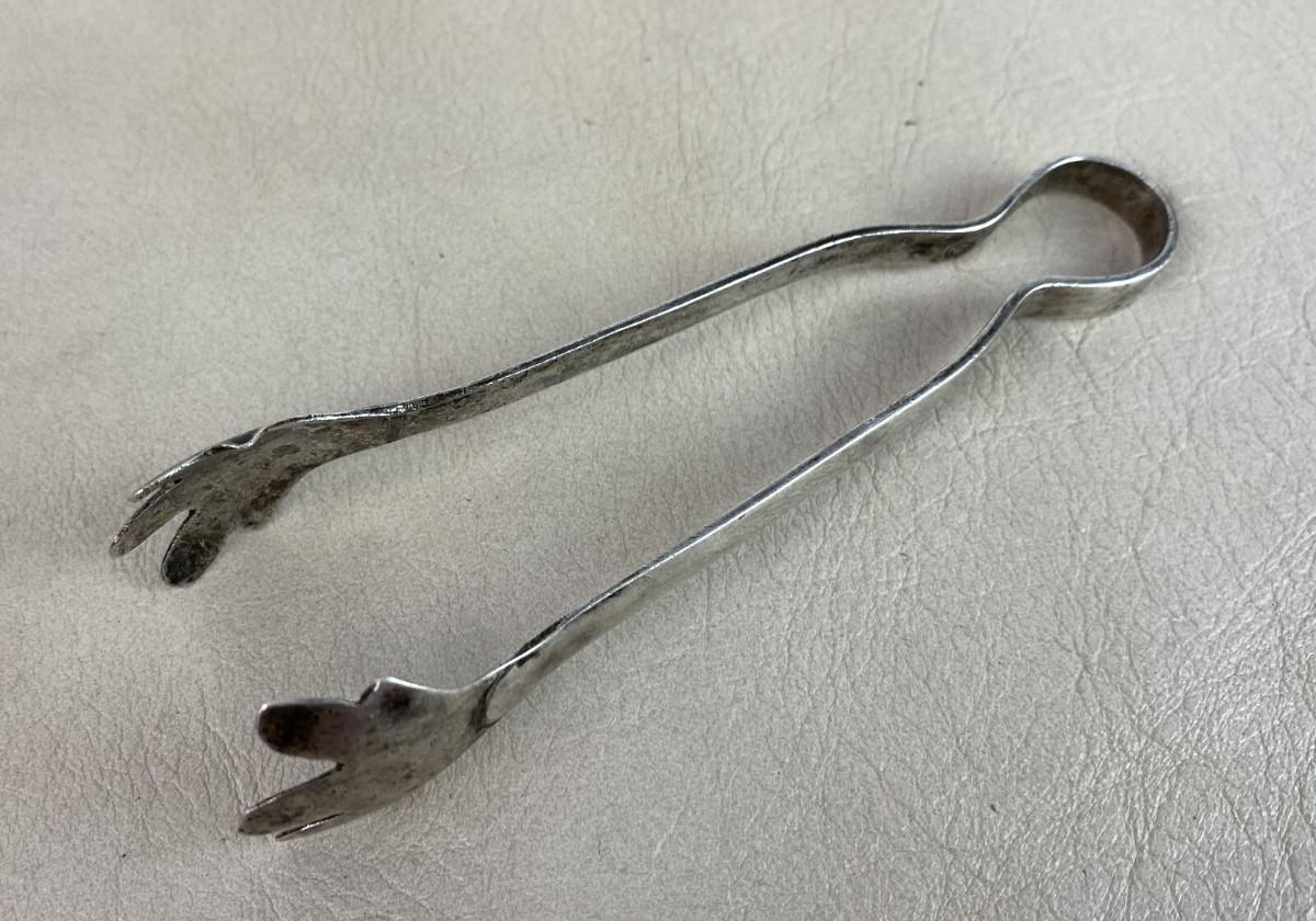 a pair of vintage Sterling silver sugar tongs crafted in Mexico City (Distrito Federal) circa 1940-1960...Hallmarked F. Ramirez...Four inches long...17.6 grams.