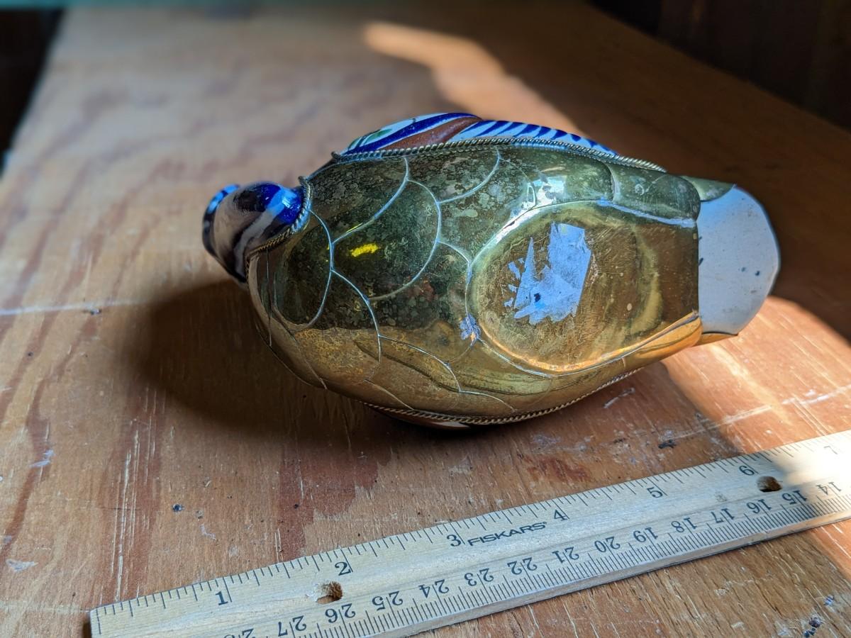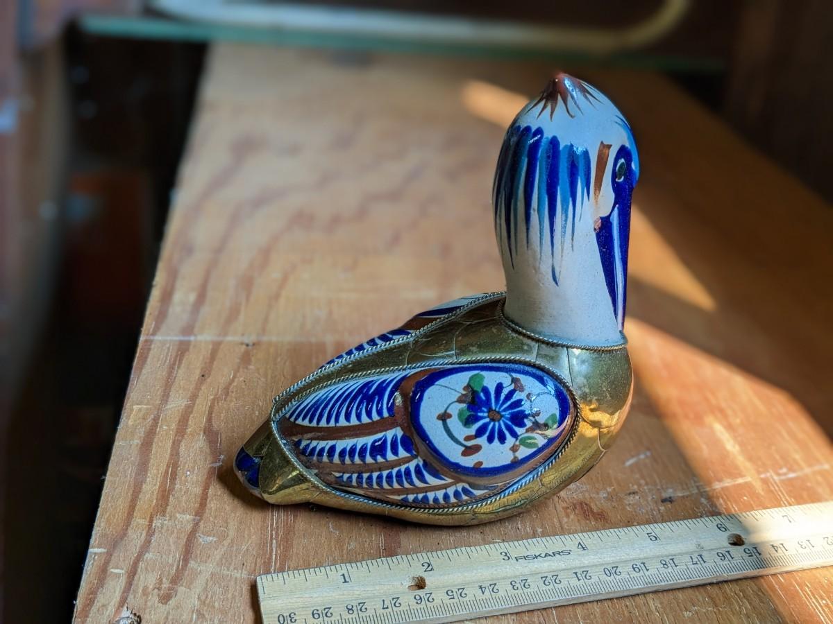 Vintage Mexican Tonala Style Pottery Pelican with Copper Detail